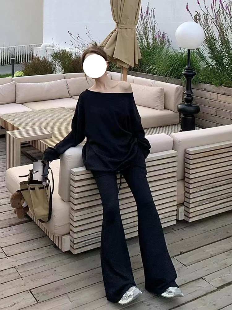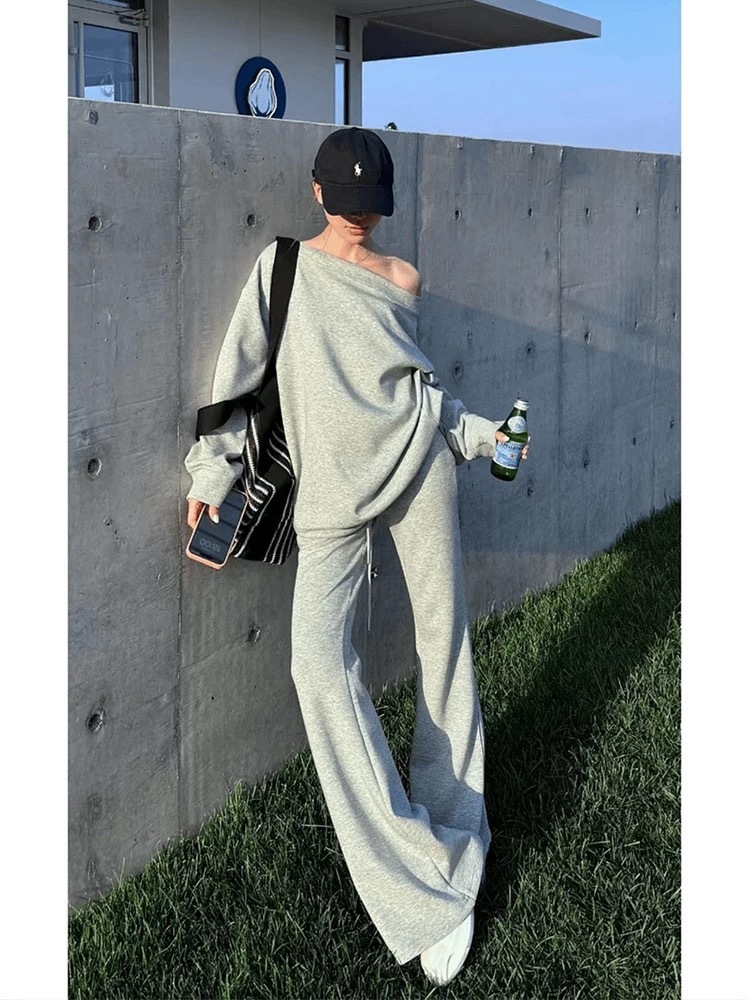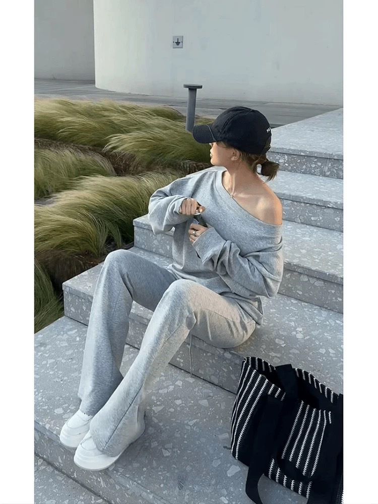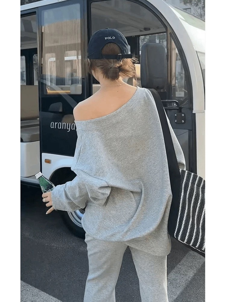 慵懶露肩 棉質休閒套裝(灰/黑)