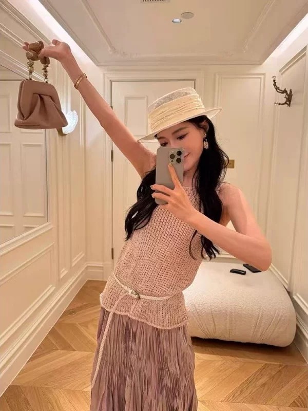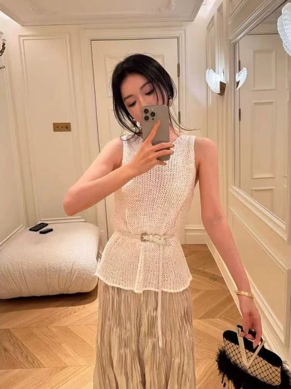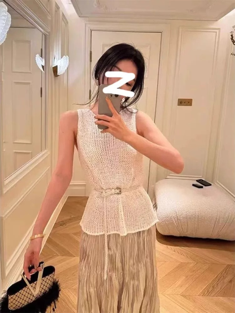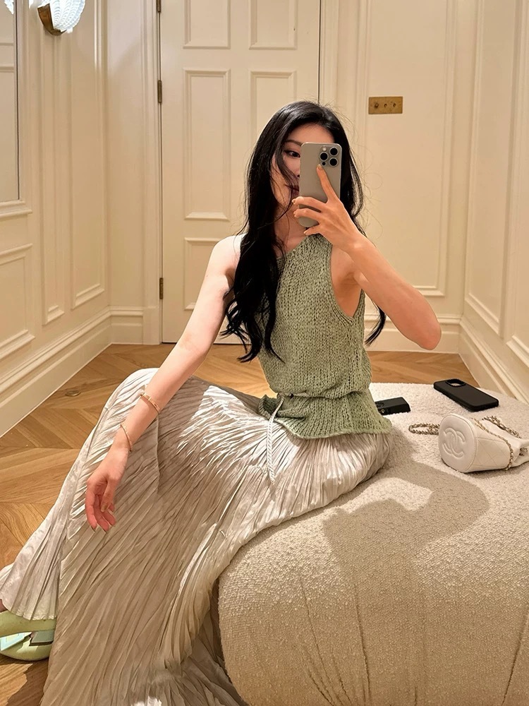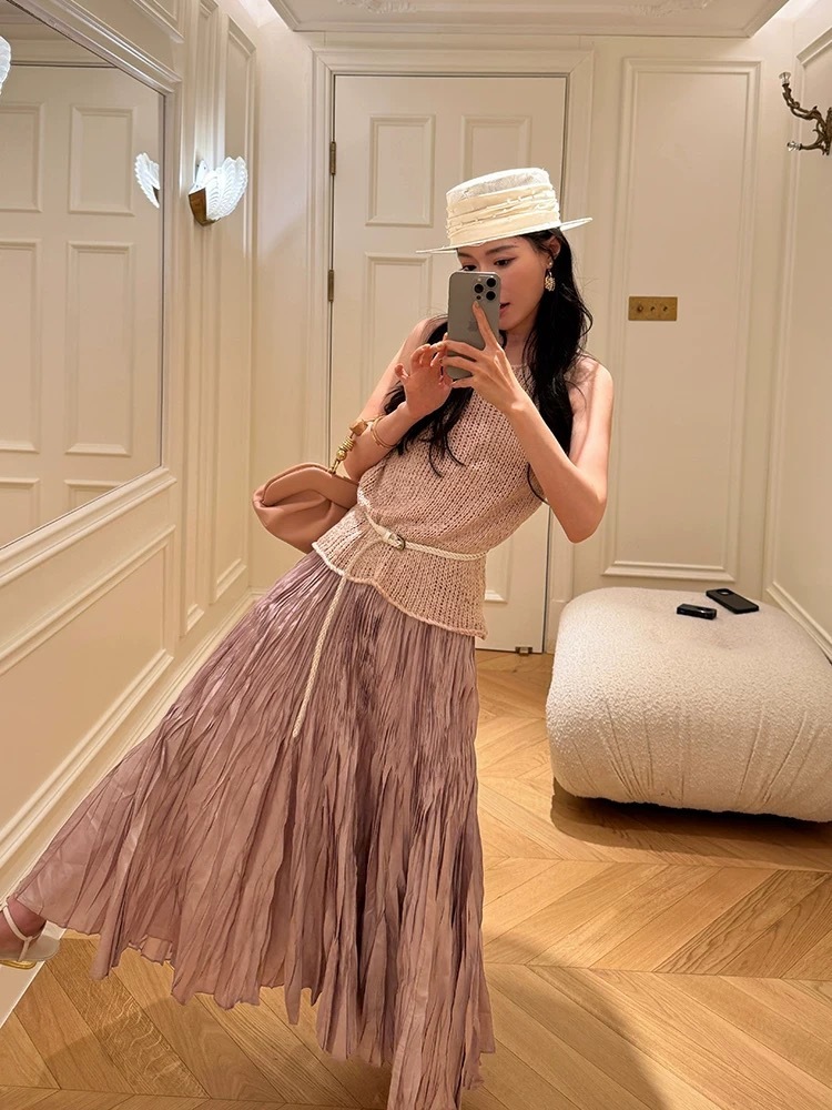 光澤感壓褶長裙+簍空上衣(附腰帶)