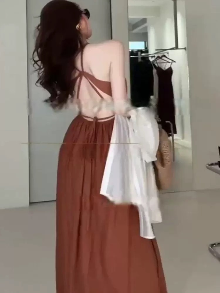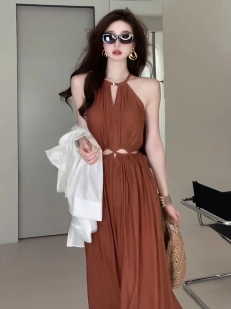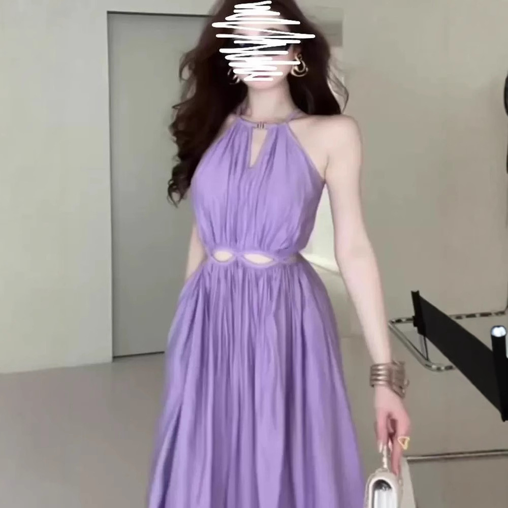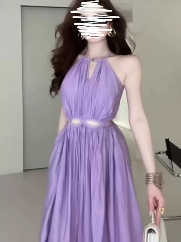 幾何線條露背 度假長洋裝(紫/棕)