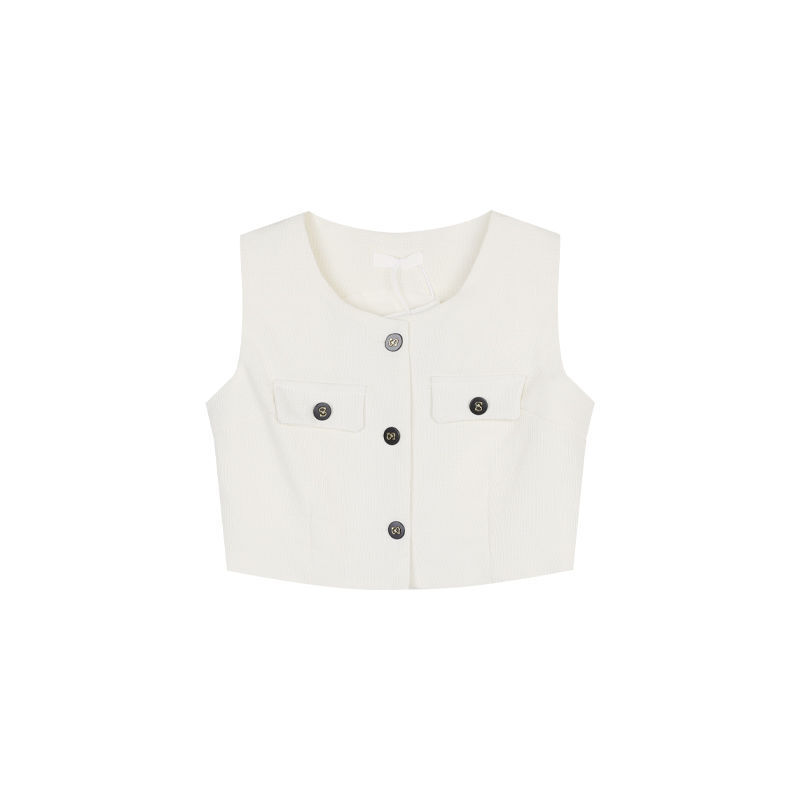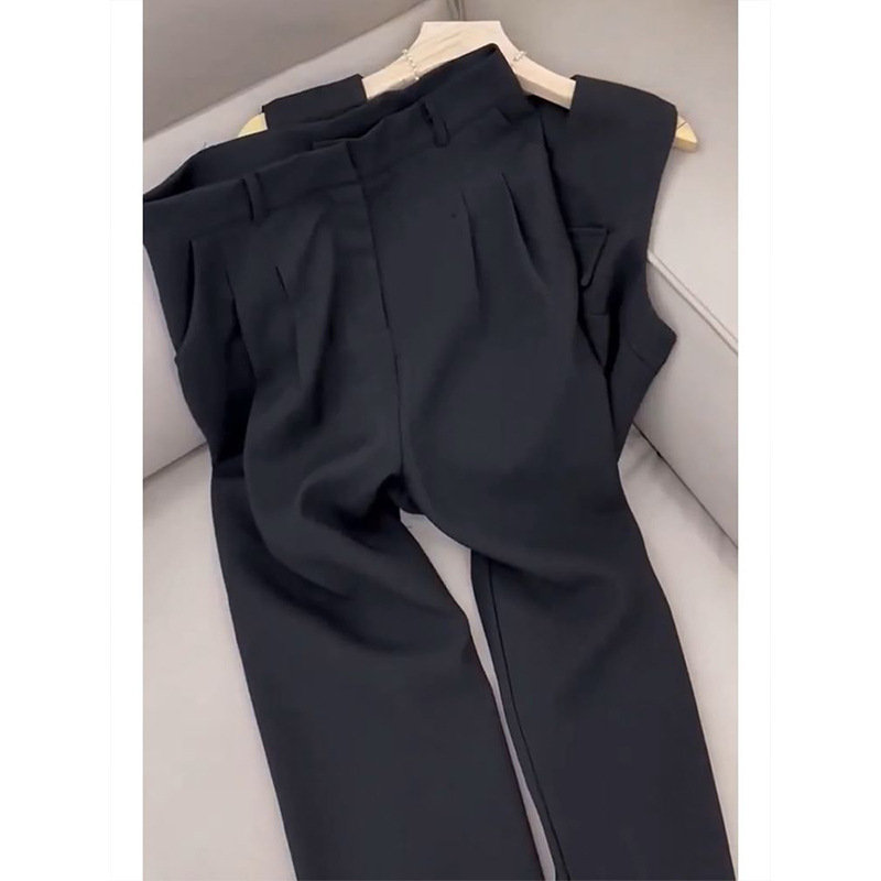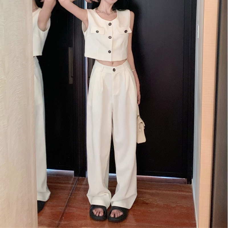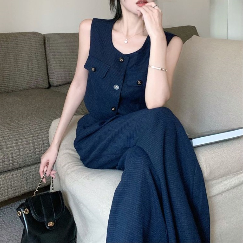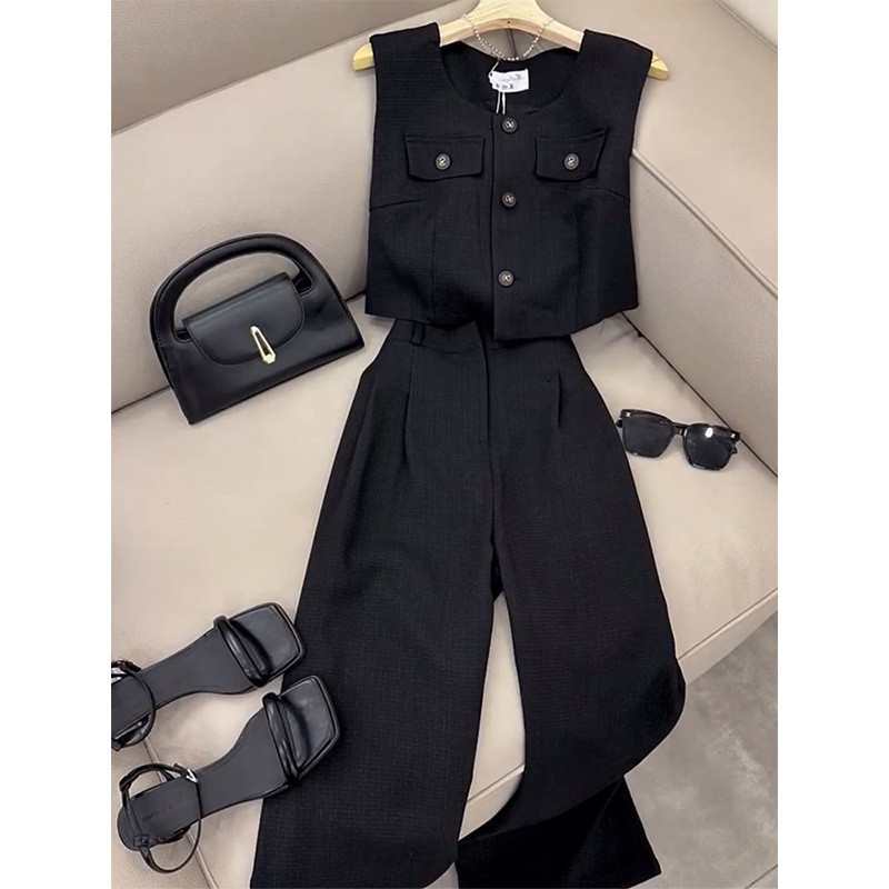 立體格紋布料 排釦無袖長褲套裝(白/黑/藍)