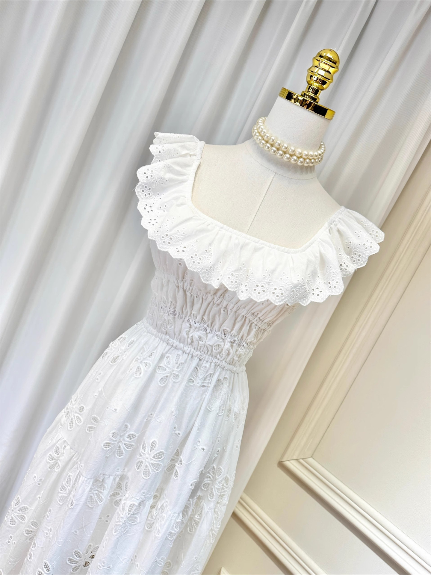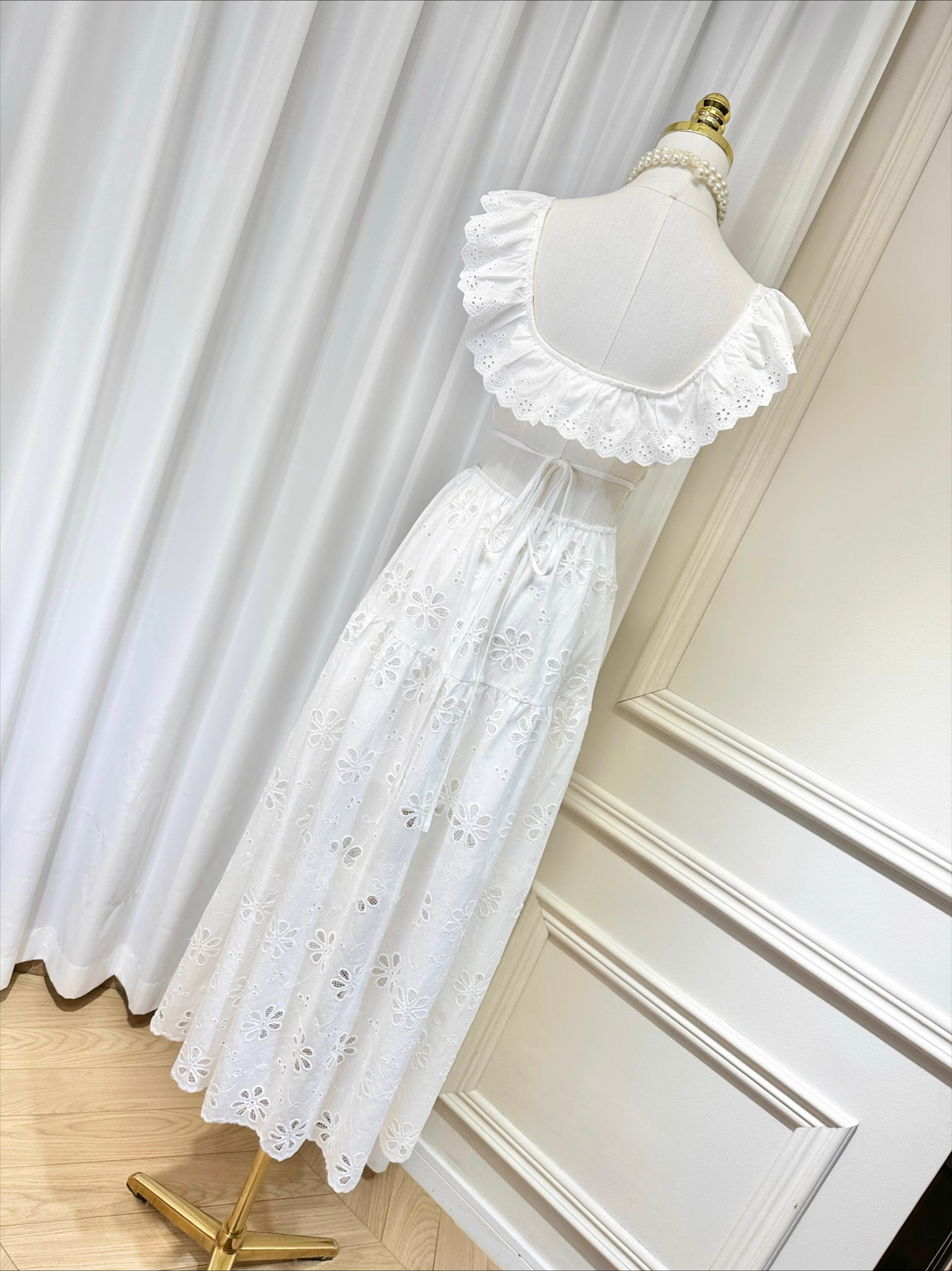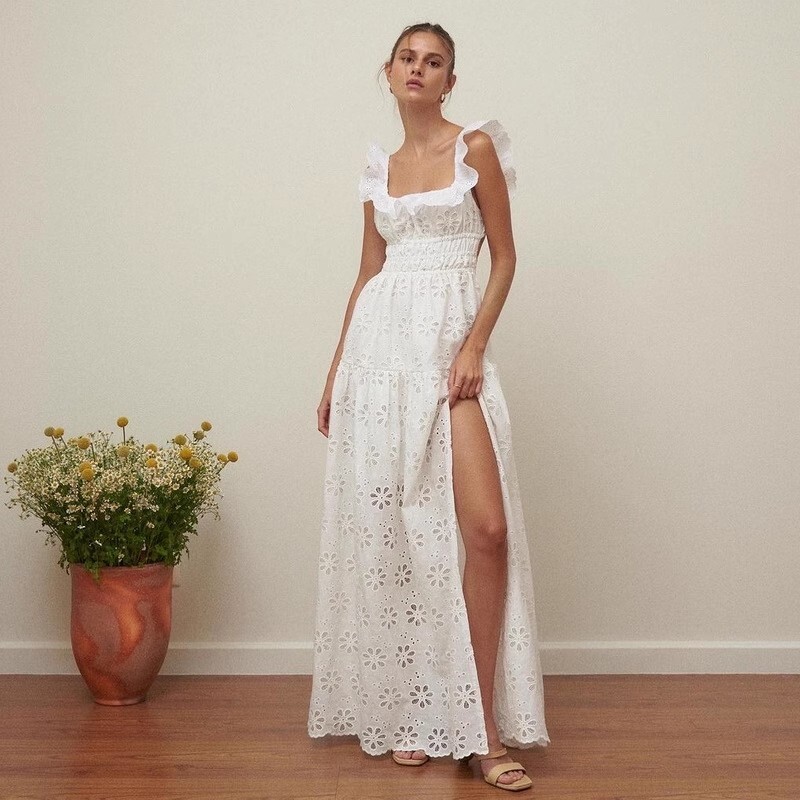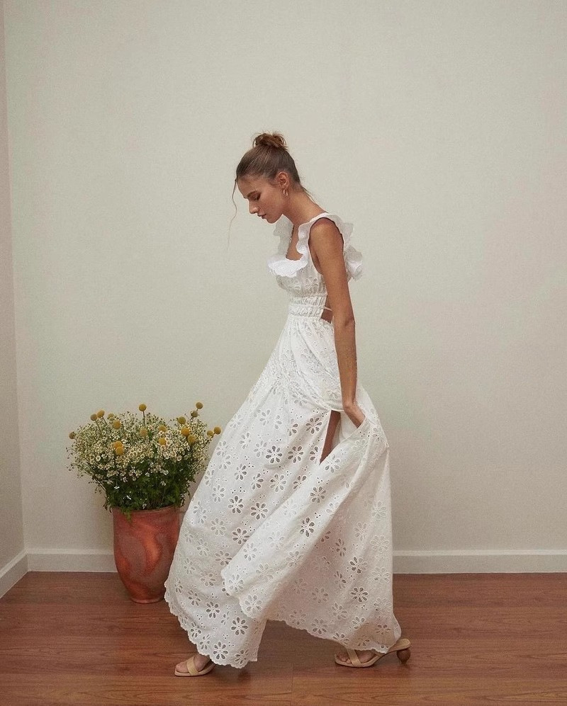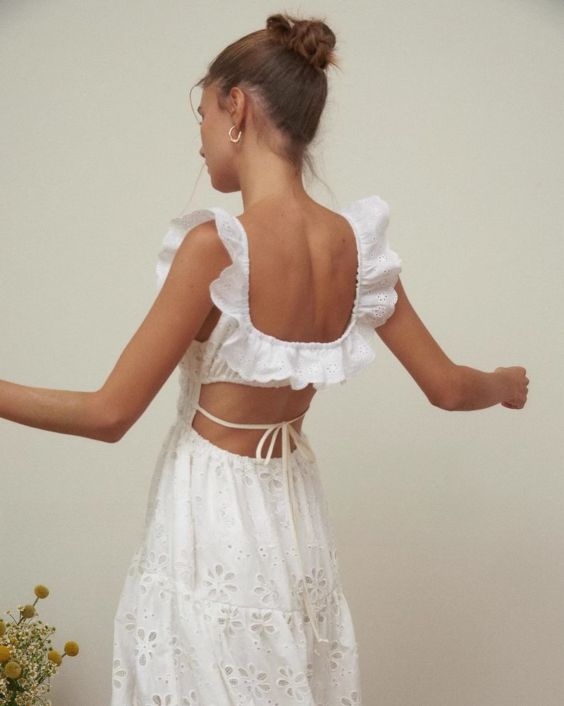 刺繡簍空 方領荷葉邊露背長洋裝