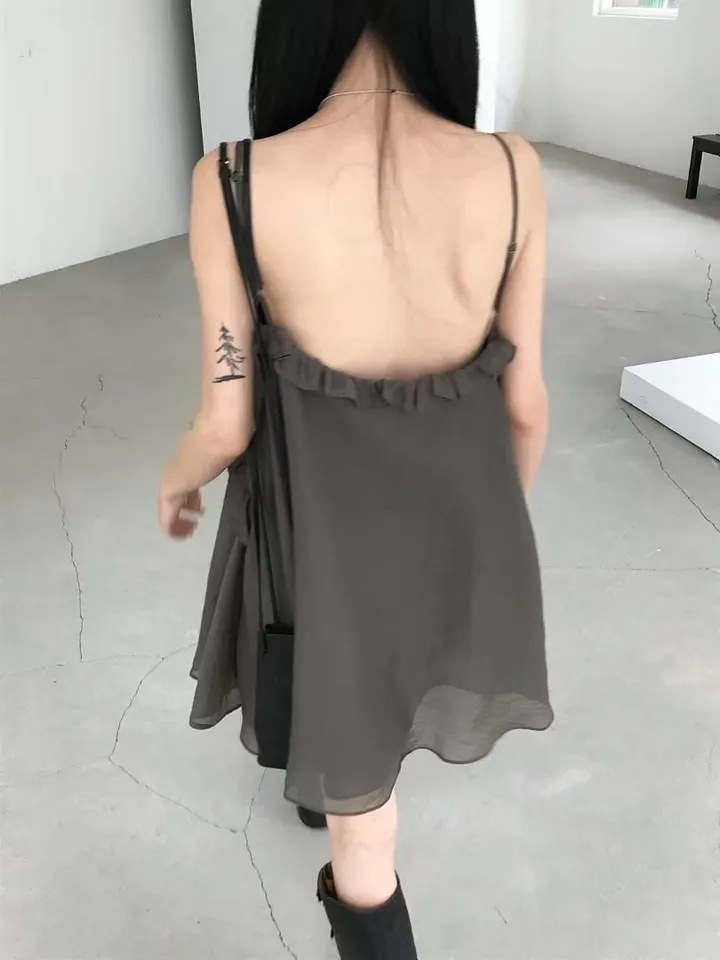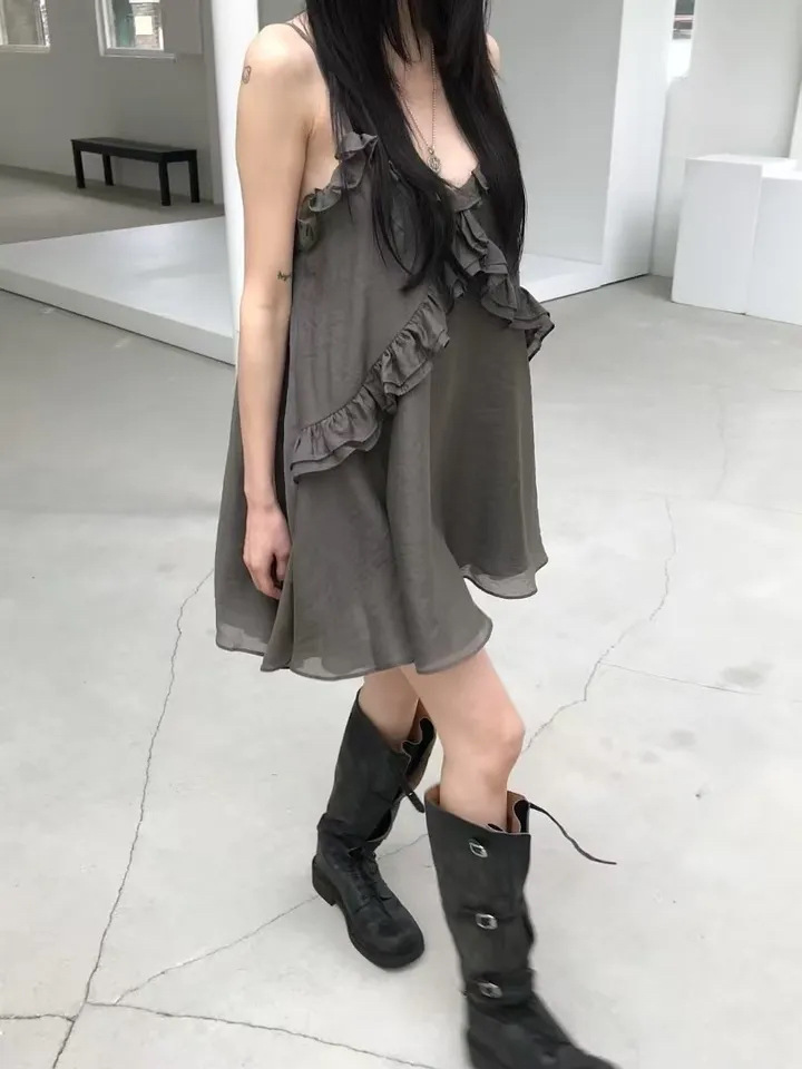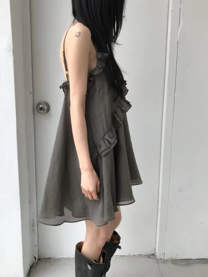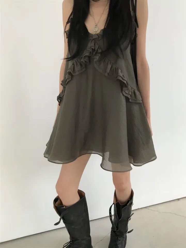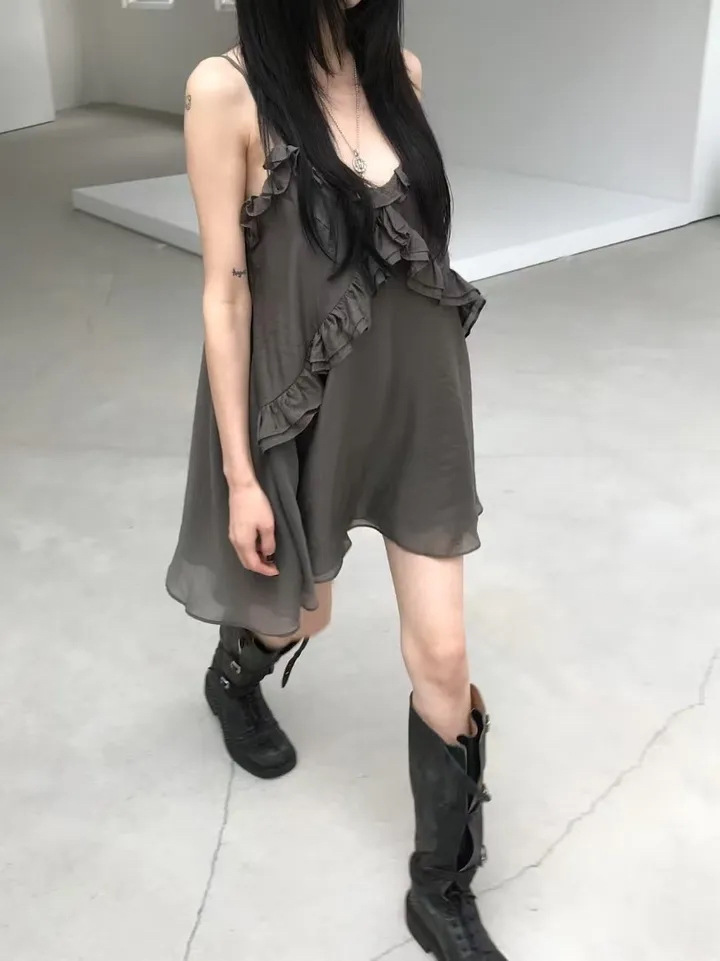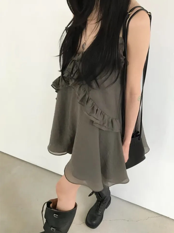 韓國純慾 木耳邊雪紡洋裝(灰/藕/白)
