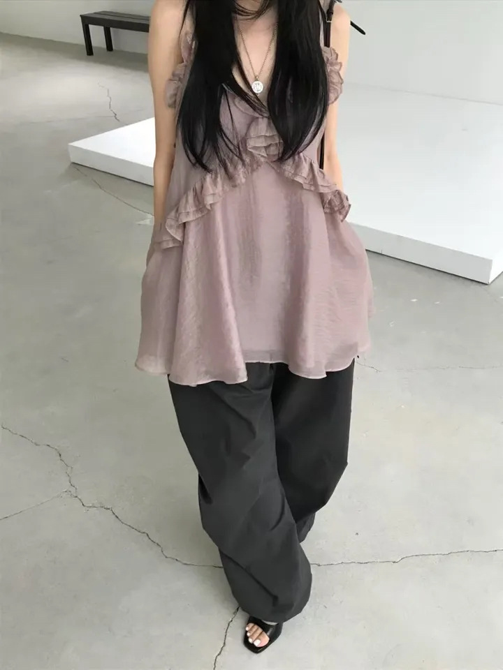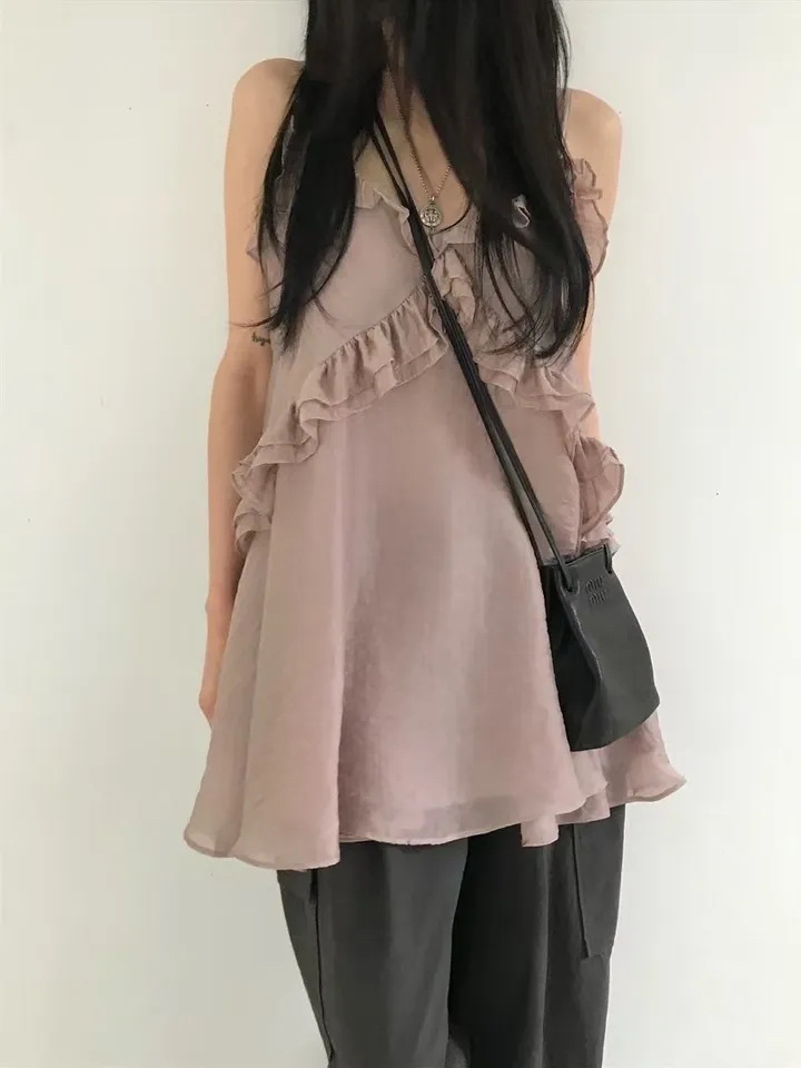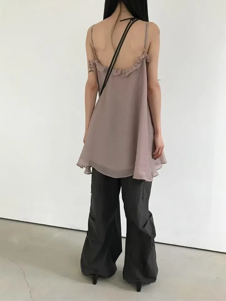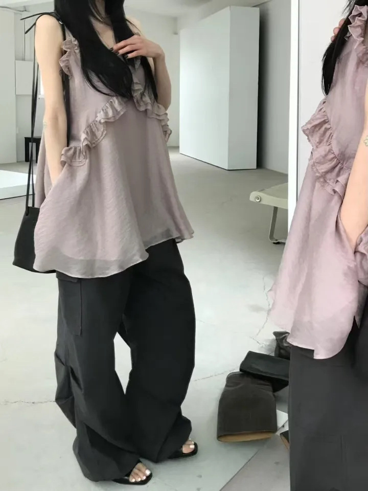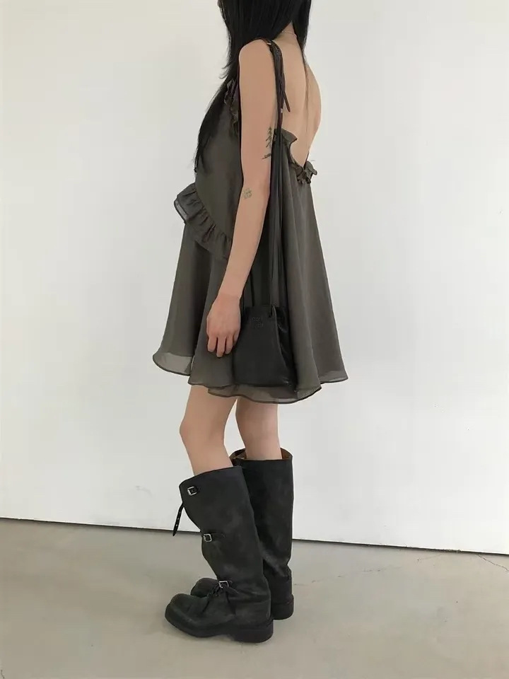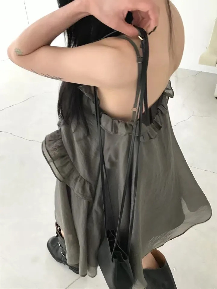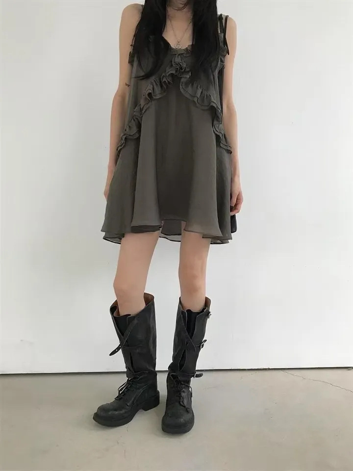 韓國純慾 木耳邊雪紡洋裝(灰/藕/白)