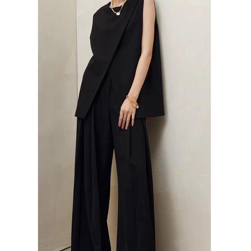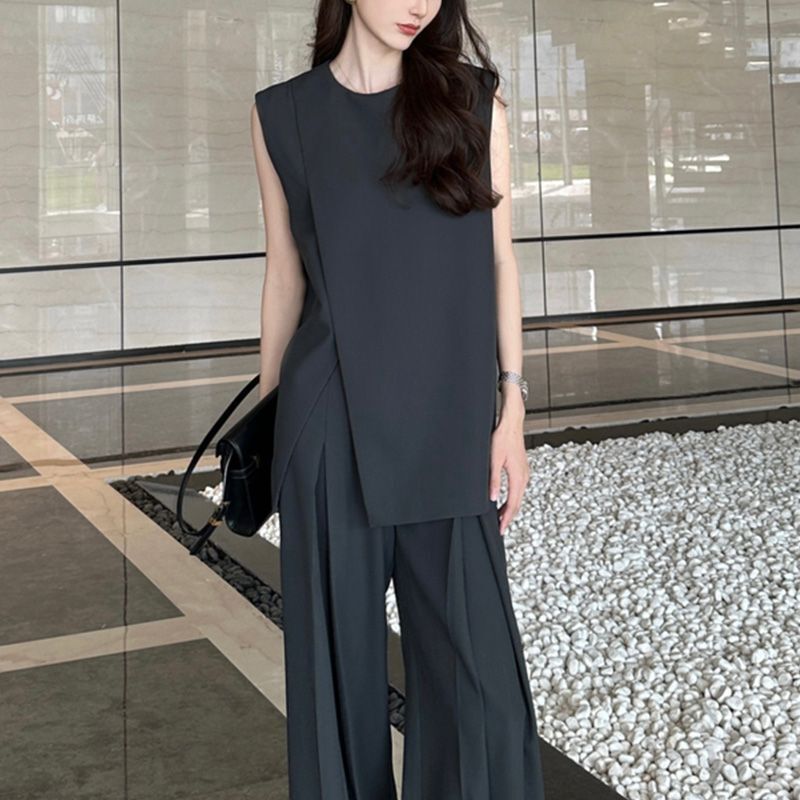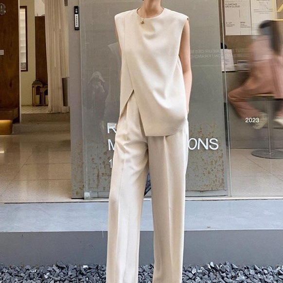 簡約無袖長版上衣+高腰褲(2件組)(杏白/黑)