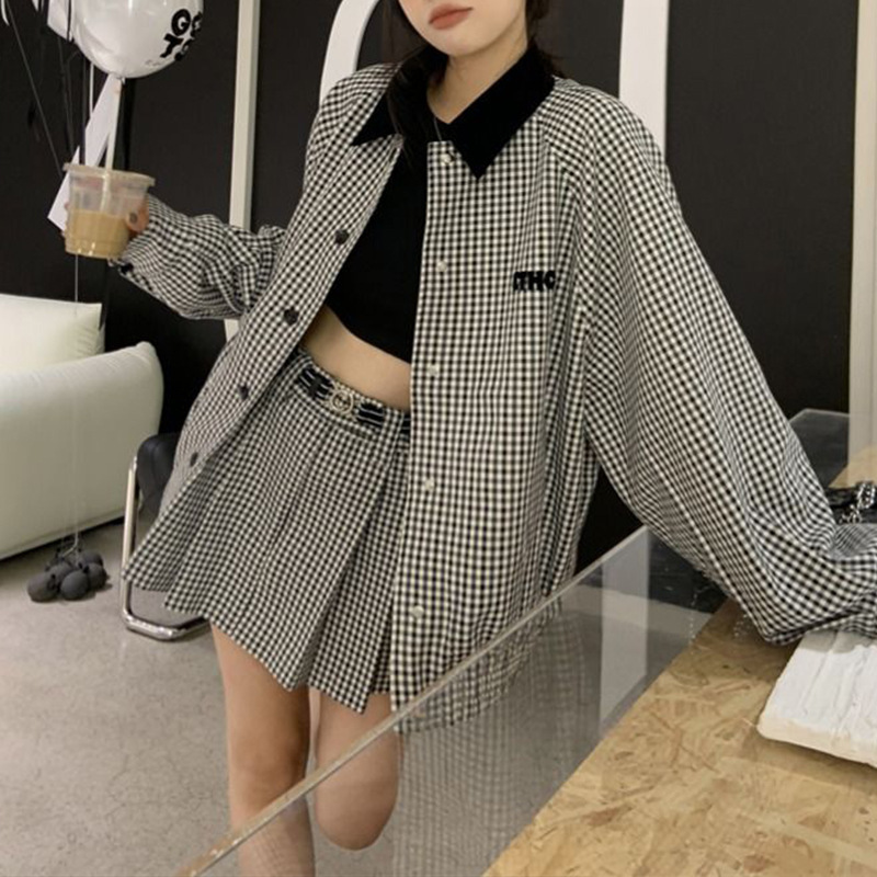 俏麗韓系 黑白格紋寬版夾克+高腰裙(2件組)