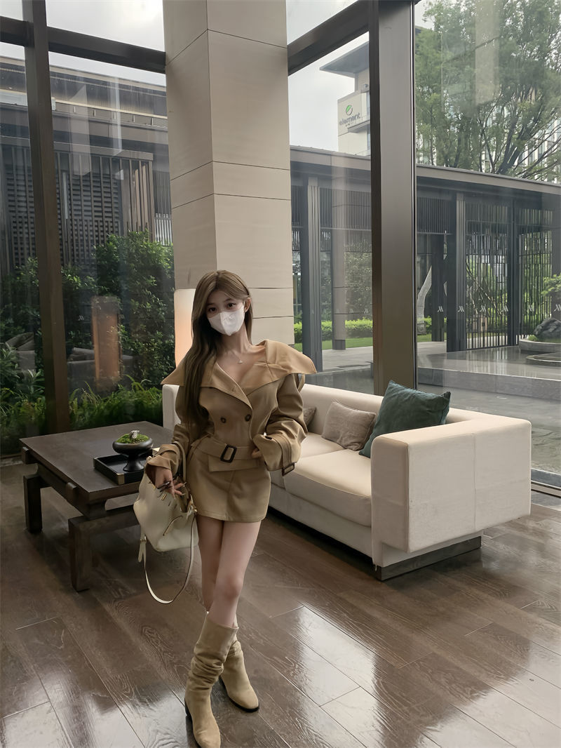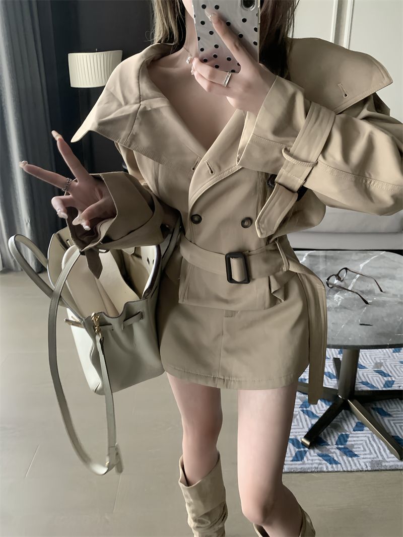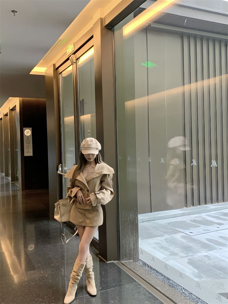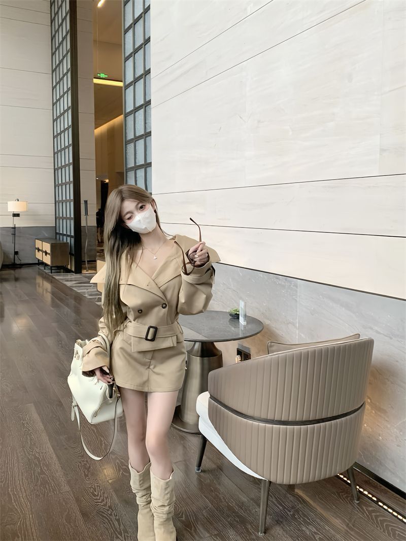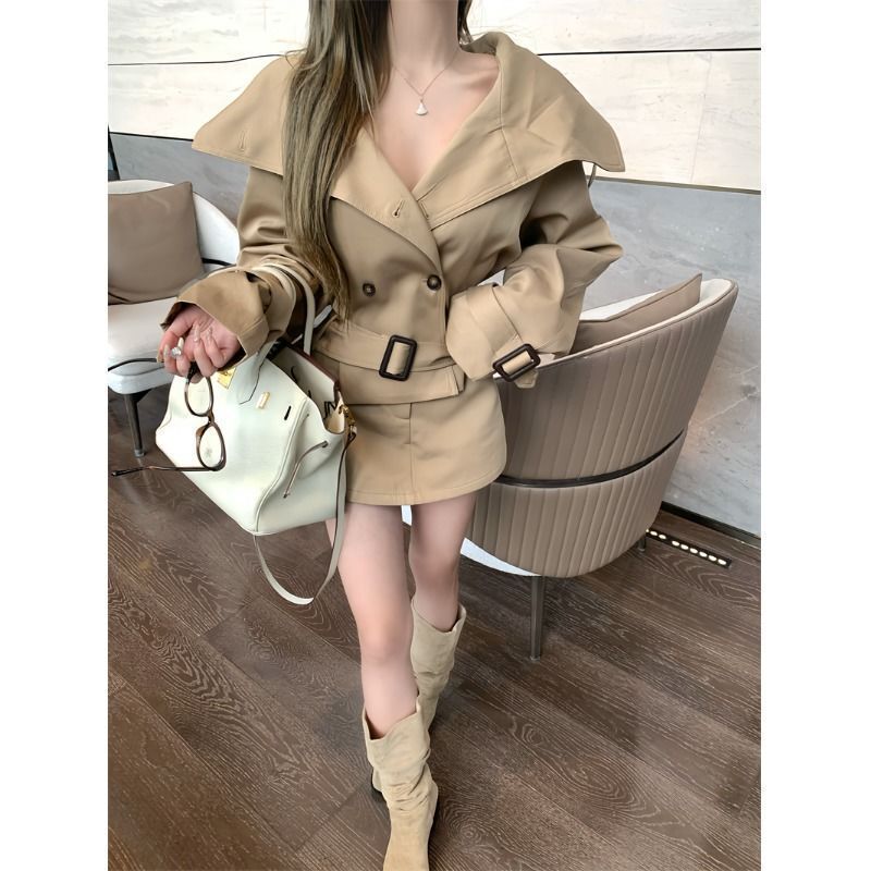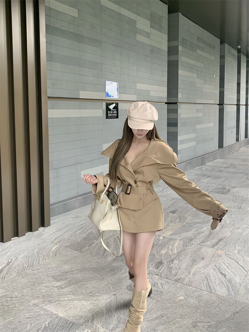 英倫大翻領風衣+高腰短裙(2件組)
