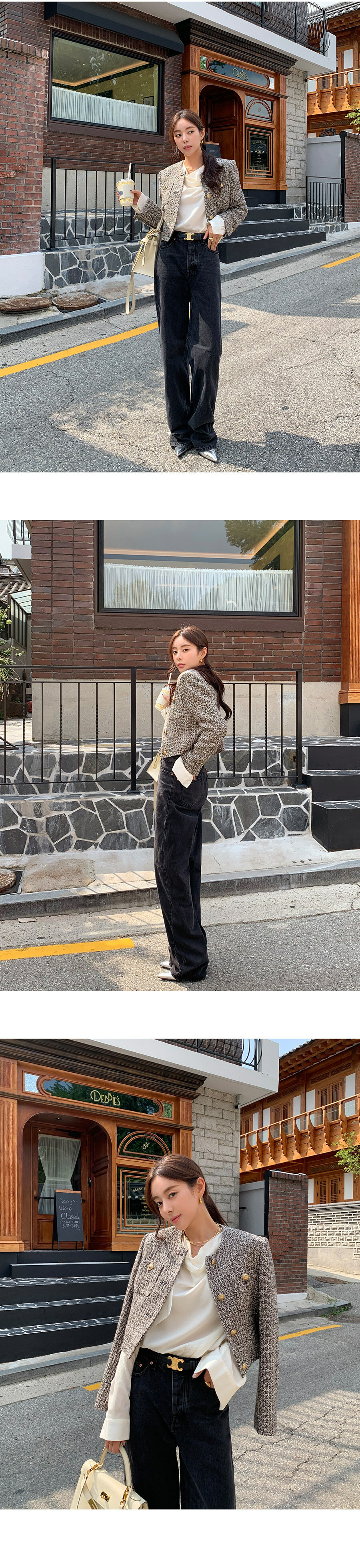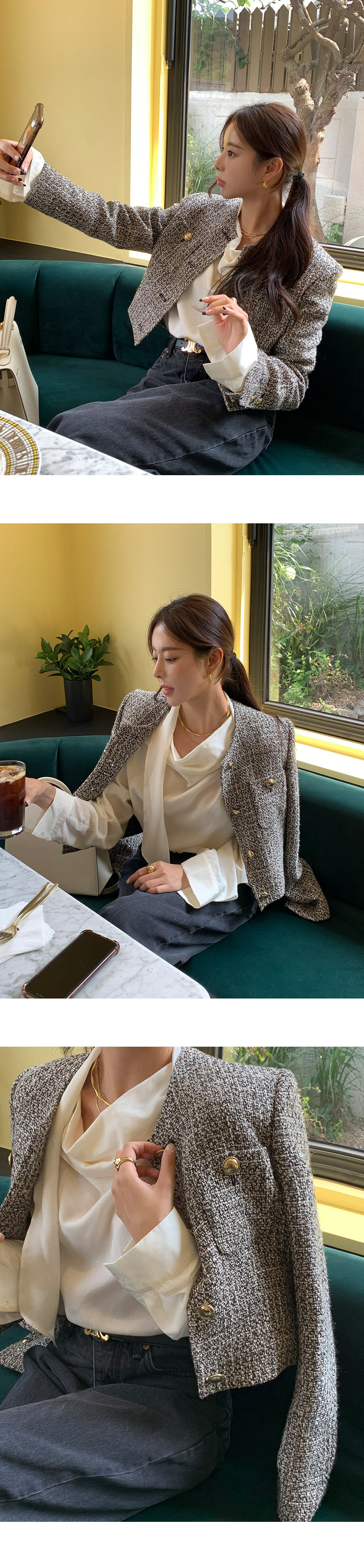 這件東大門粗花泥 小香外套色調高雅沉穩,採用高品質手工修繕的粗厚織料,展現出獨特且富有層次感的紋路。