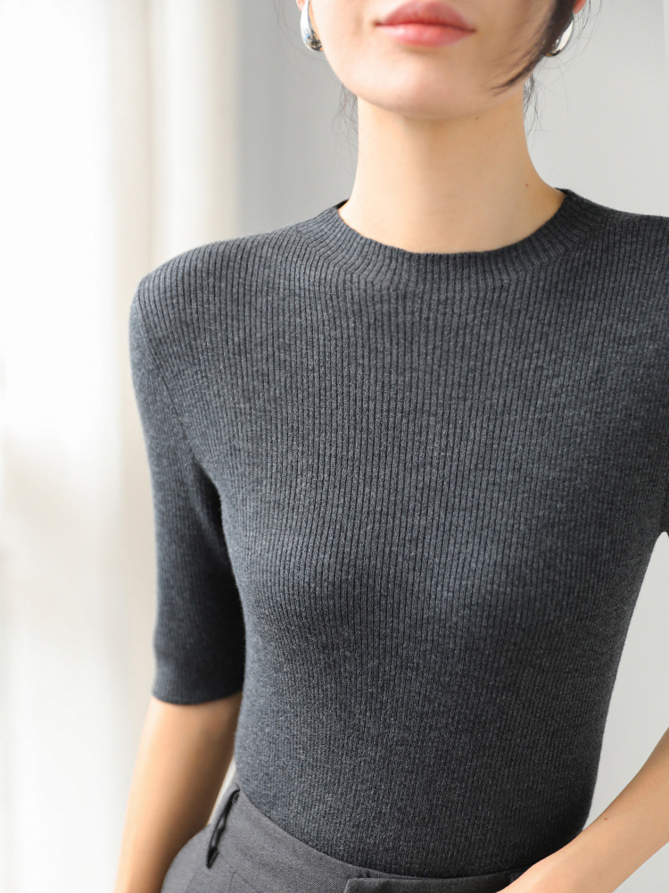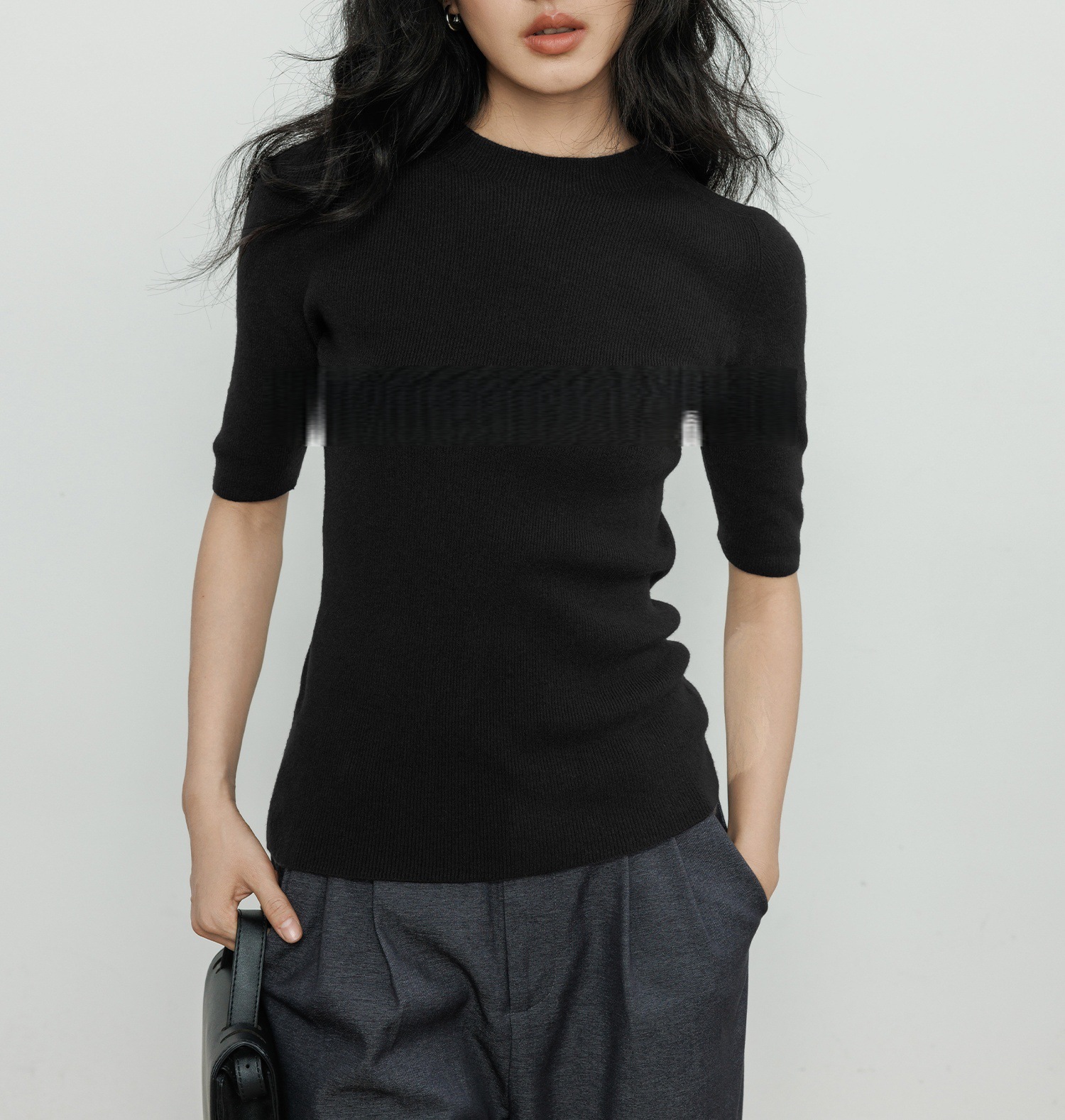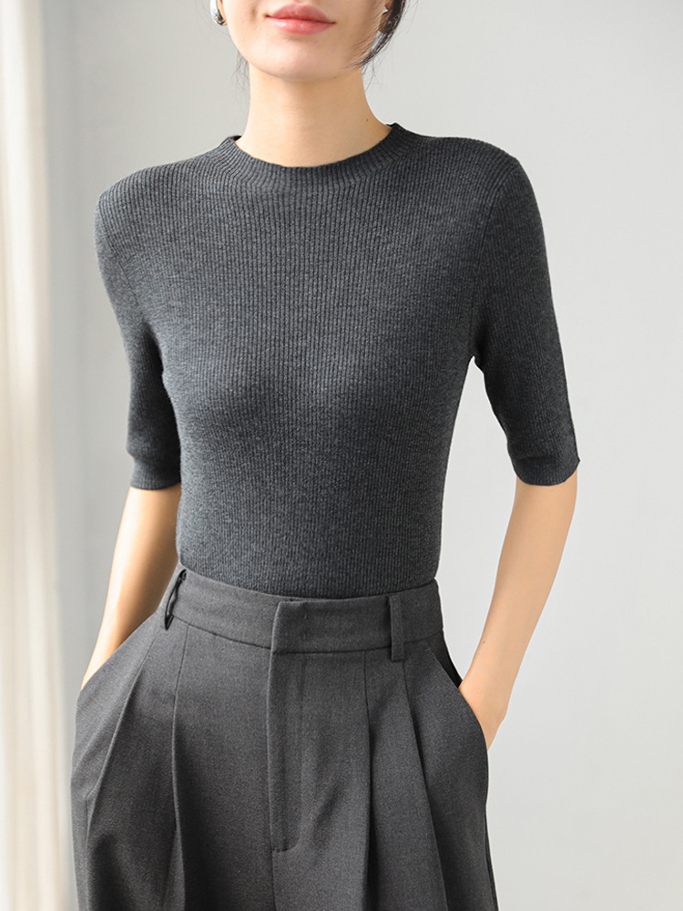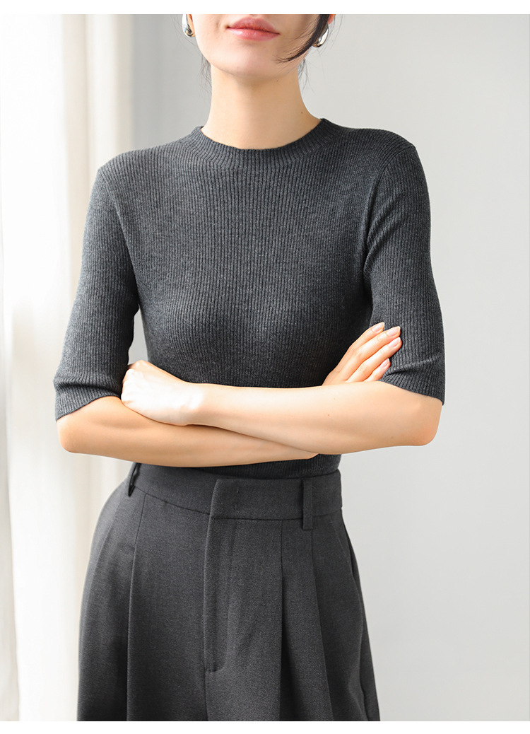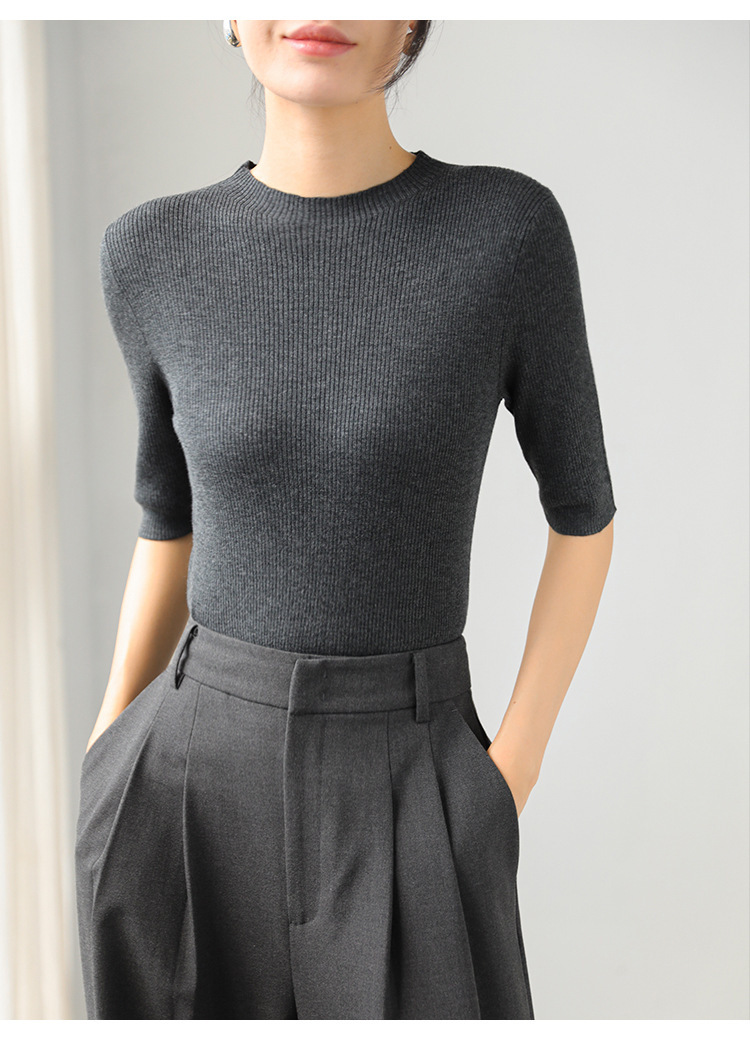 羊毛坑條圓領袖上衣(灰/黑)