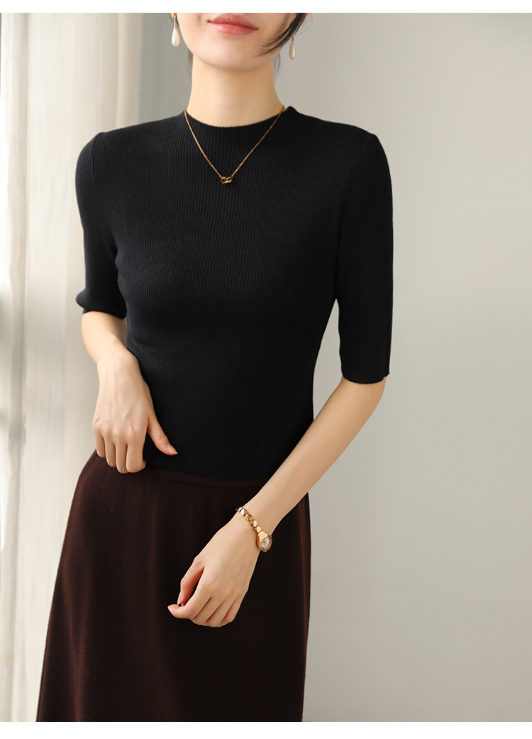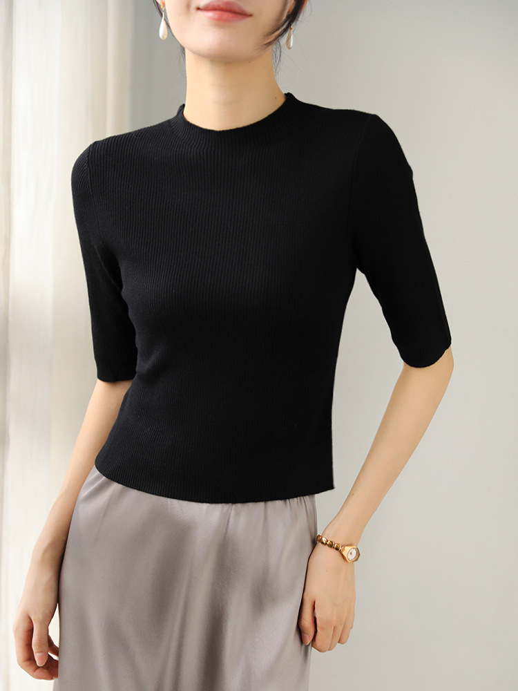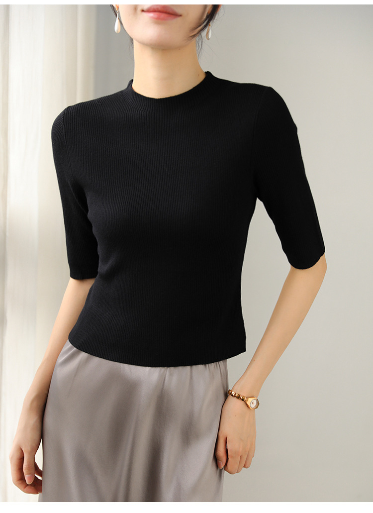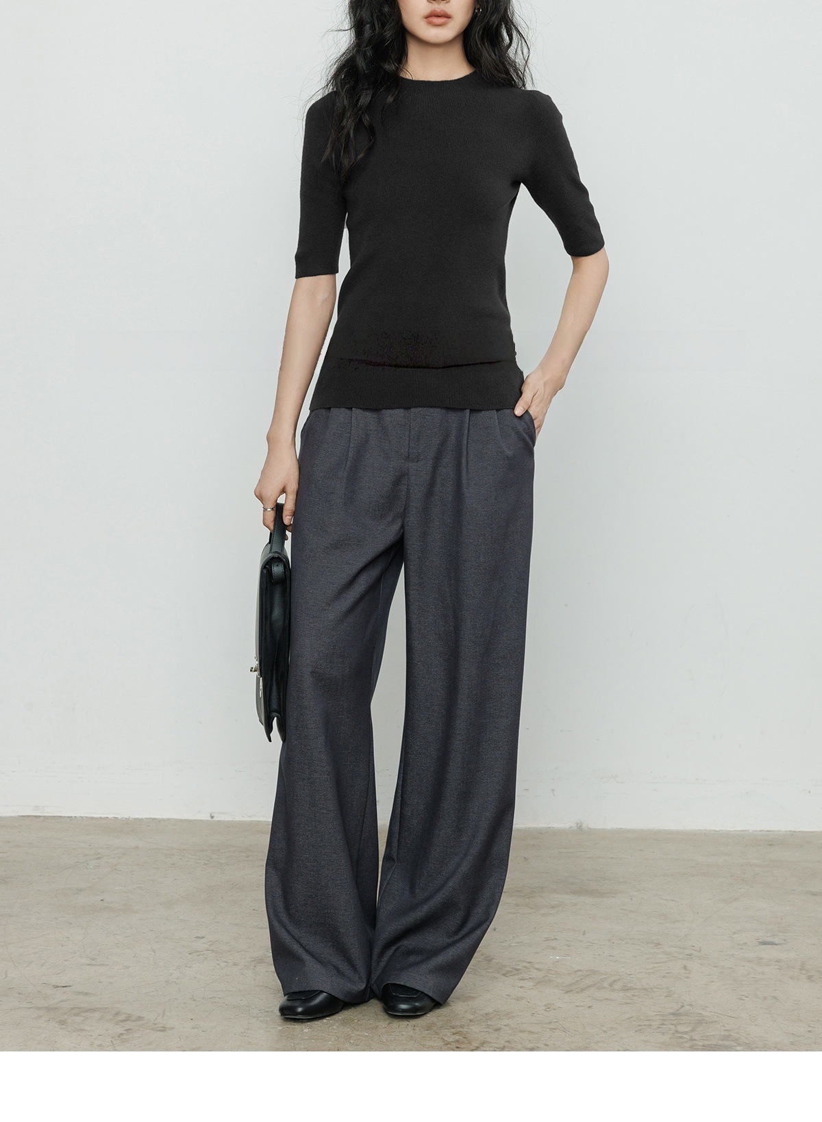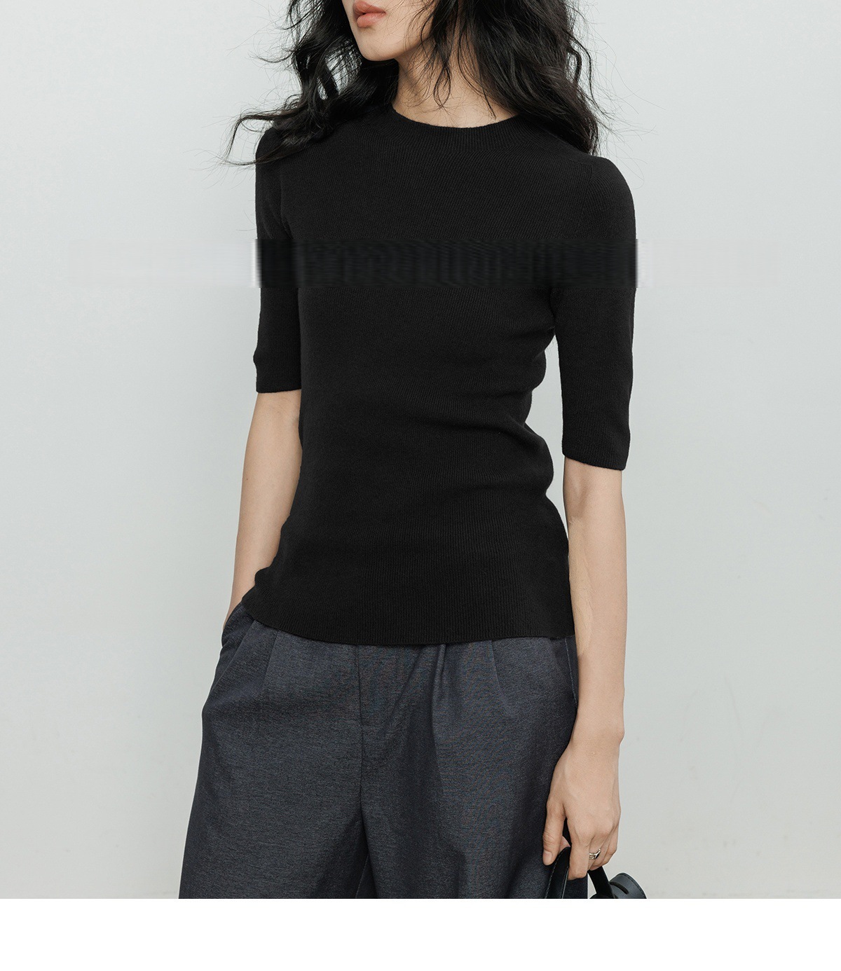 羊毛坑條圓領袖上衣(灰/黑)