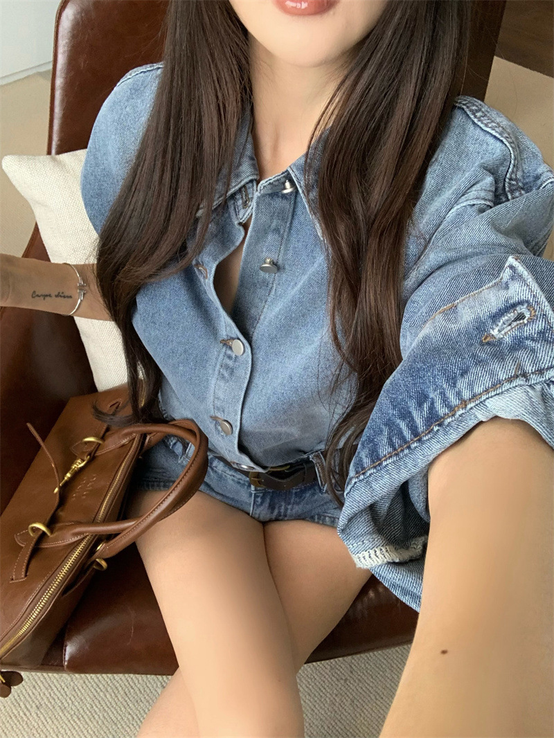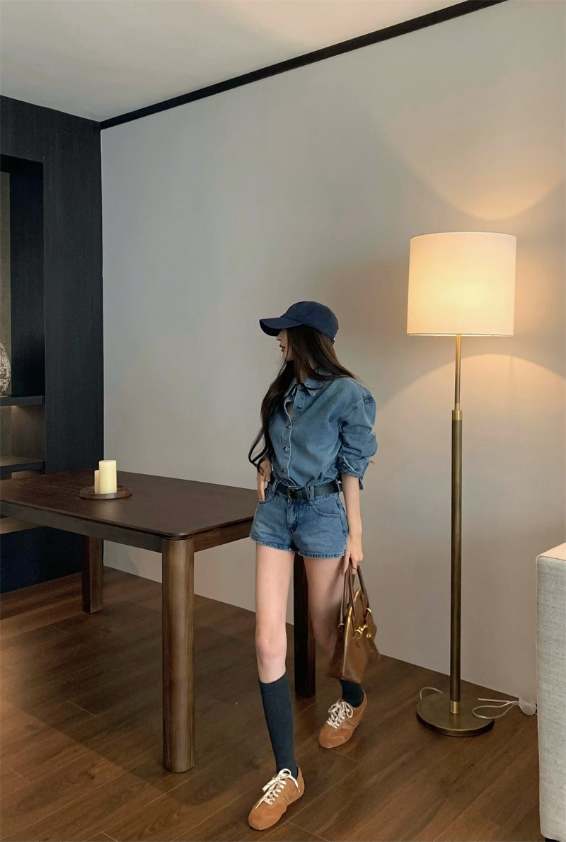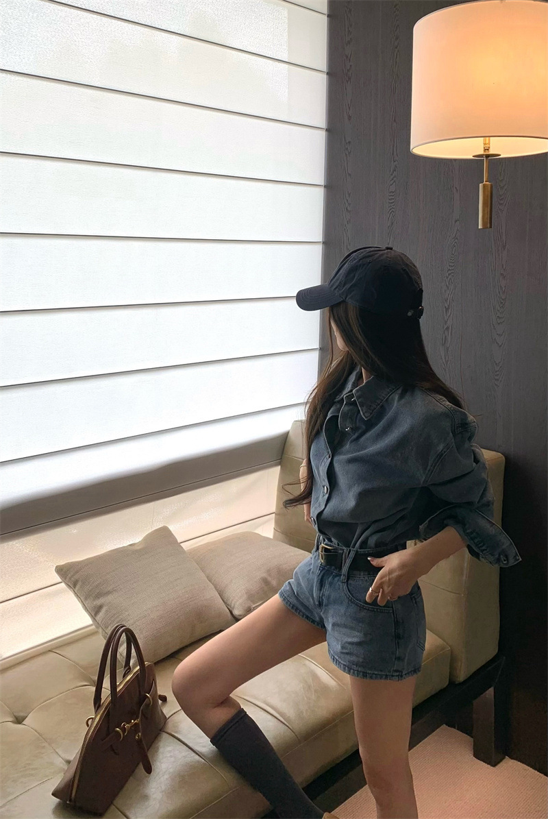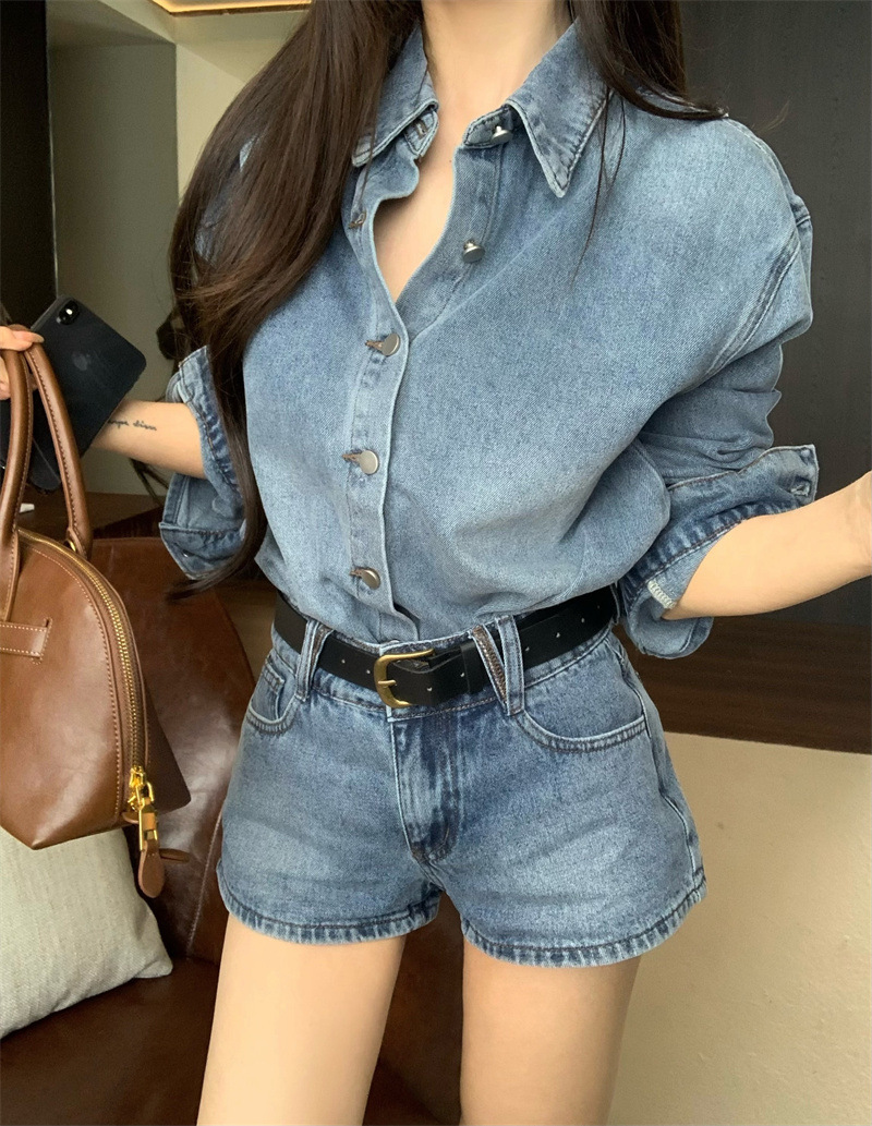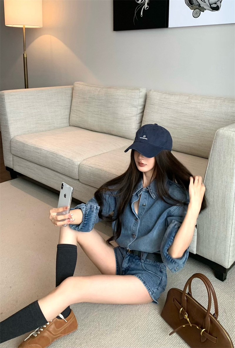 休閒時髦感 牛仔襯衫+短褲(2件組)
