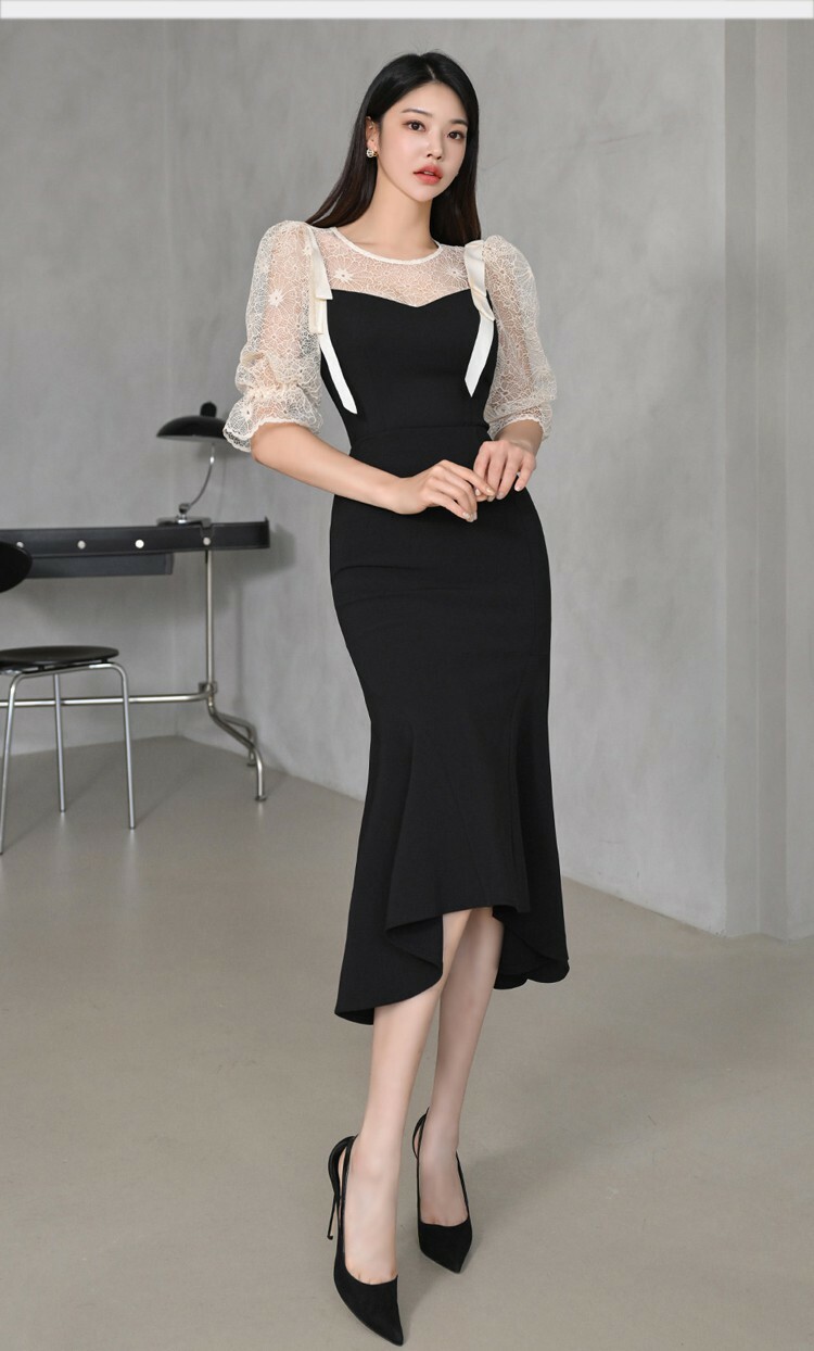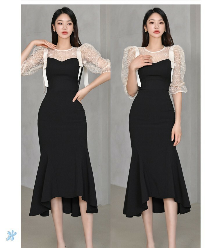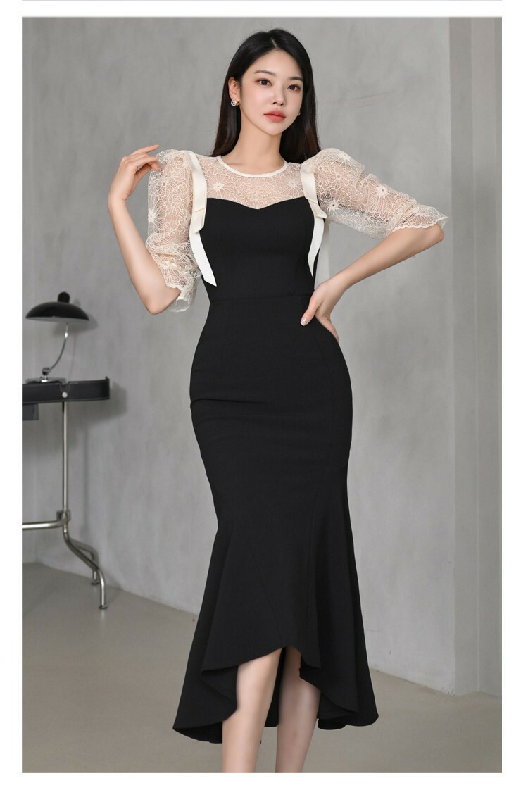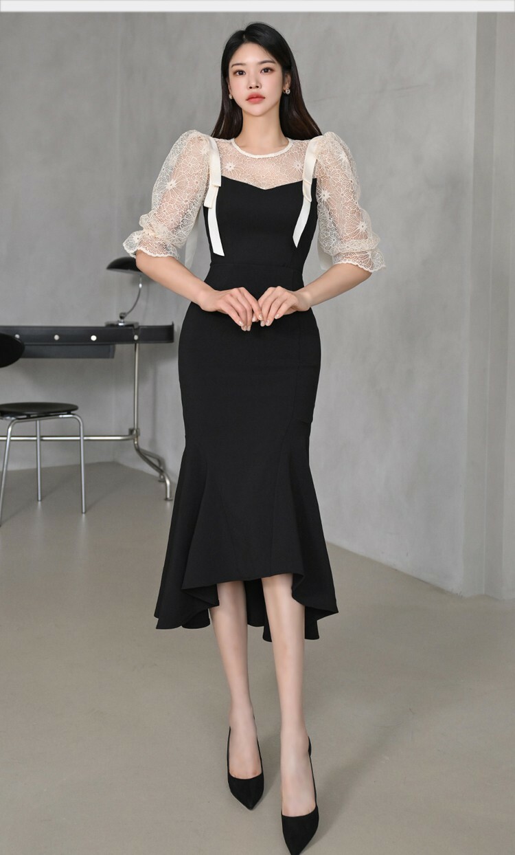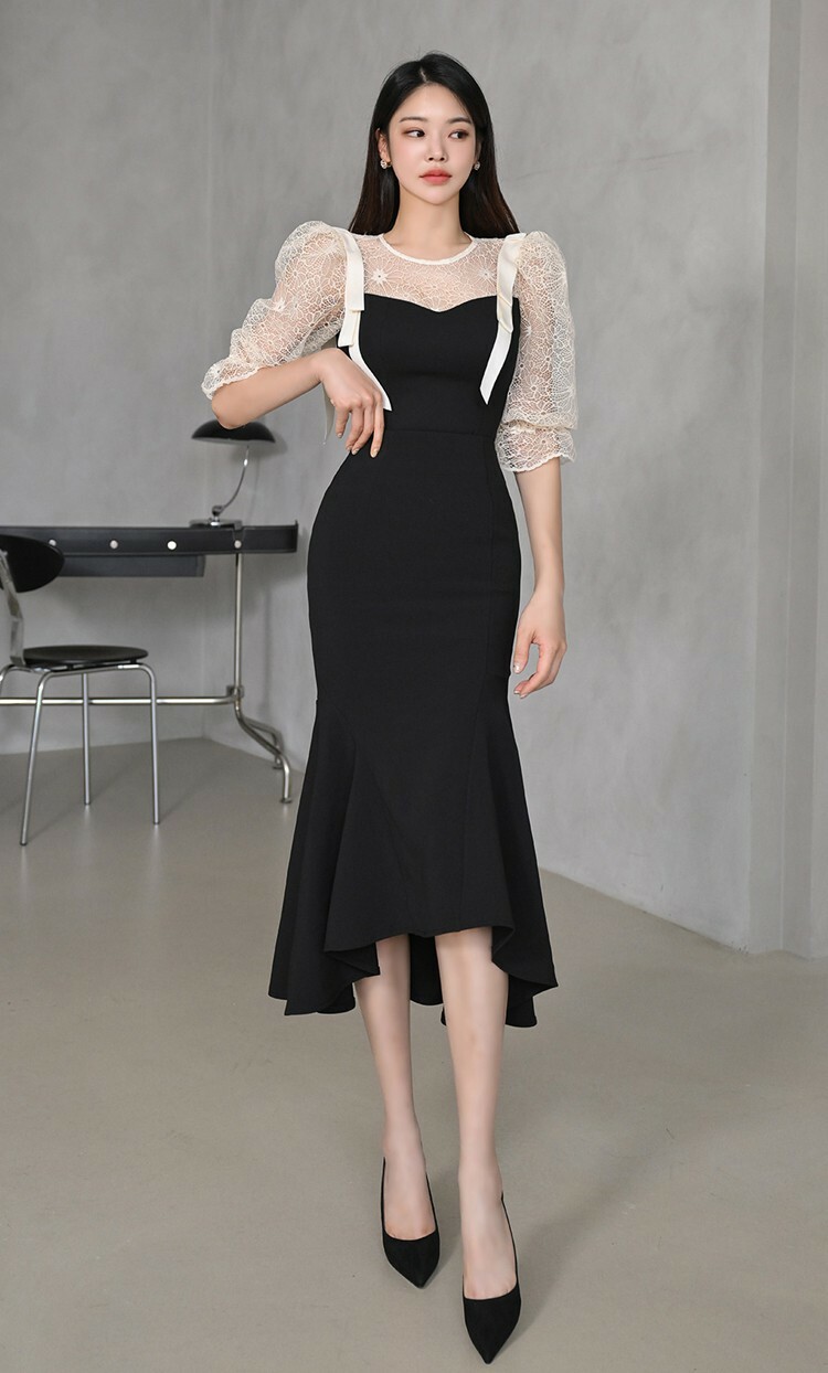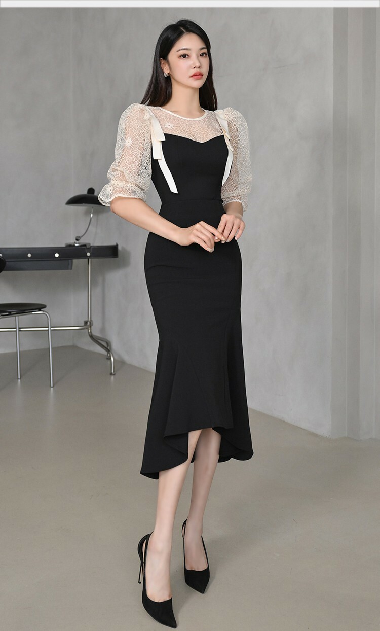 俐落剪裁的黑色長洋裝,襯以蕾絲拼接設計的短袖演繹高雅氣質。腰線設計修飾身形,魚尾裙擺展現女性曲線美,適合多種場合穿戴。