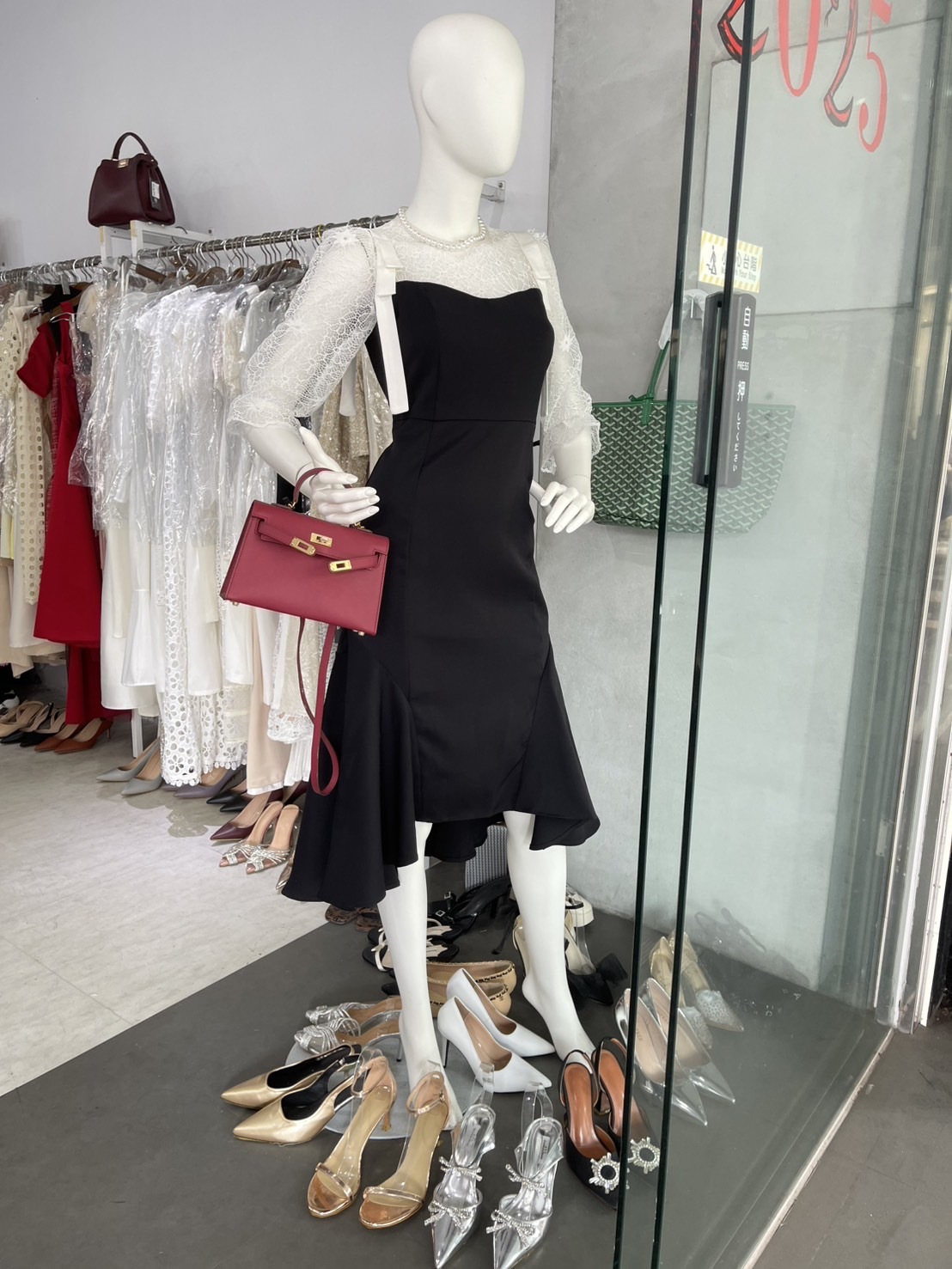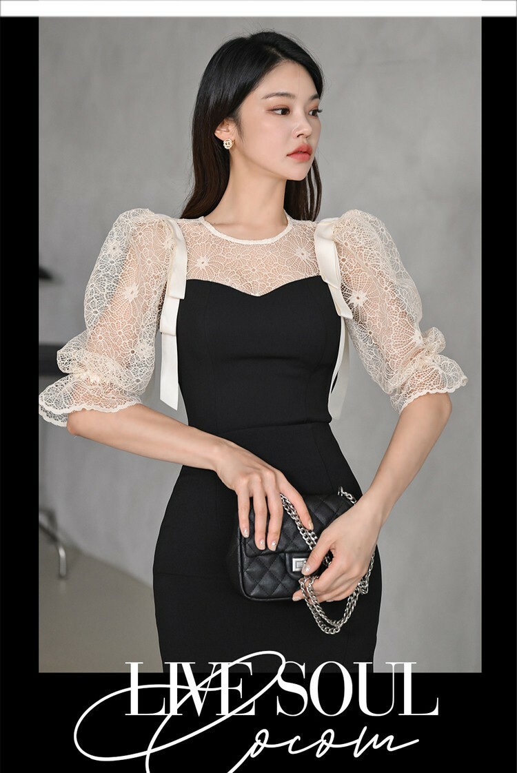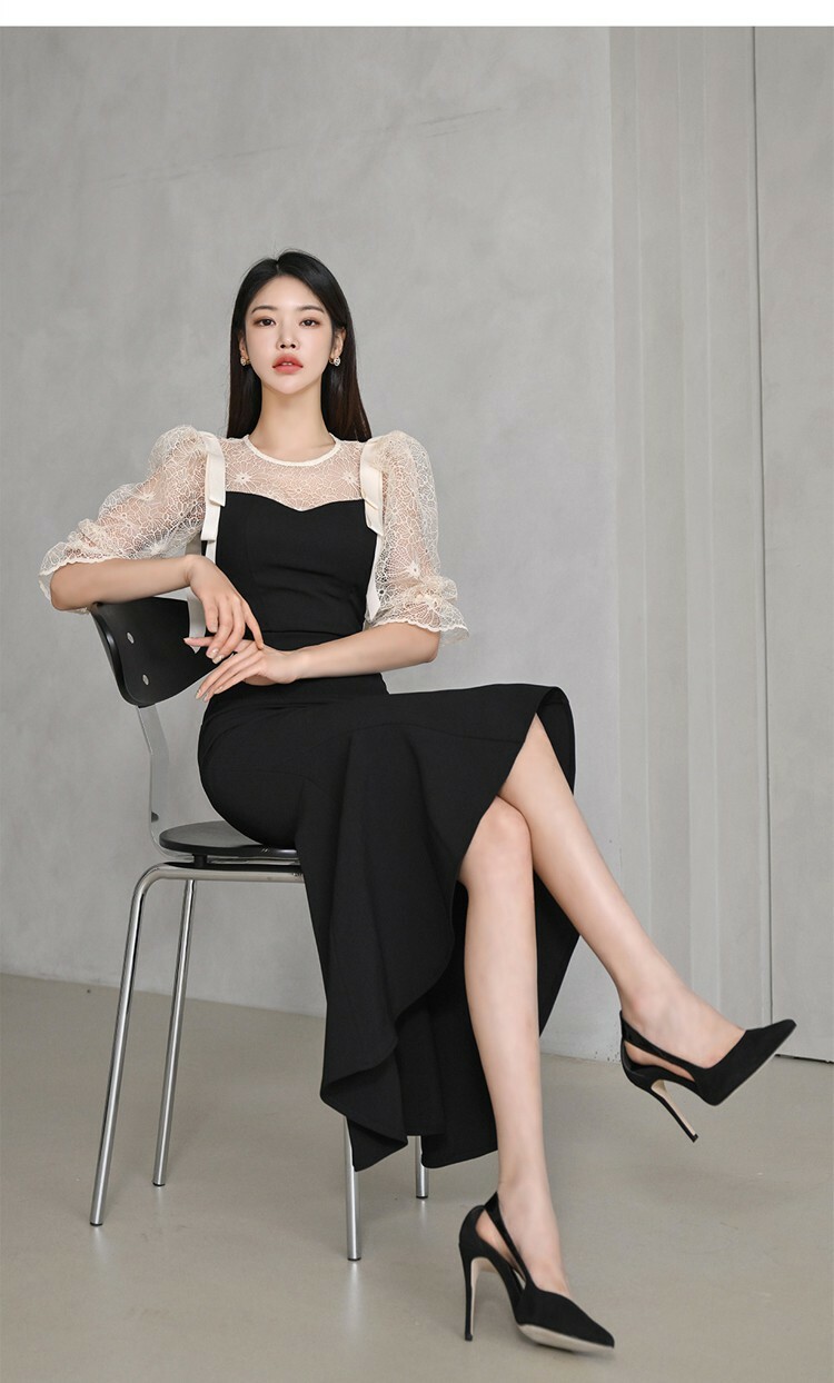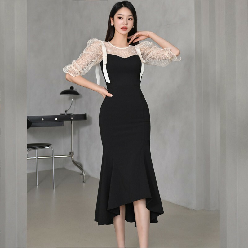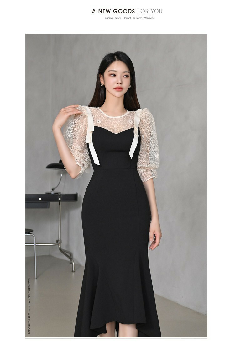 俐落剪裁的黑色長洋裝,襯以蕾絲拼接設計的短袖演繹高雅氣質。腰線設計修飾身形,魚尾裙擺展現女性曲線美,適合多種場合穿戴。
