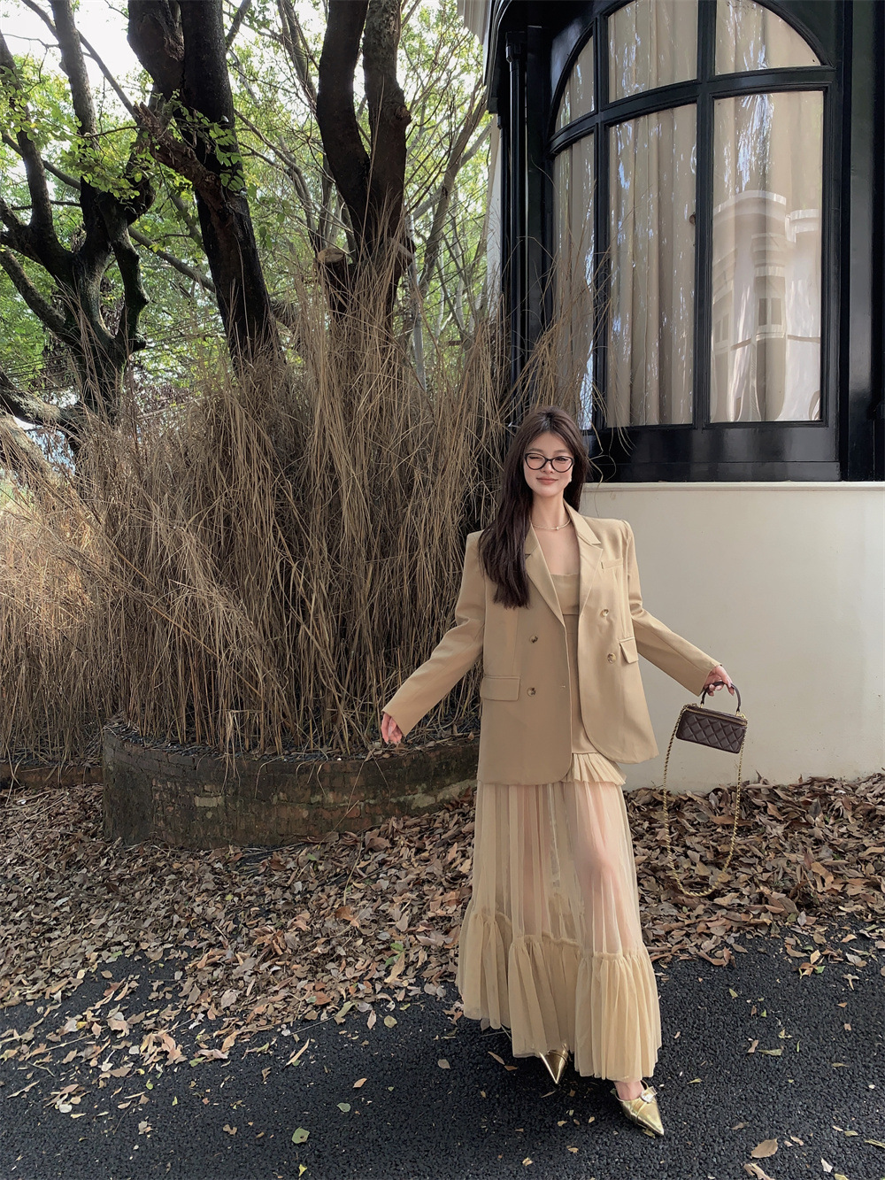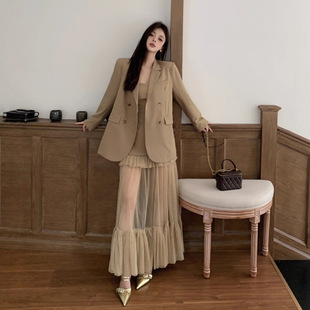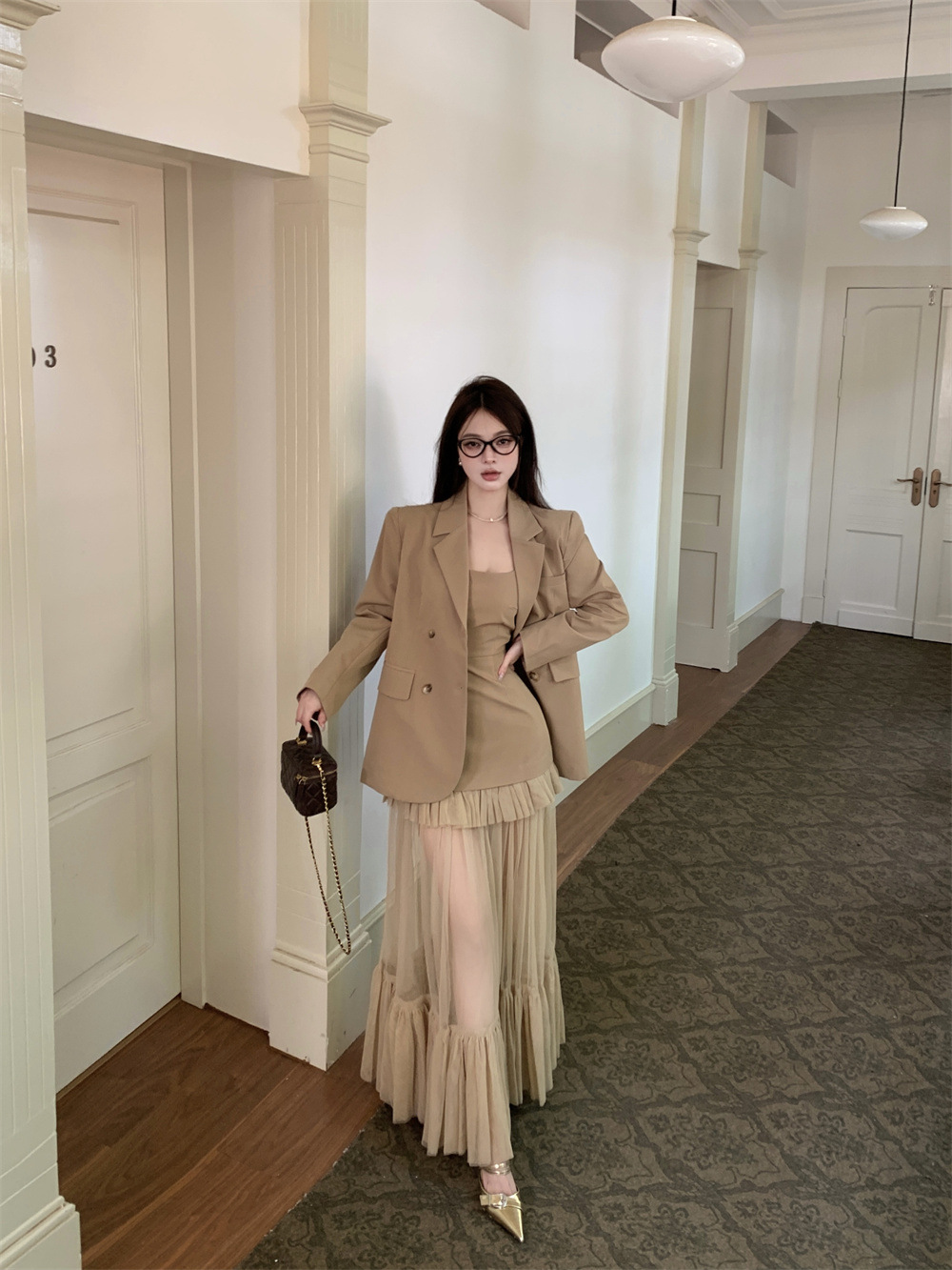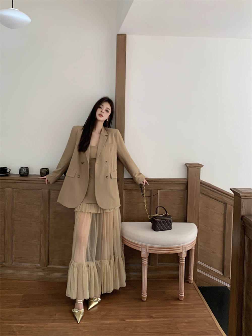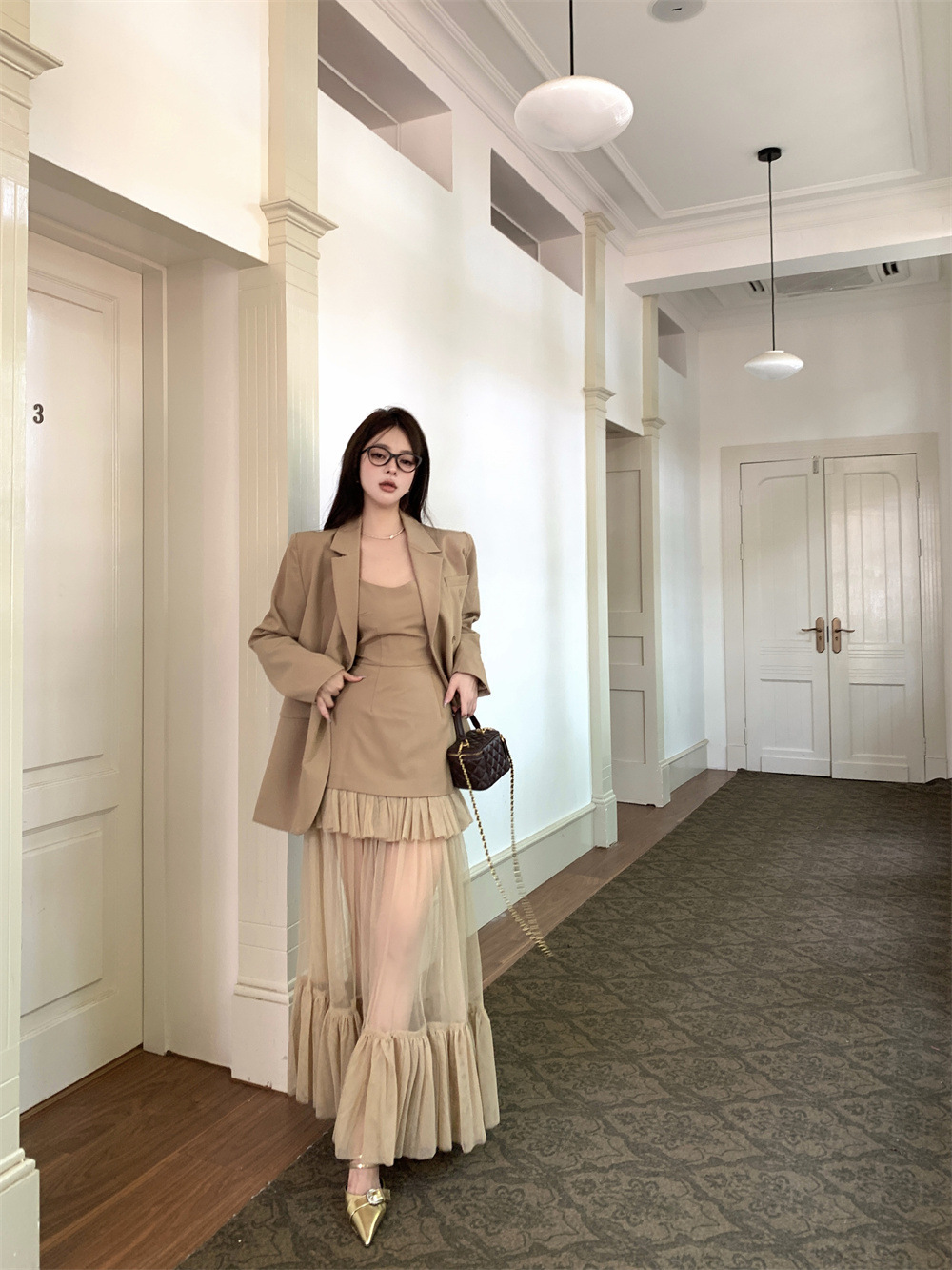 重工網紗拼接洋裝+長版西裝外套(可單買)