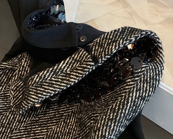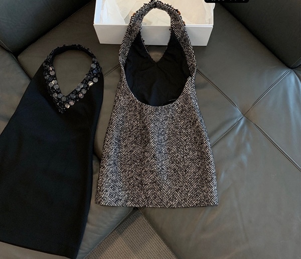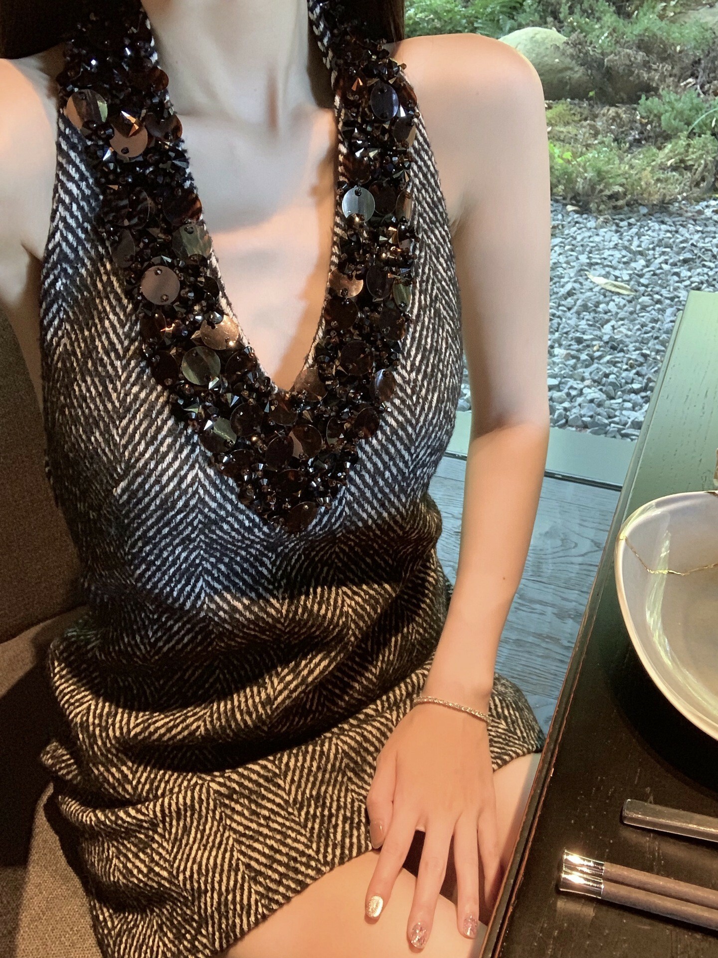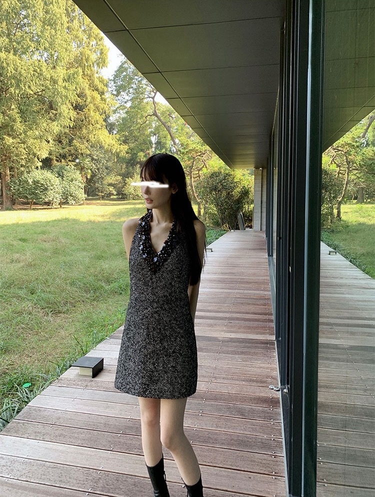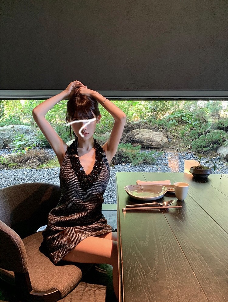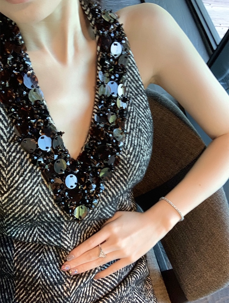 堆疊亮片 掛脖露背毛尼洋裝(人字紋/黑)