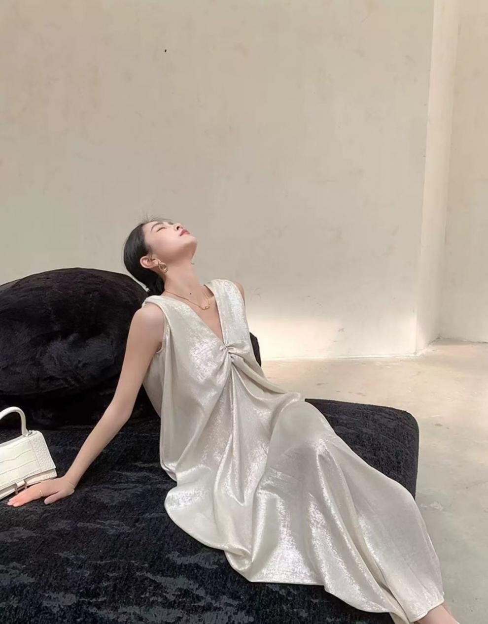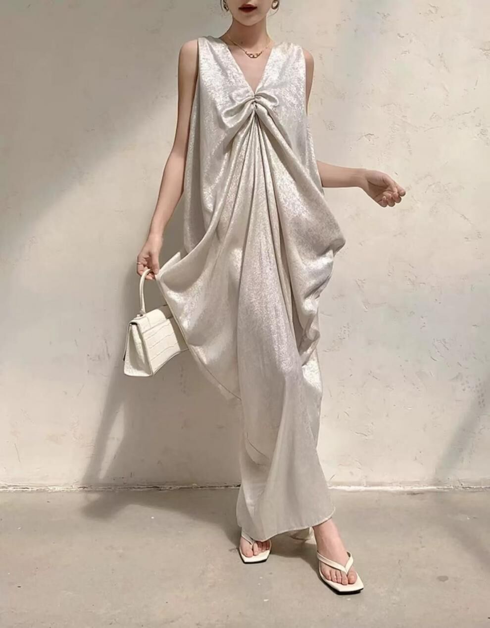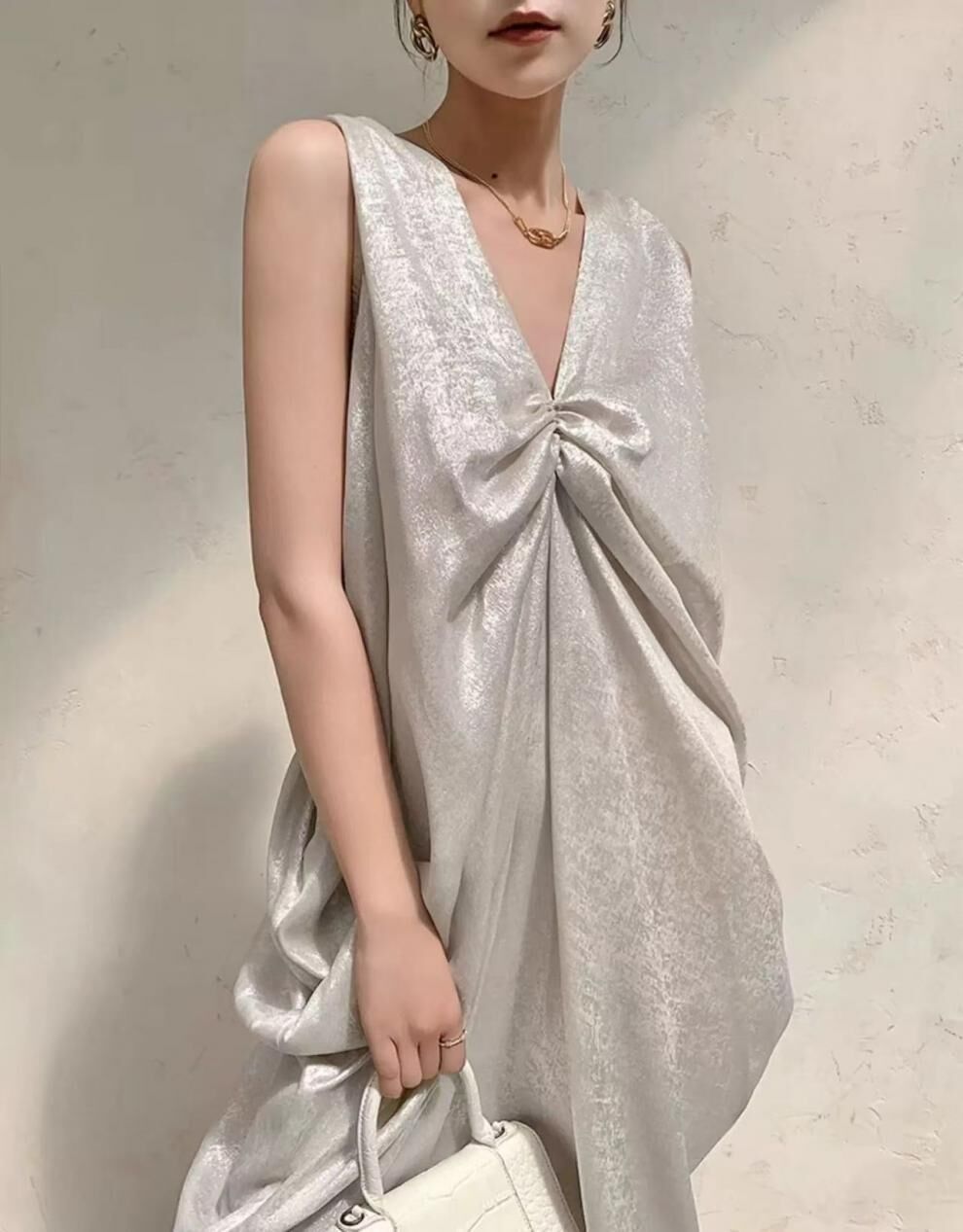 特殊光澤面料 V領寬鬆長洋
