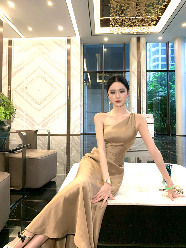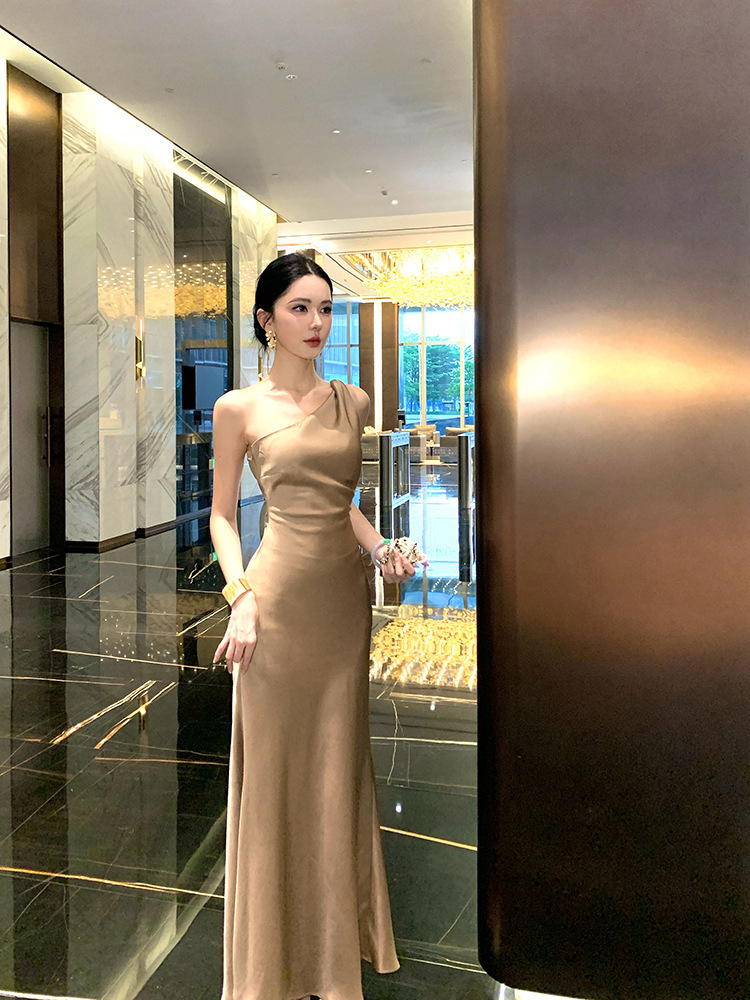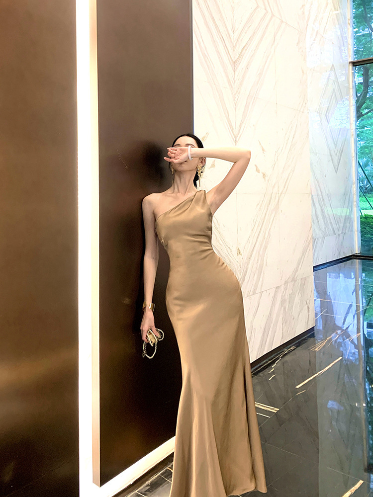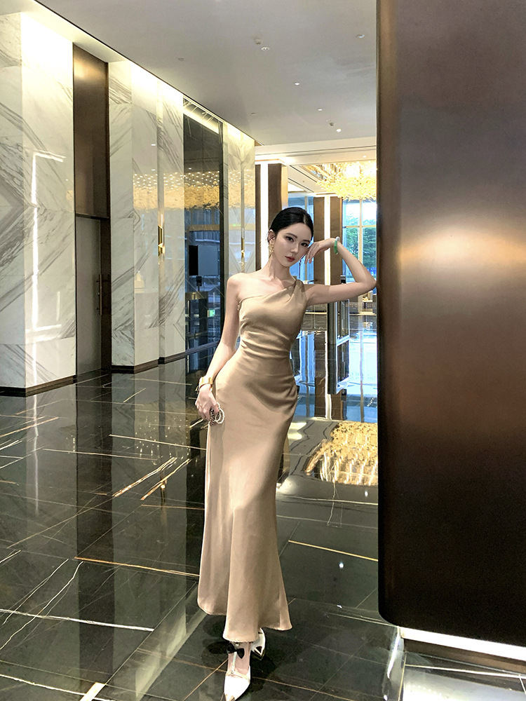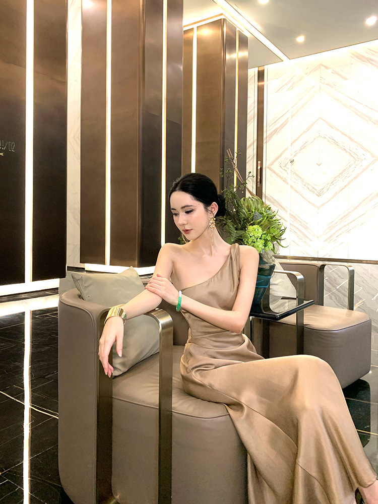 單肩收腰 絲緞長洋