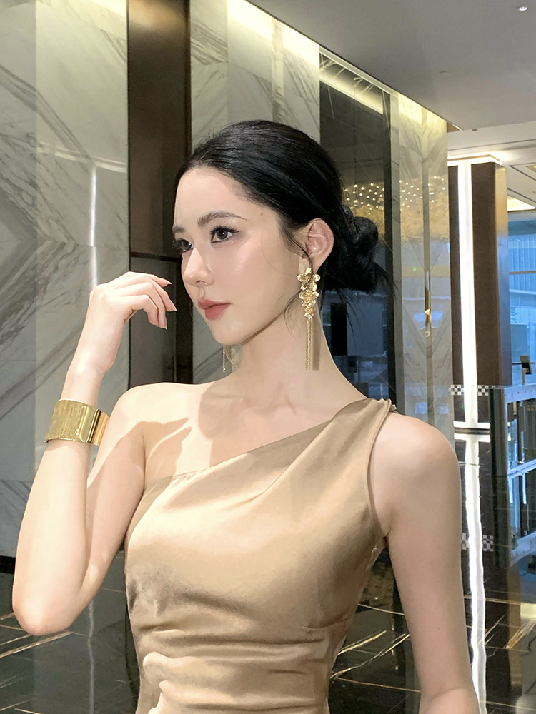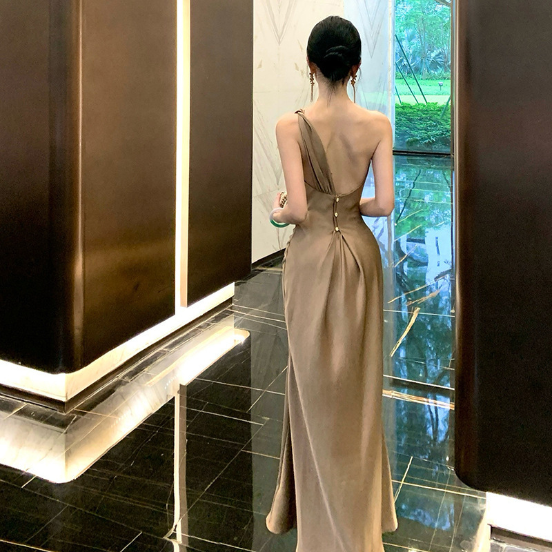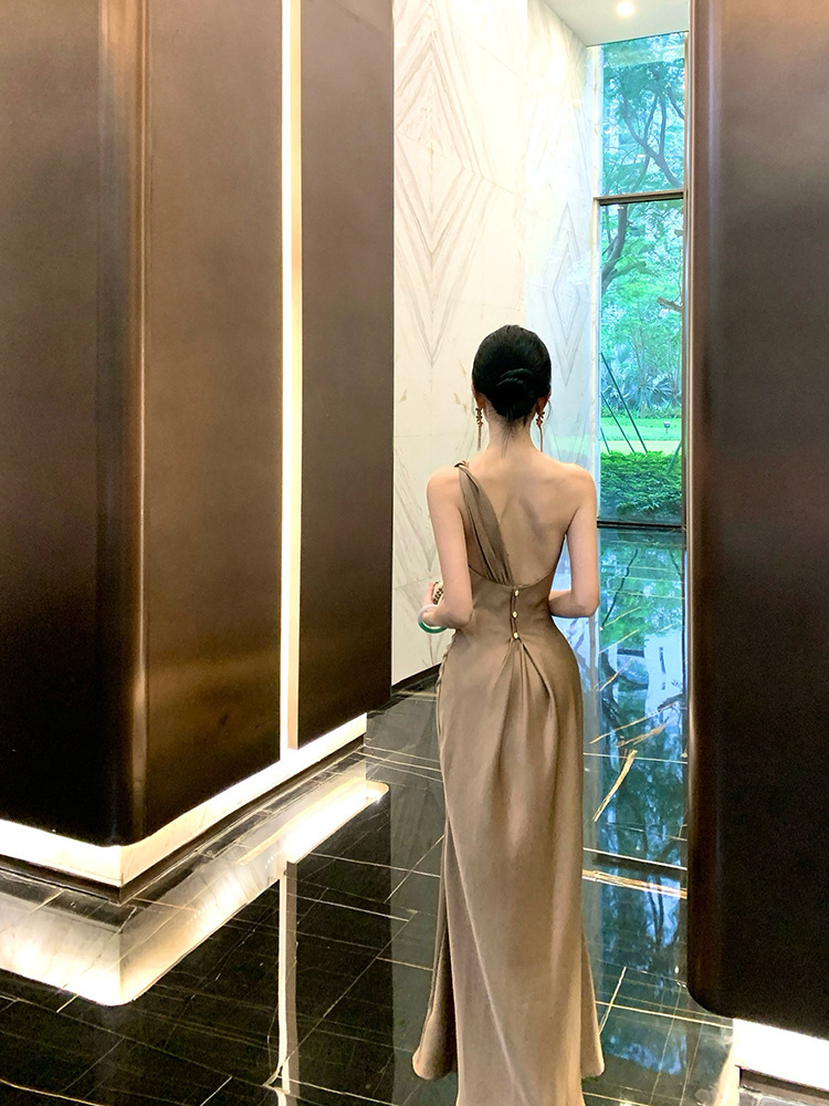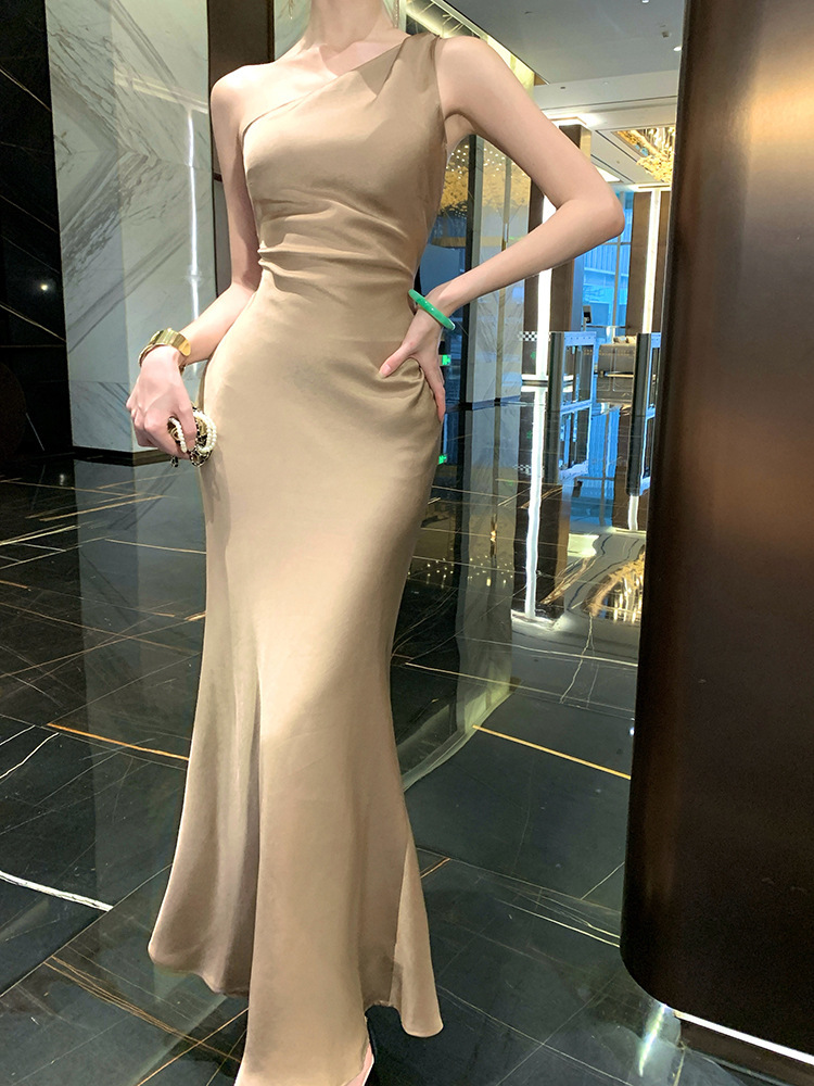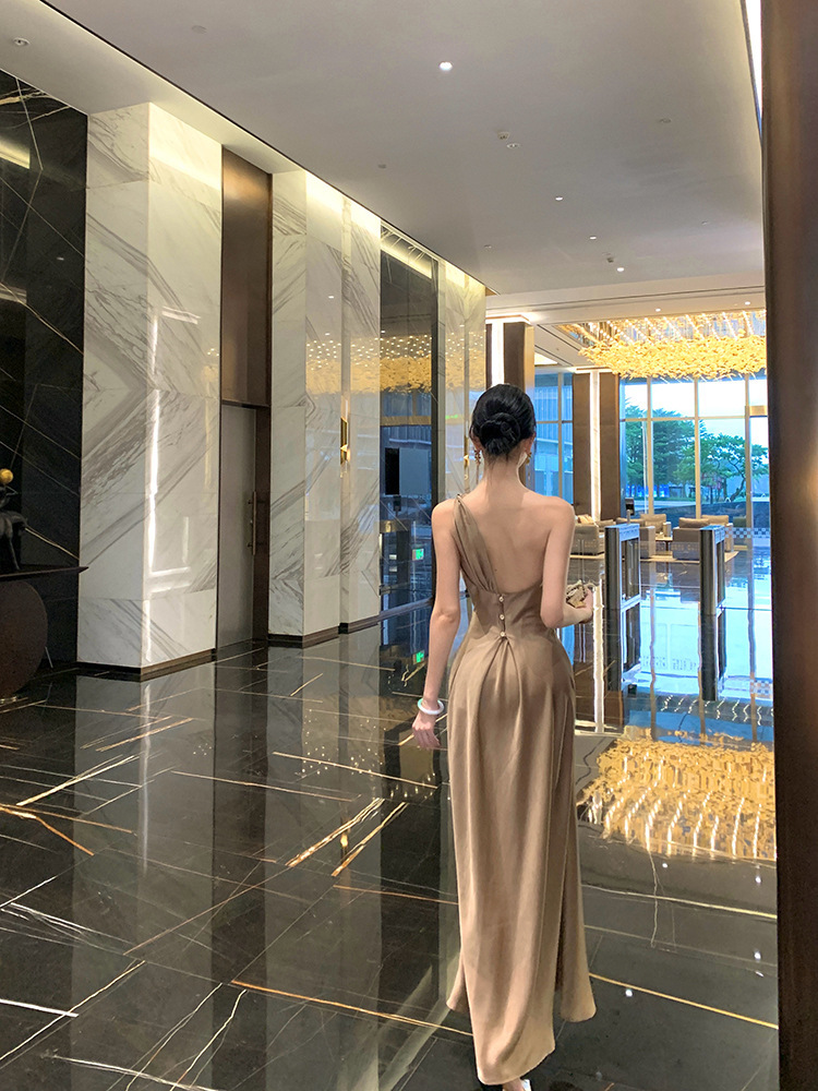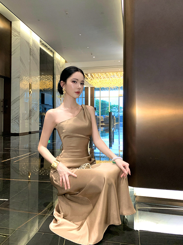 單肩收腰 絲緞長洋