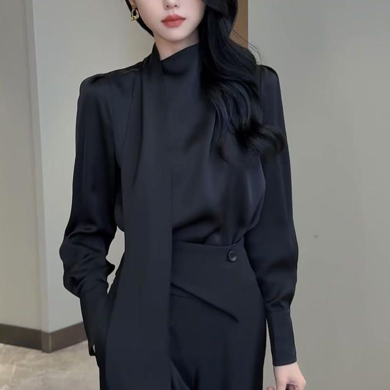 繞脖飄帶 綢緞長袖上衣+高腰褲(可單買)