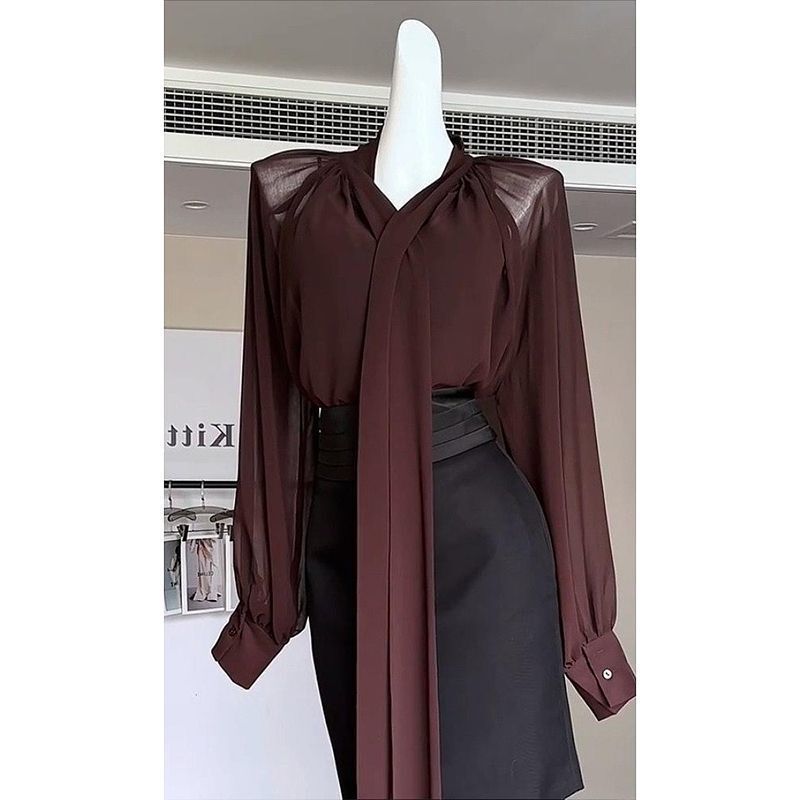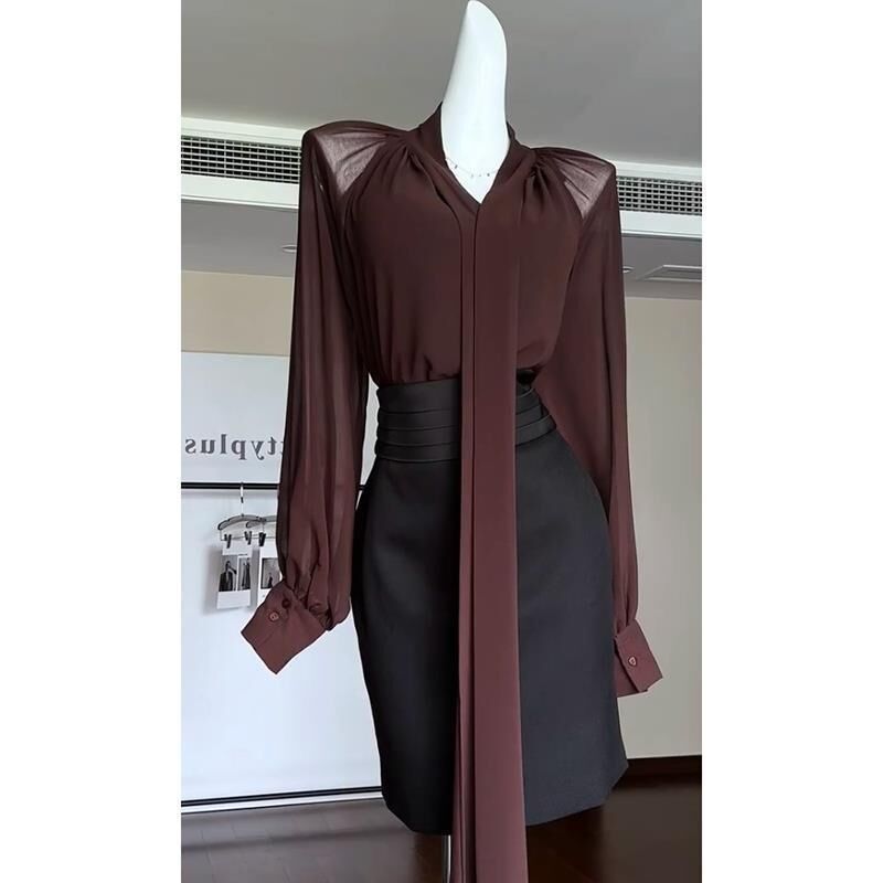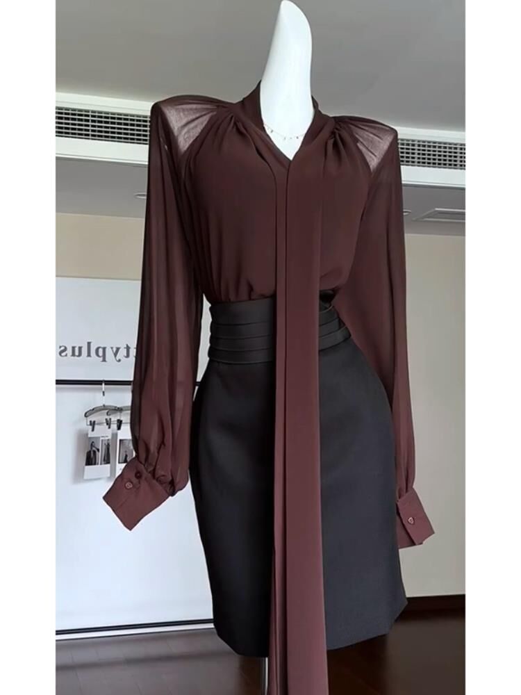 YSL飄帶雪紡上衣+壓褶窄裙(2件組)