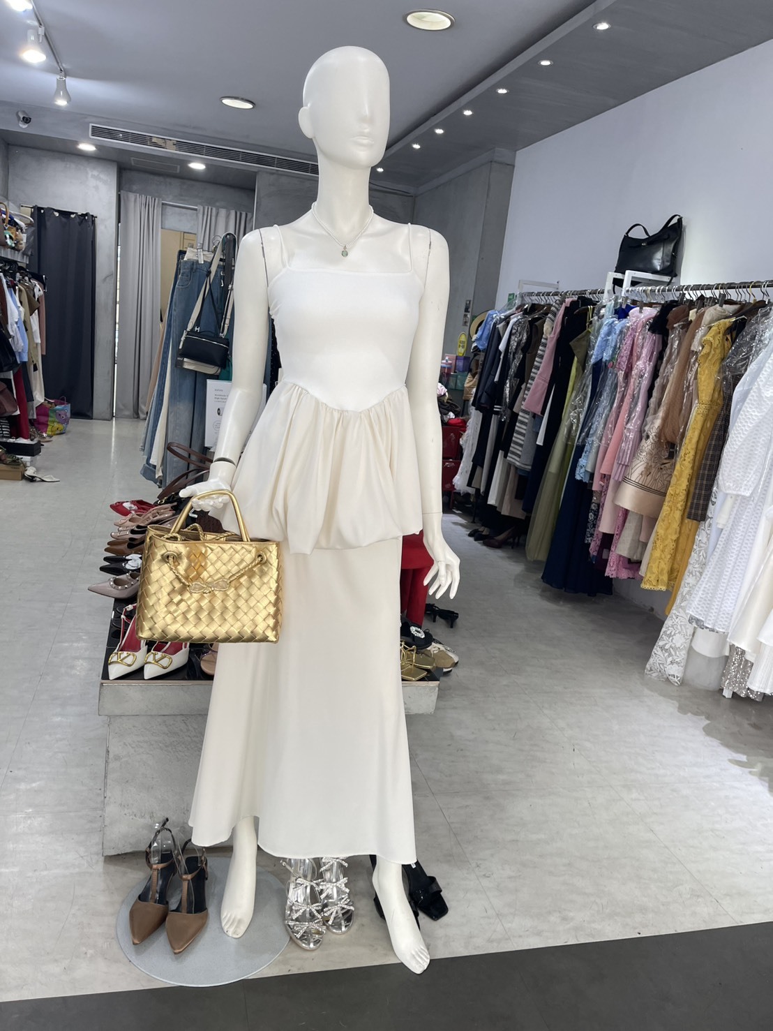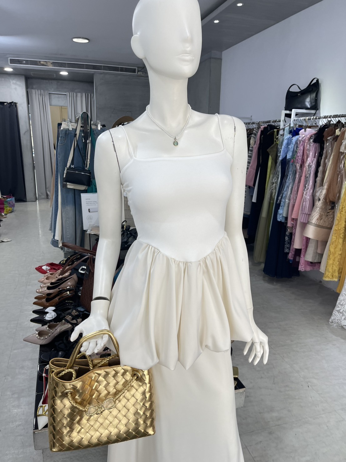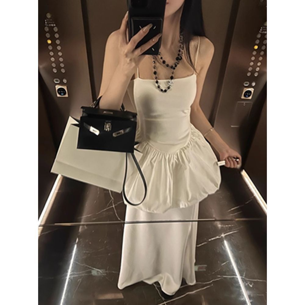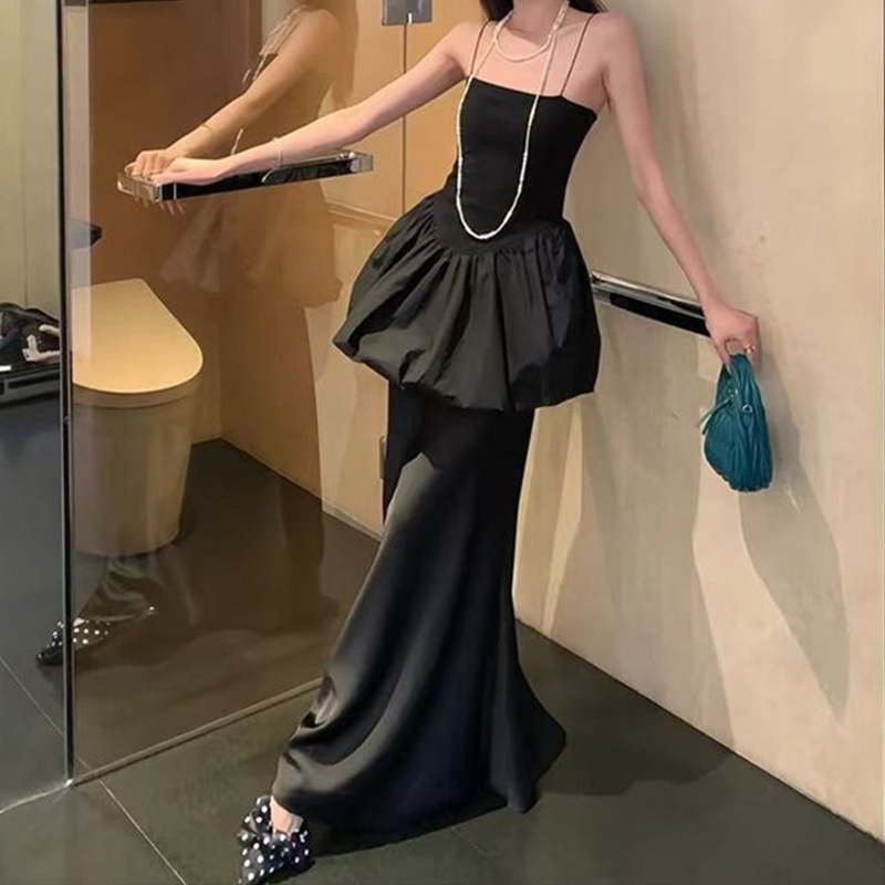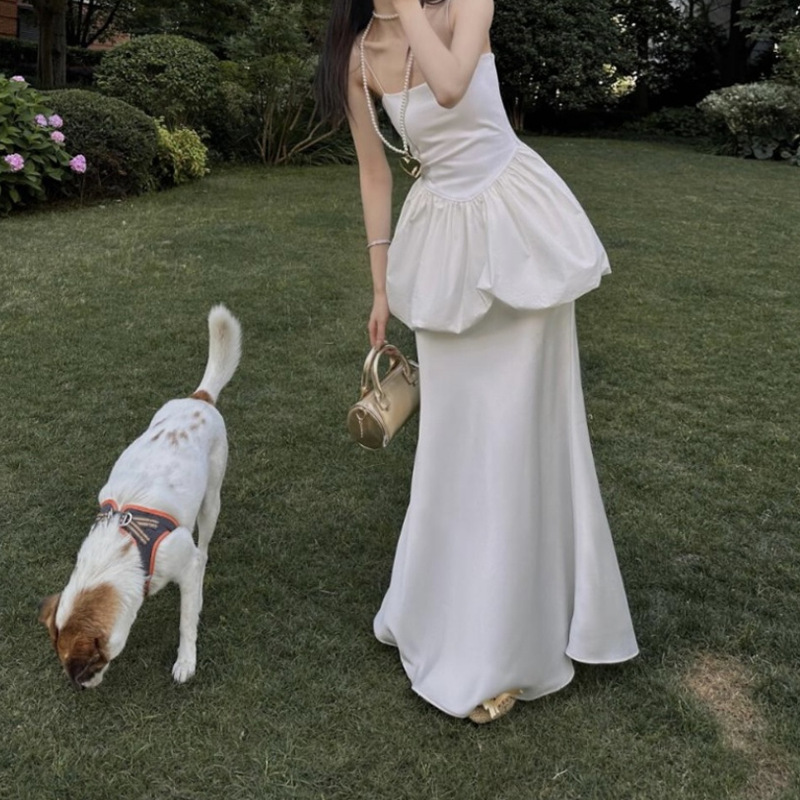 平口花苞上衣+緞面魚尾裙(2件組)(黑/白)