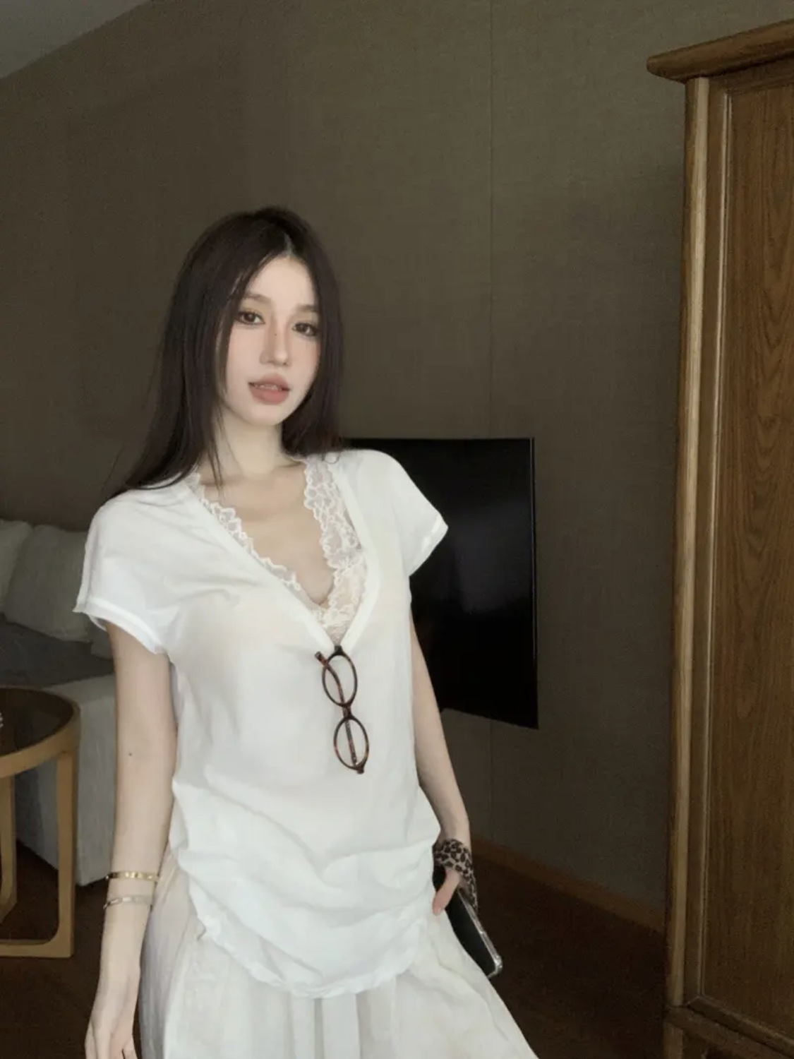 純欲休閒感 V領寬鬆T-SHIRT+蕾絲內搭(2件組)(黑/白)