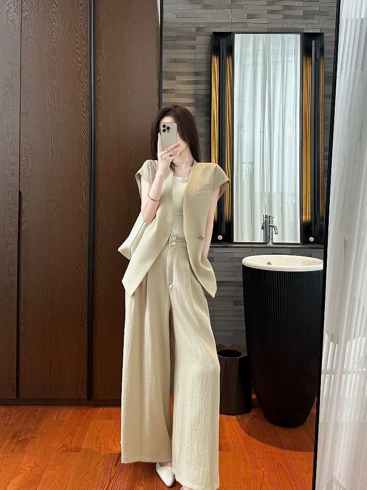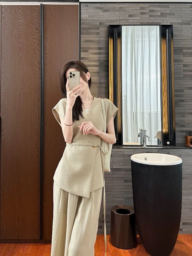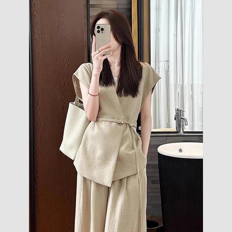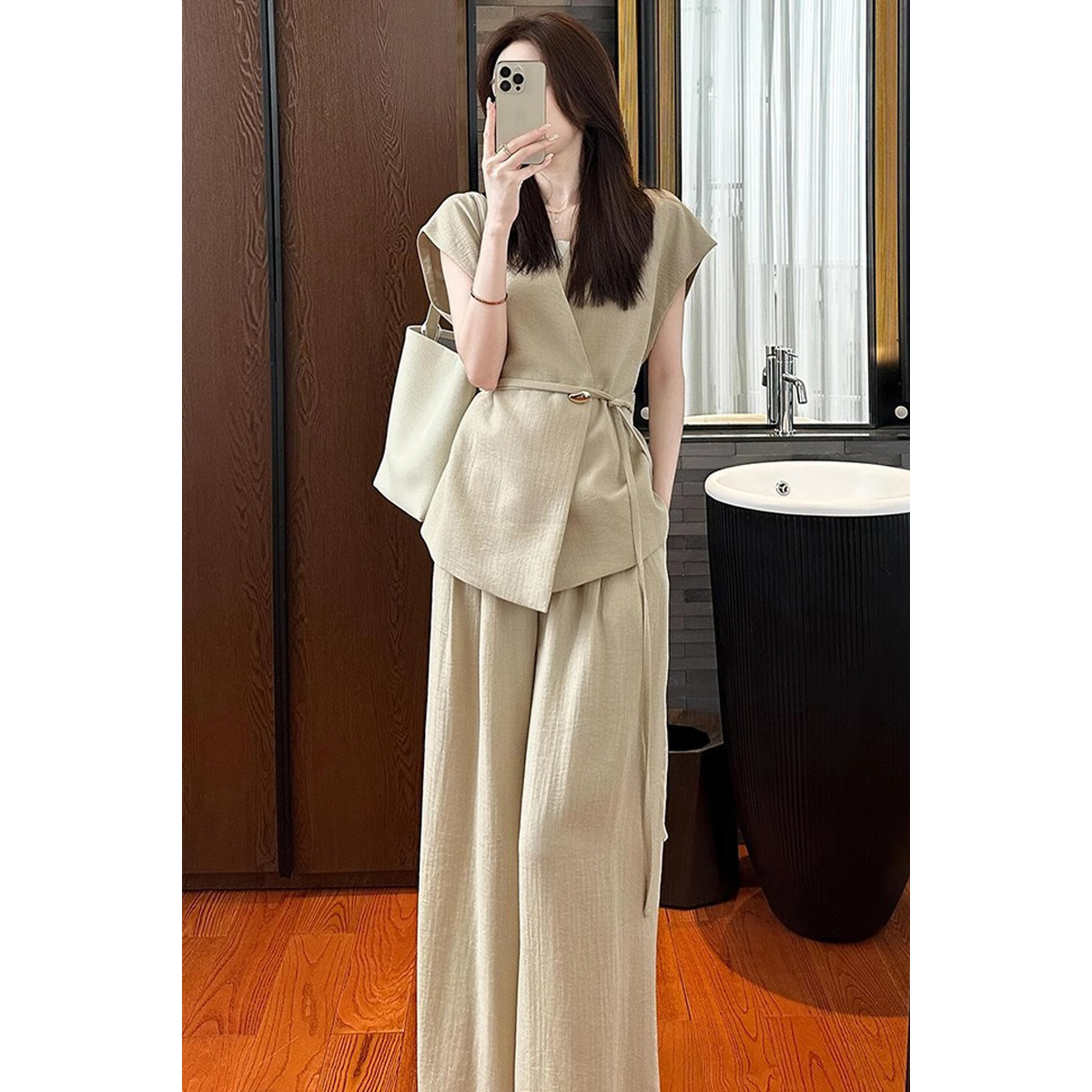 簡約幹練套裝 無袖綁腰上衣+高腰長褲(2件組)