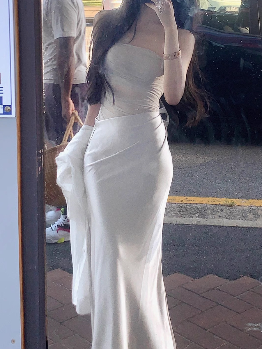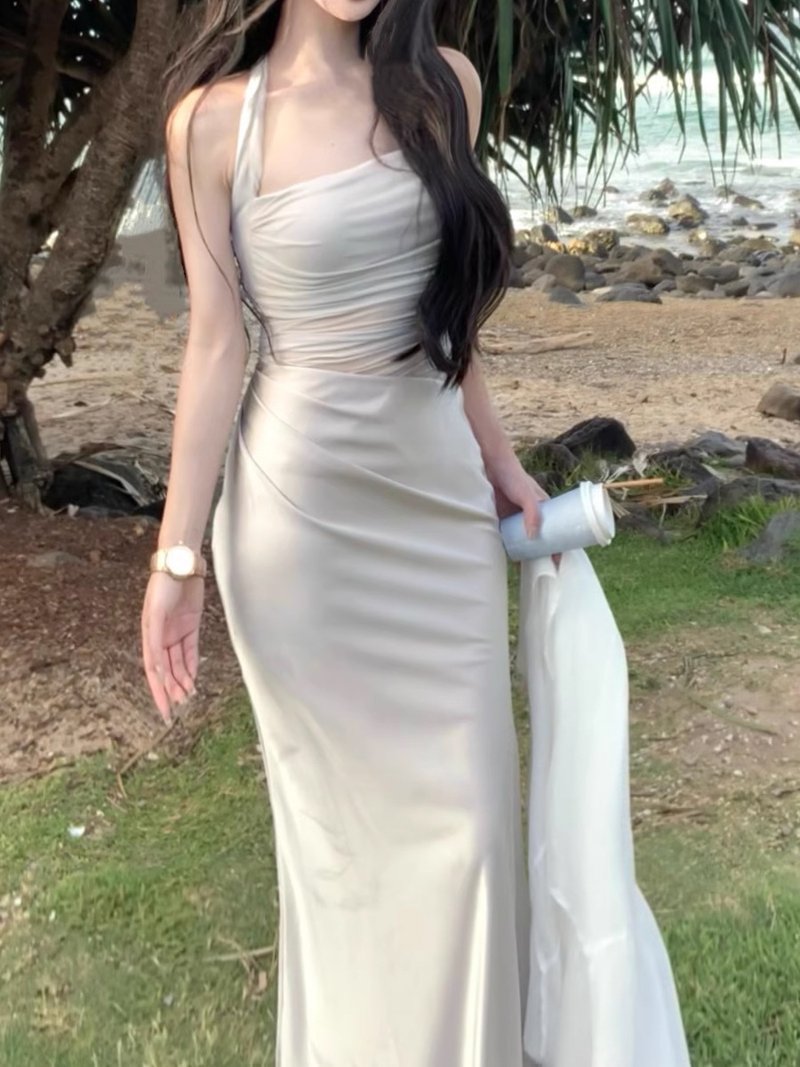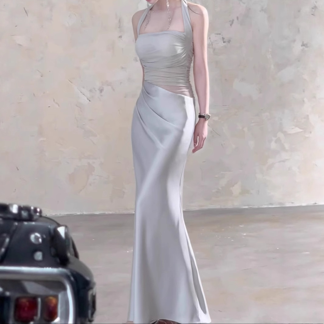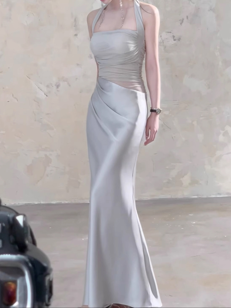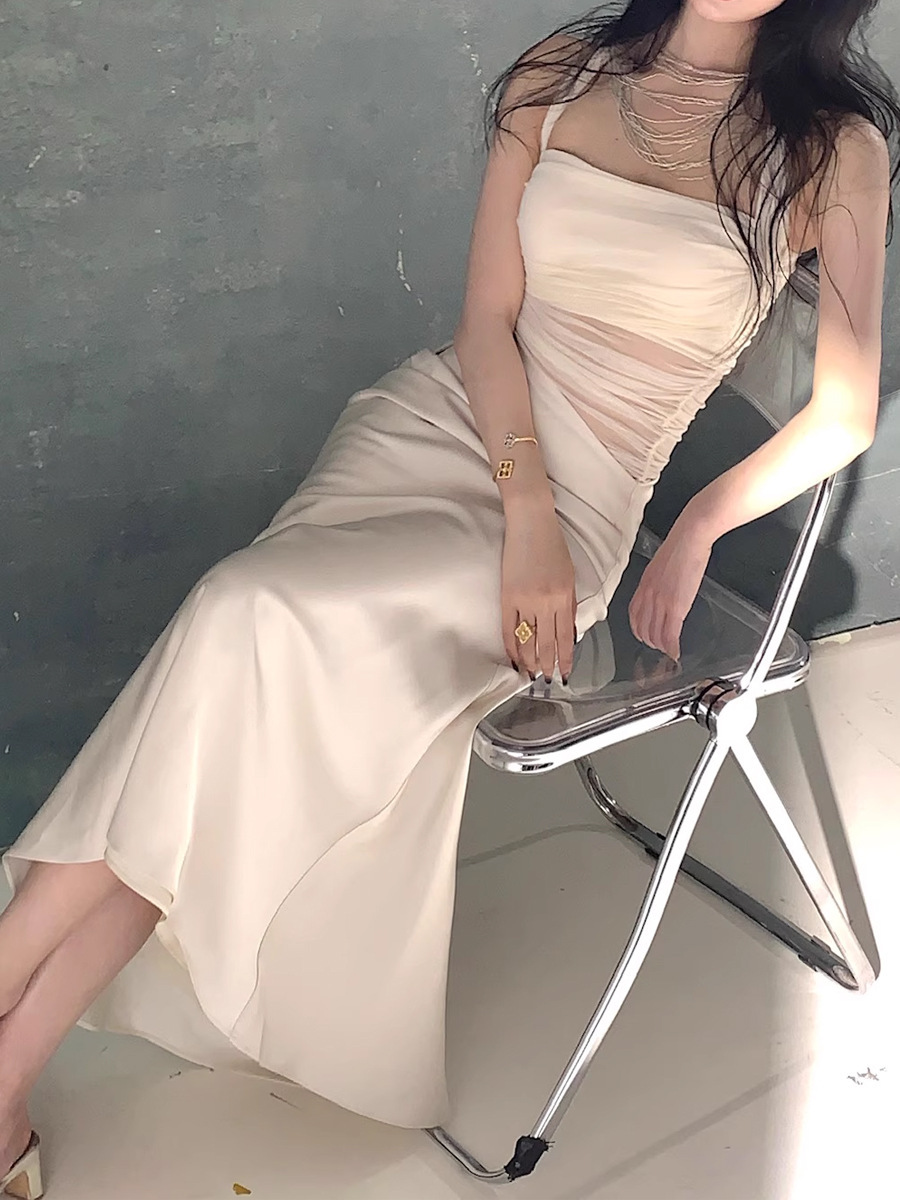 緞面網紗拼接 收腰魚尾洋裝(杏/銀)