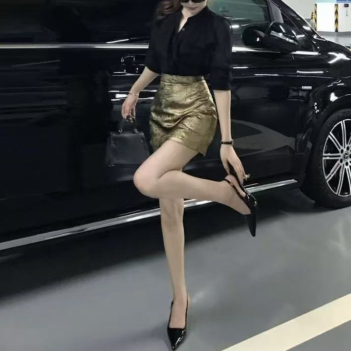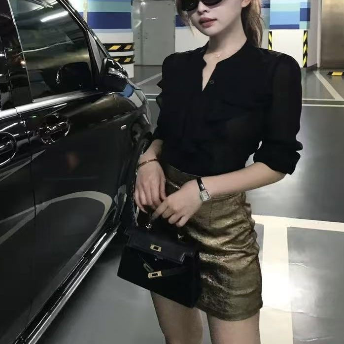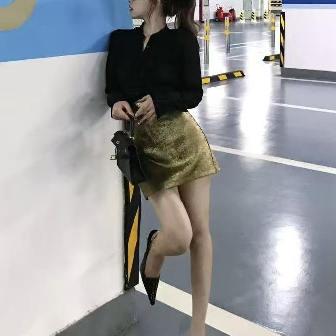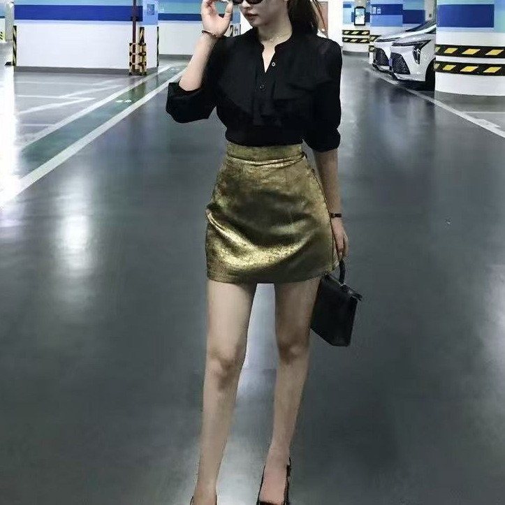V領襯衫+高腰金色短裙(2件組)