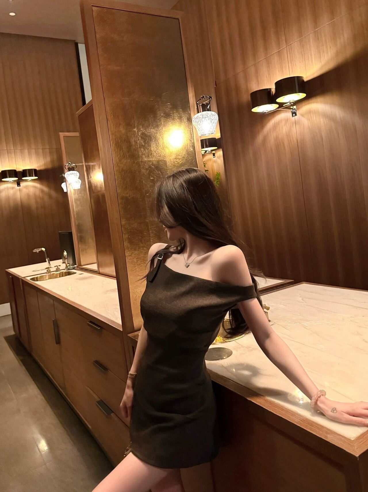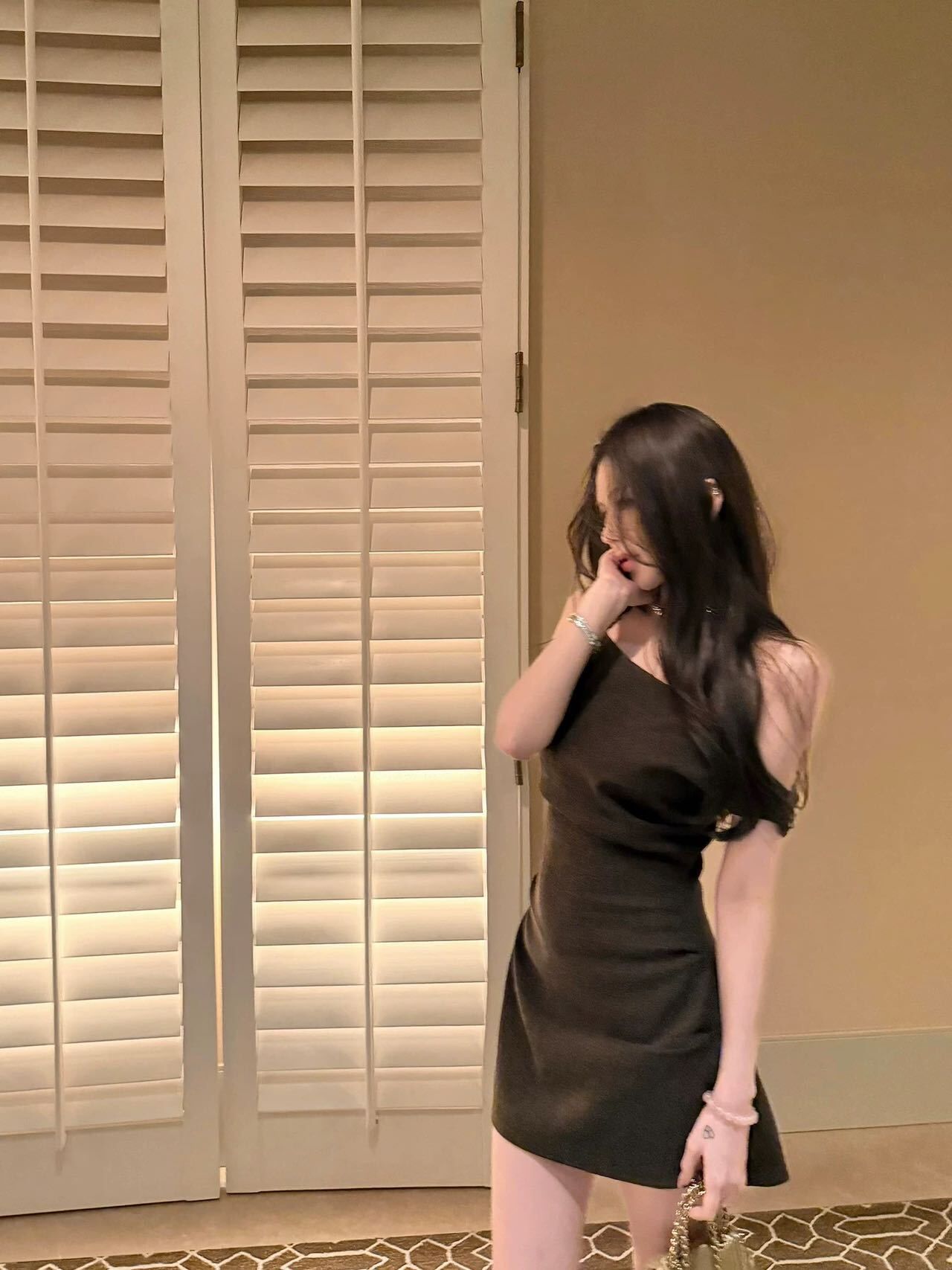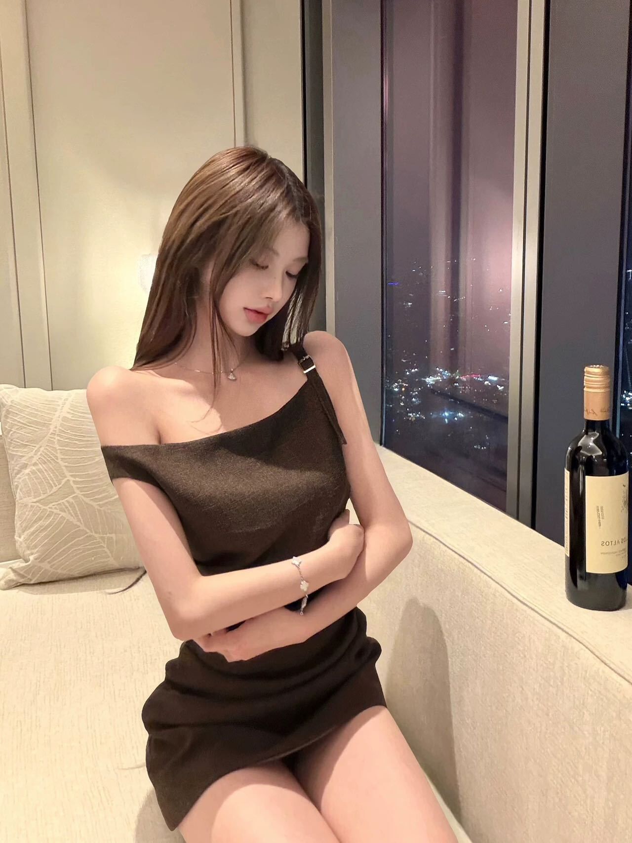 質感咖茶色 斜肩短洋裝