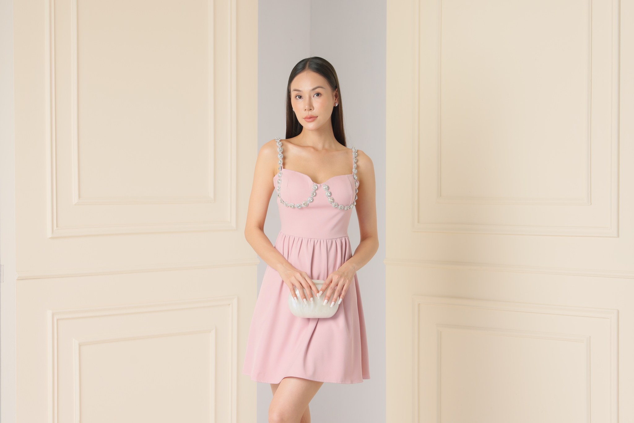 這款精緻柔美的小洋裝散發著甜美魅力。優雅的粉嫩色調搭配水鑽細帶點綴,為整體造型增添迷人氣質。剪裁修飾身形,收腰設計賦予女性輕盈曲線。無論是日常或特殊場合,都能穿出自信迷人的氣質。