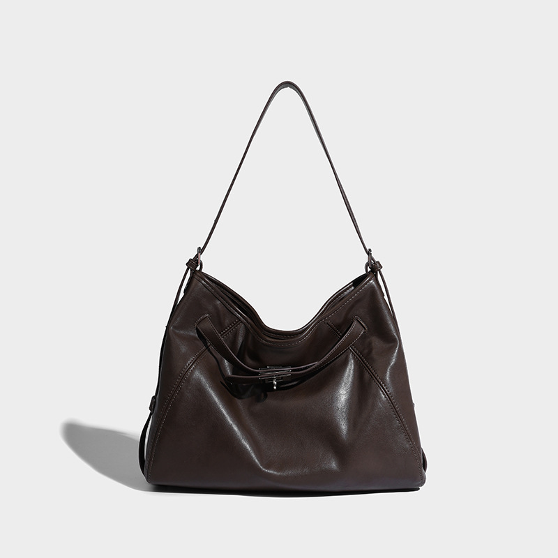 這款包袋款式簡單大方,呈現低調奢華的風格。選用頂級牛皮為材質,質感飽滿柔軟。肩背設計使用,稱手好背,無論上班或是外出都能輕鬆駕馭。中性色調的黑/咖兩色選擇,百搭實用,適合多種場合配搭。簡單造型搭配金屬飾扣點綴,增添時尚感。整體包款體積適中,容量足夠日常物品,展現淡雅隨性的都會風格。