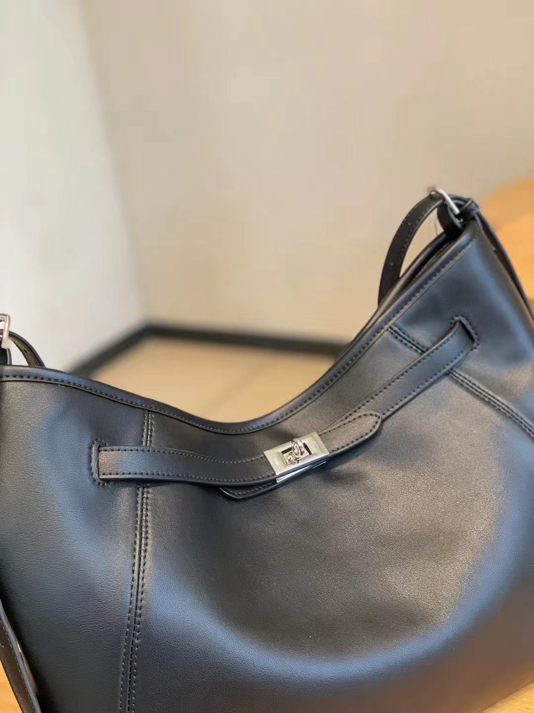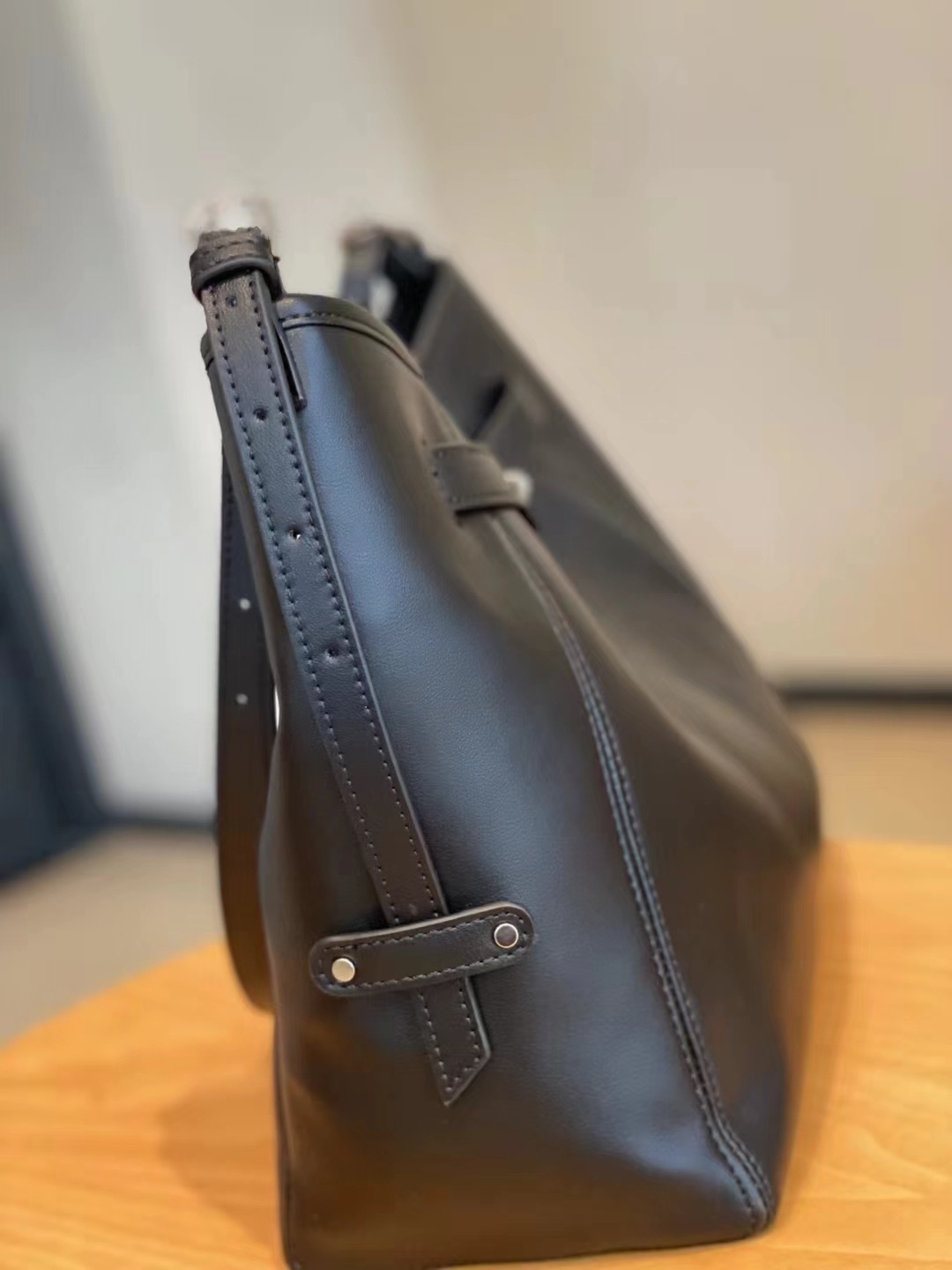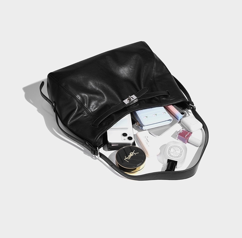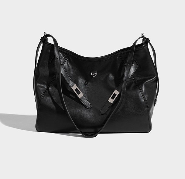簡約大器的黑色牛皮質感,展現高雅低調的時尚風格。寬敞的內部空間可裝載生活用品,非常實用。 金屬飾釦點綴,增添精緻細節。肩背側背兩用設計,提供多元搭配。 牛皮面料耐用耐磨,經久不壞。無論上班或休閒出遊,都能稱為您不可或缺的優雅好夥伴。