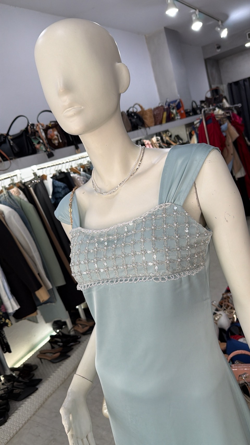 手縫珠片 緞面方領小禮服
