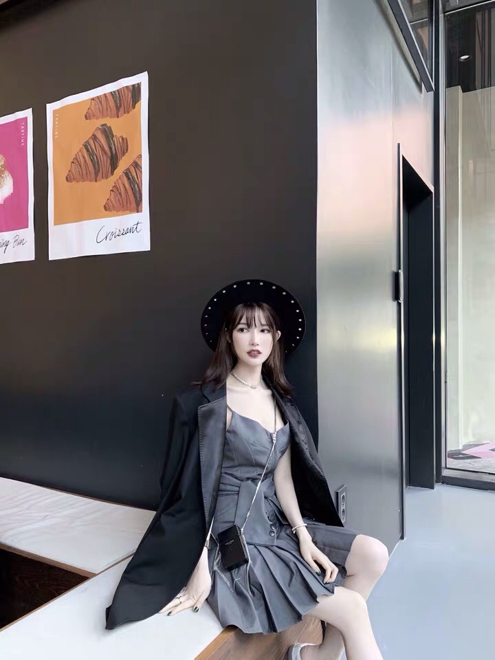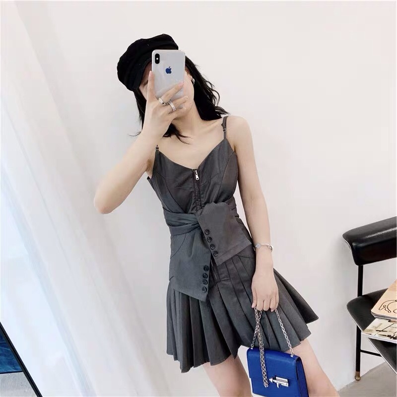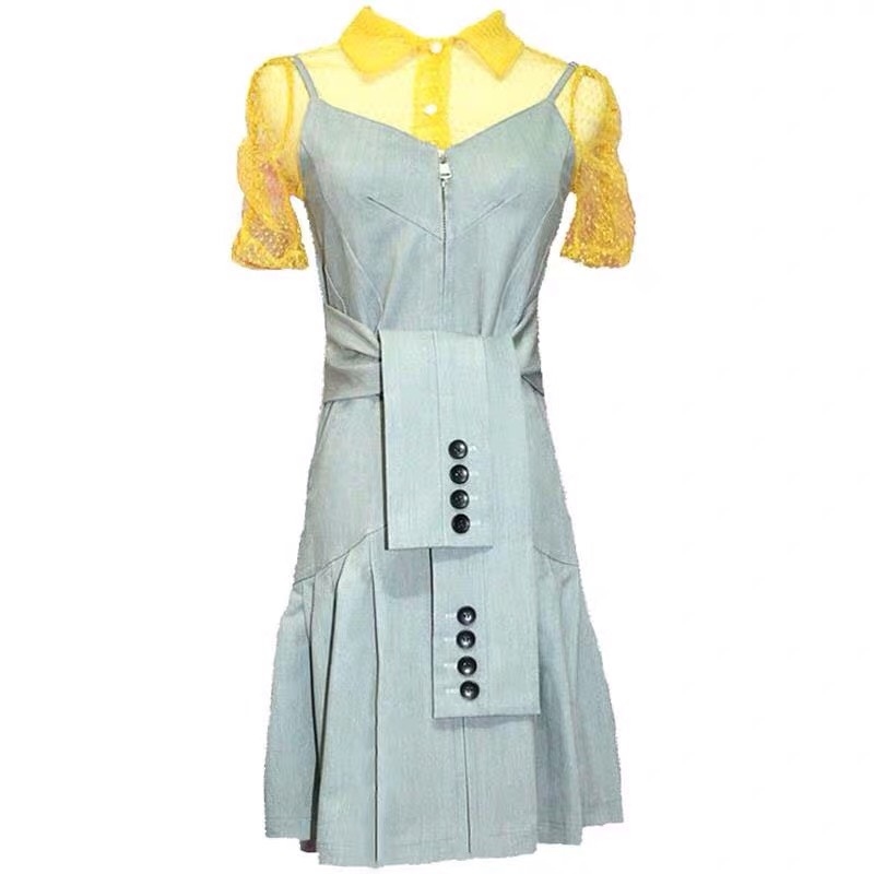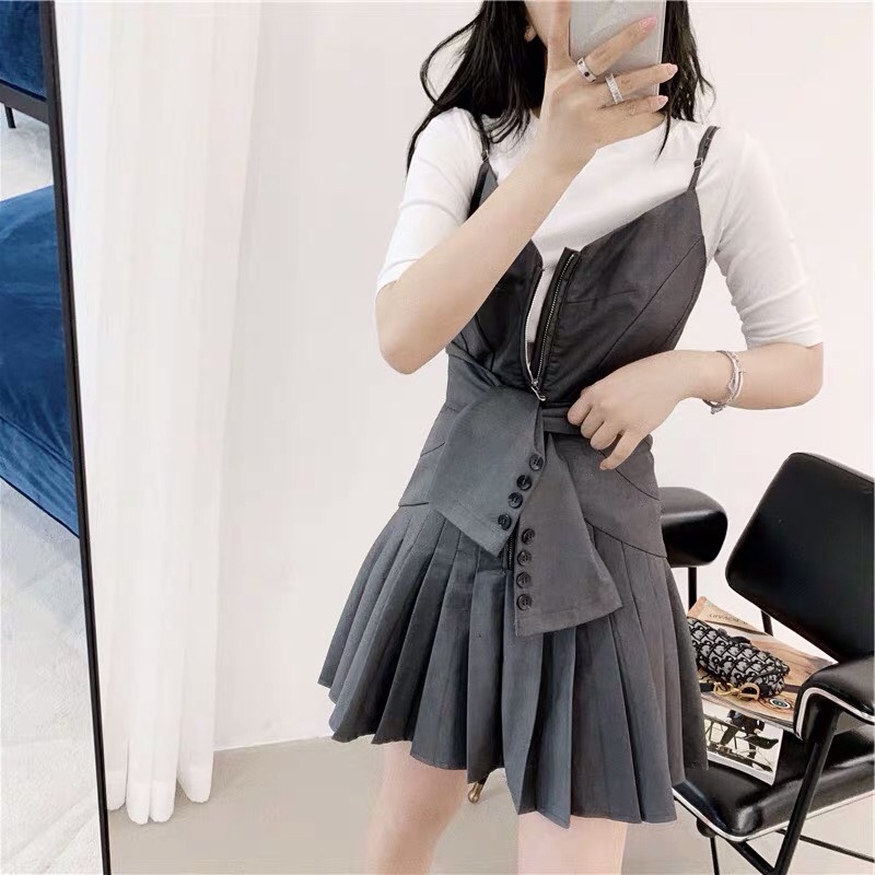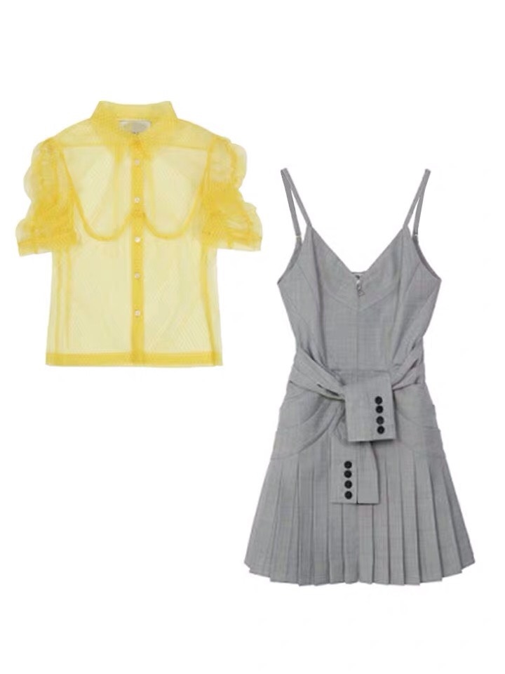 鞠婧禕同款黃色襯衫+灰色系收腰百褶裙套裝