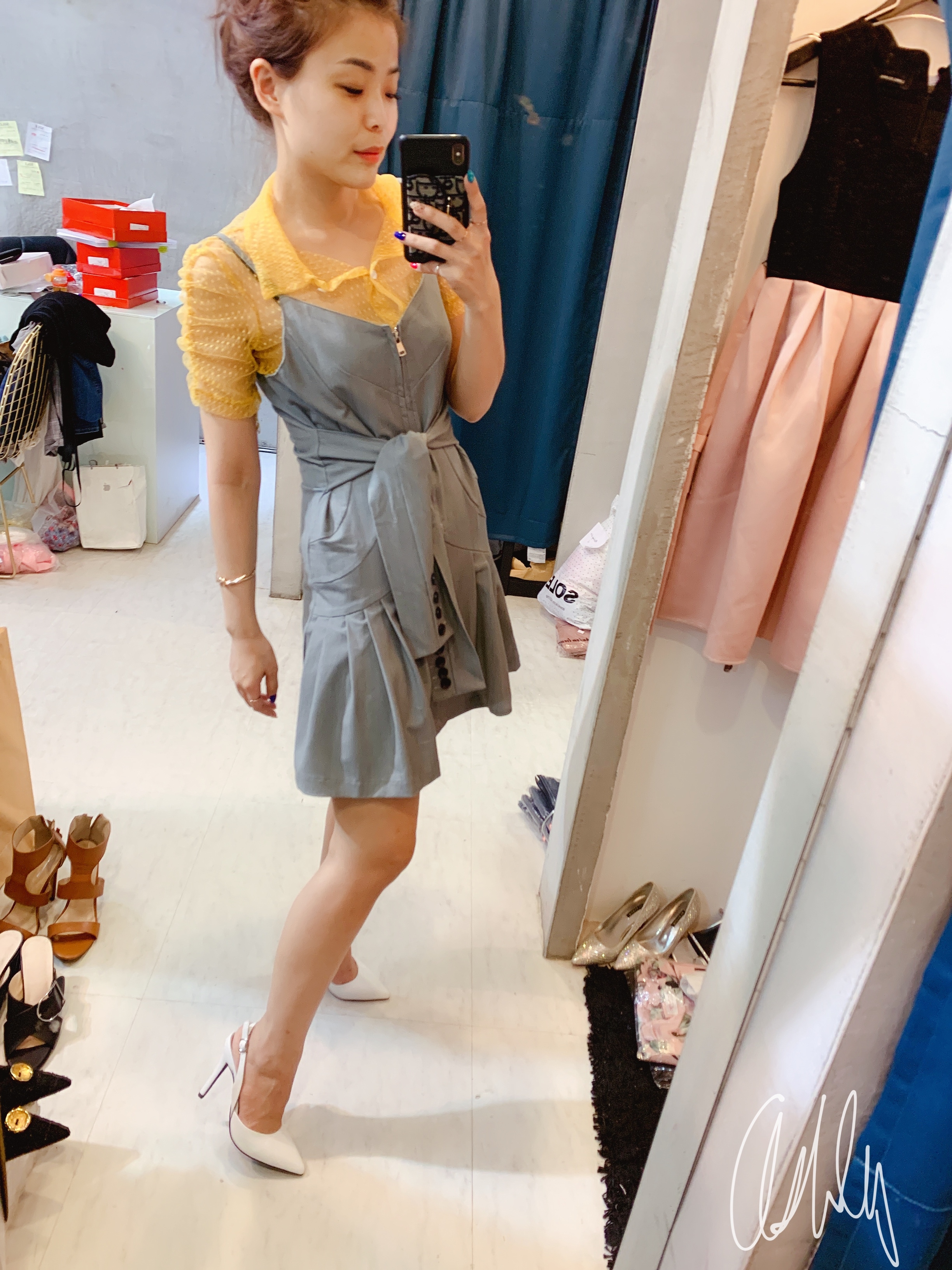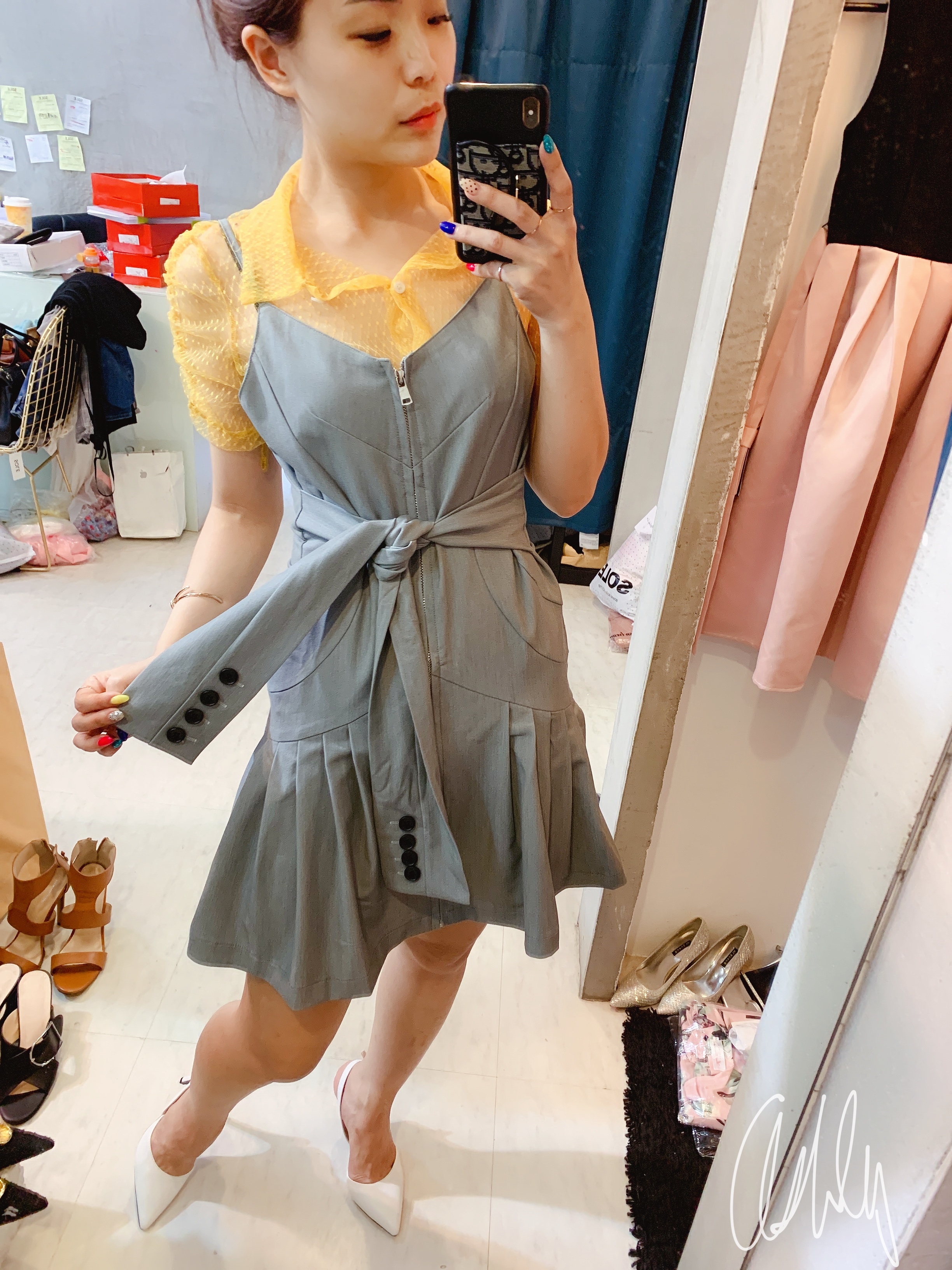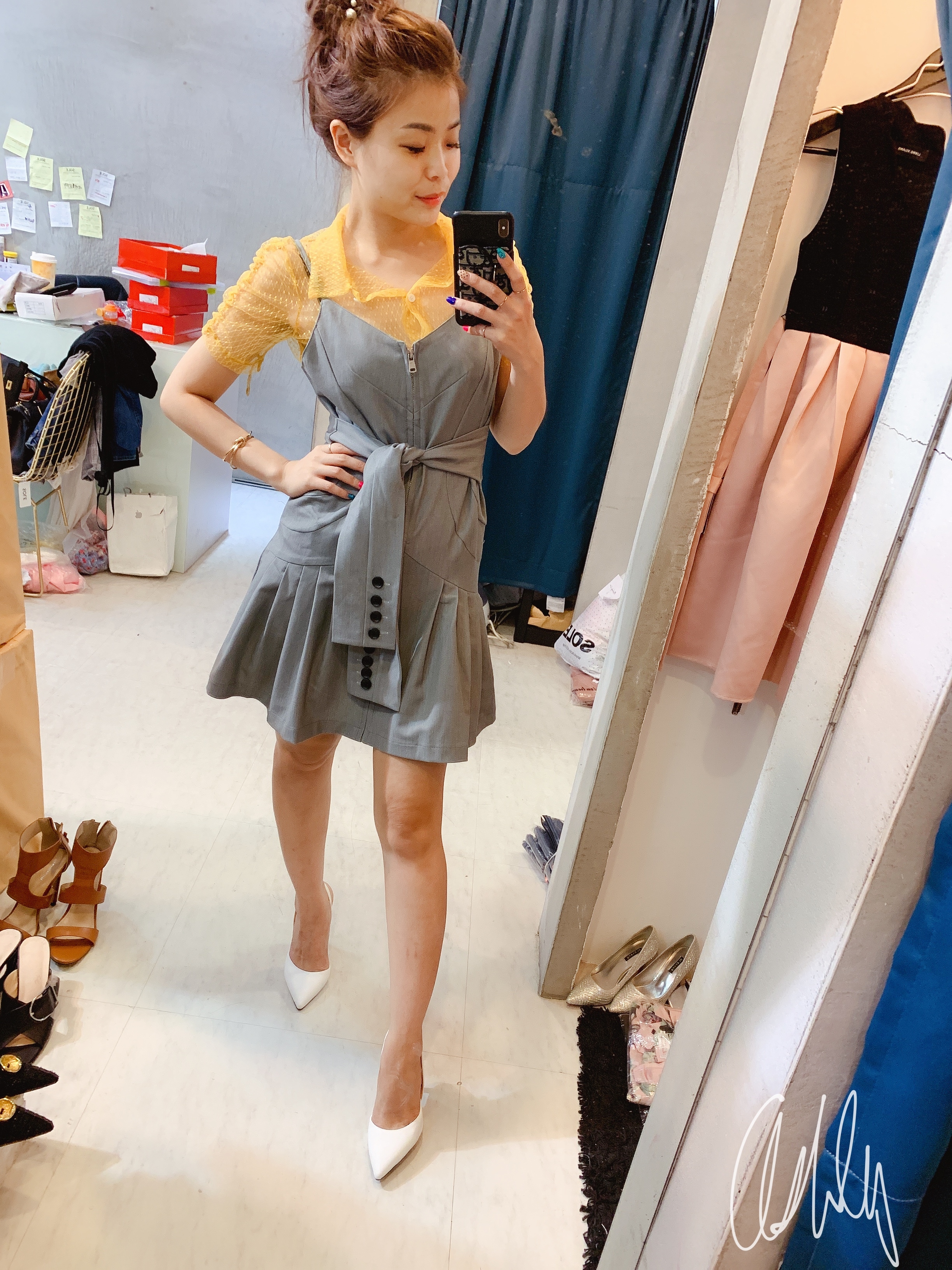 鮮艷的黃色襯衫搭配優雅的灰色百褶裙,展現時尚又清新的風格