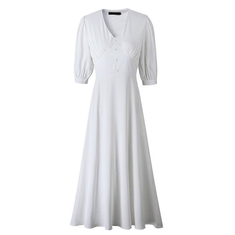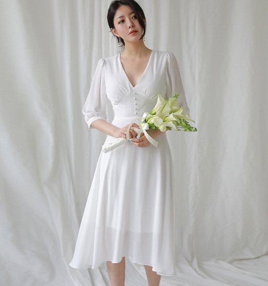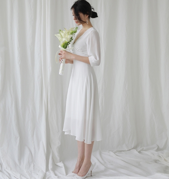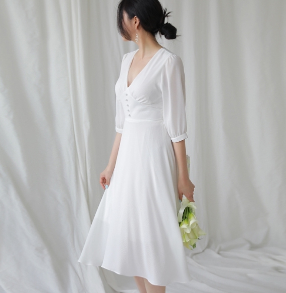 V領5分袖 法式雪紡洋裝