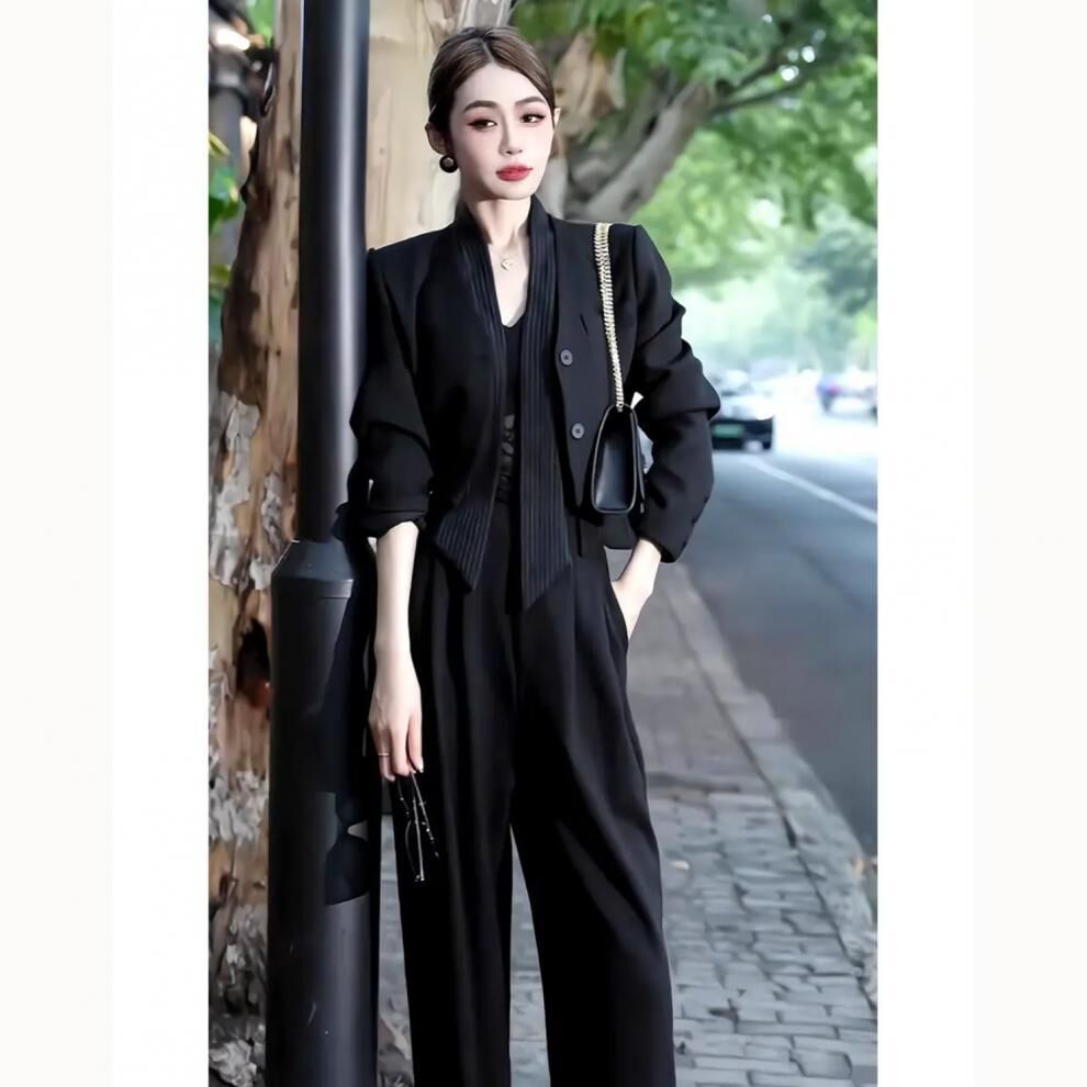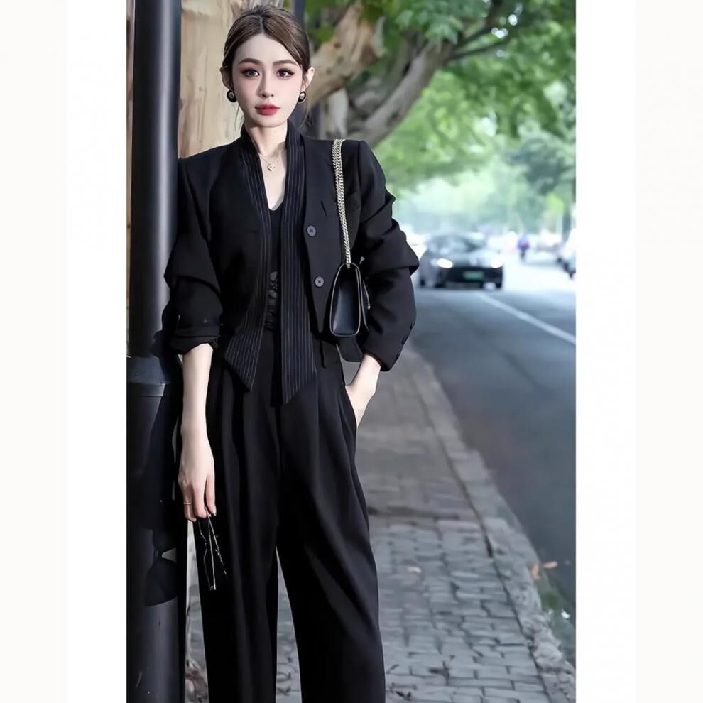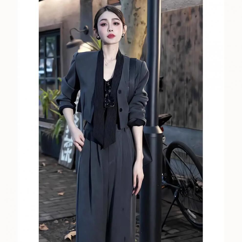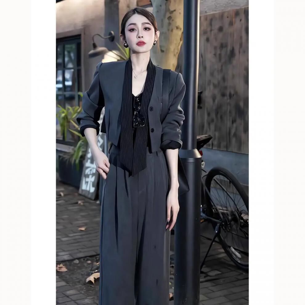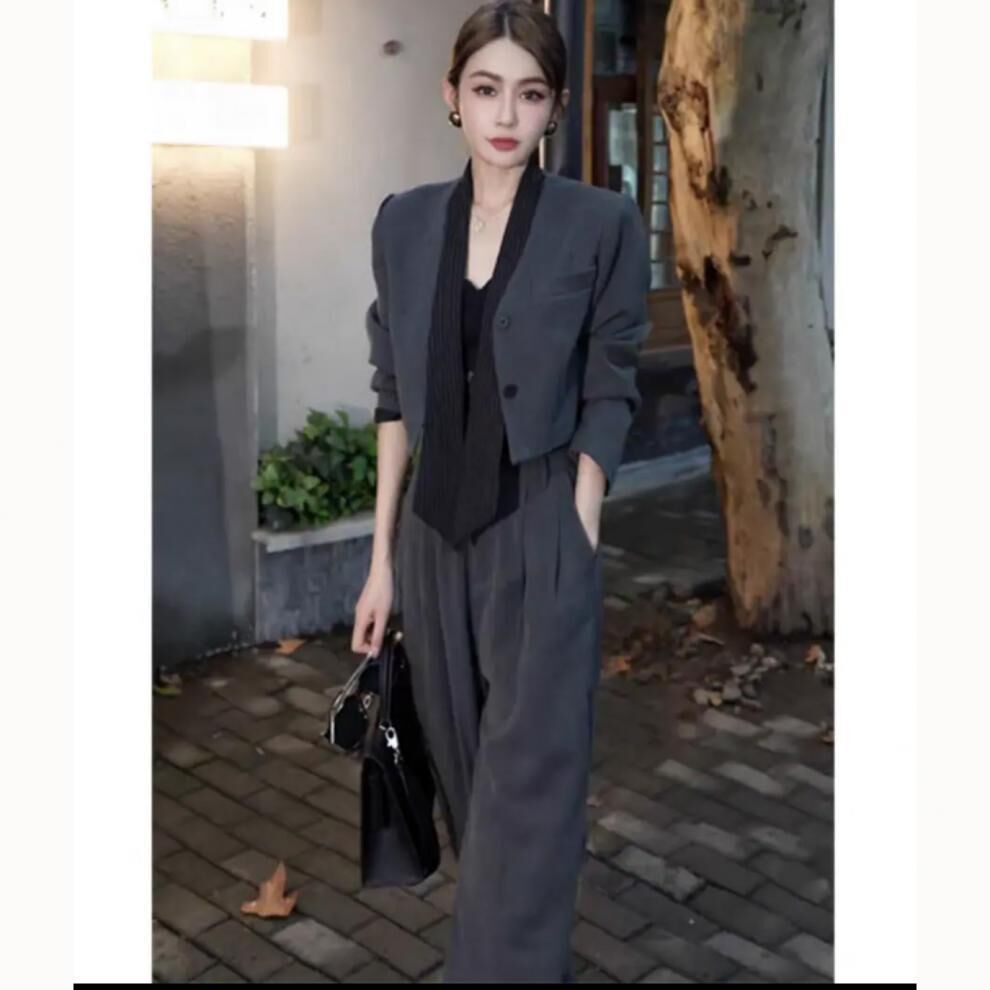 短版外套+高腰褲(2件組) (灰/黑)