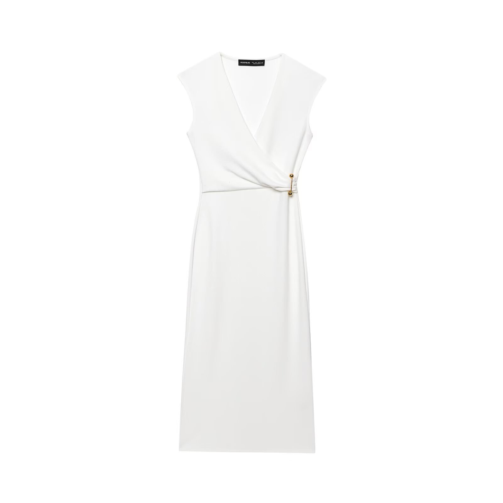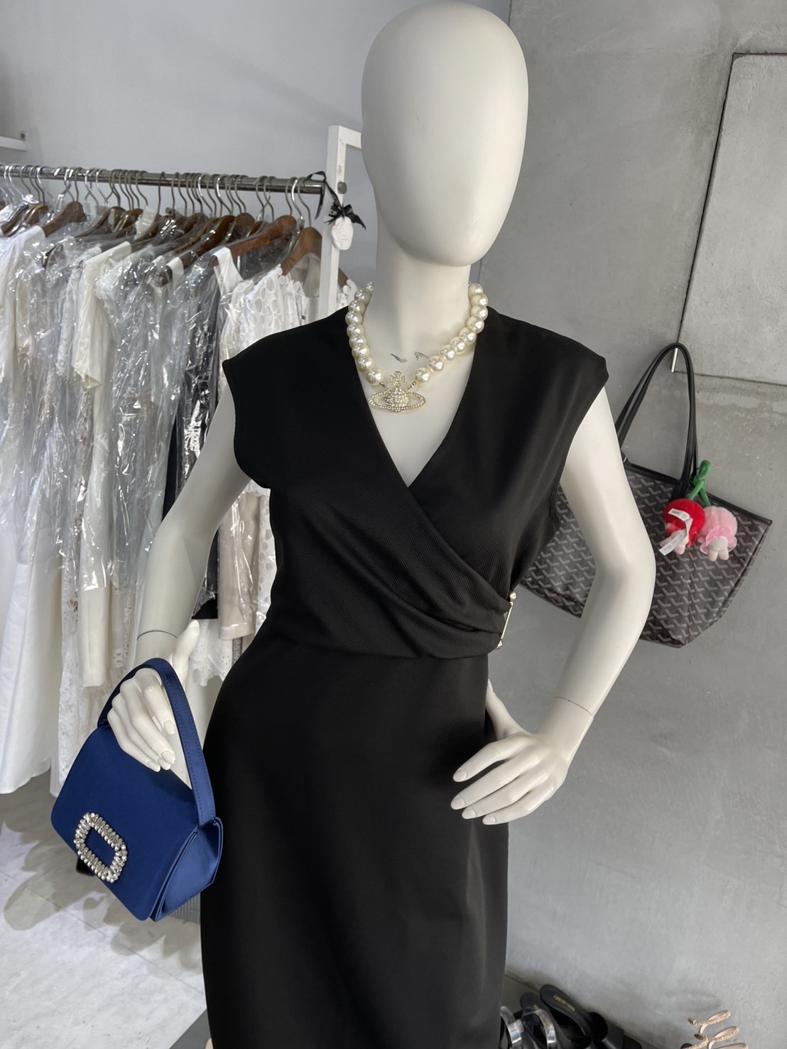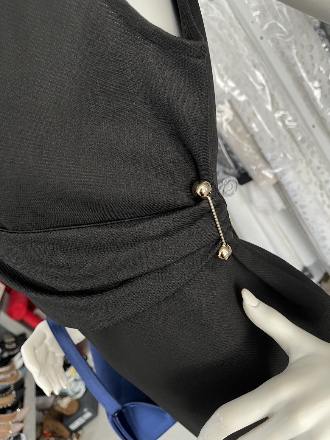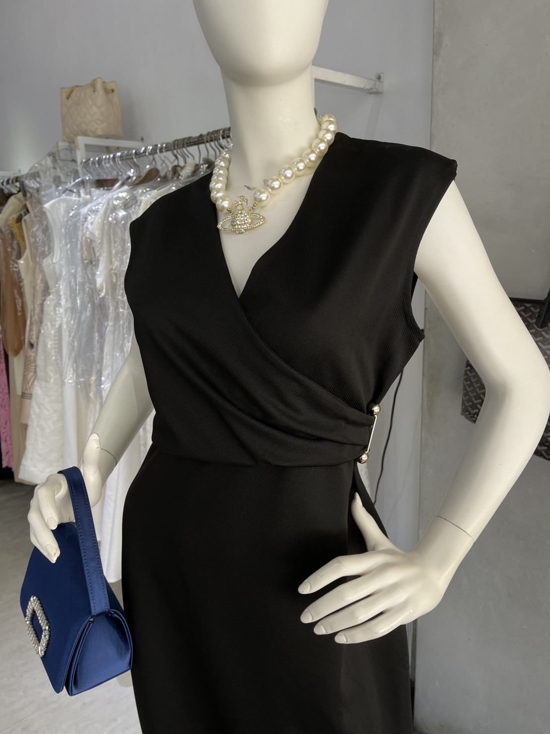 扭轉收腰 別針裝飾V領長洋裝(黑/白)
