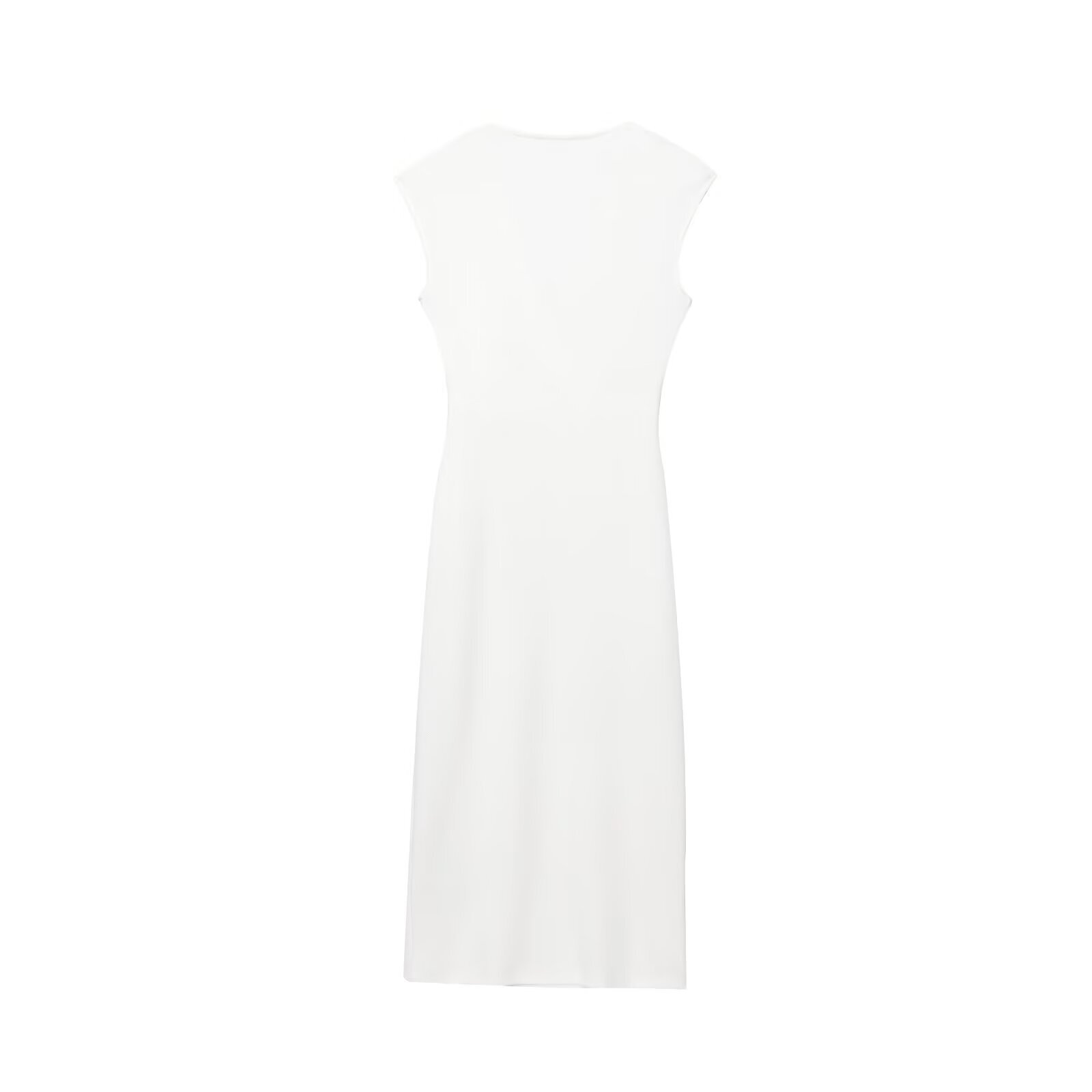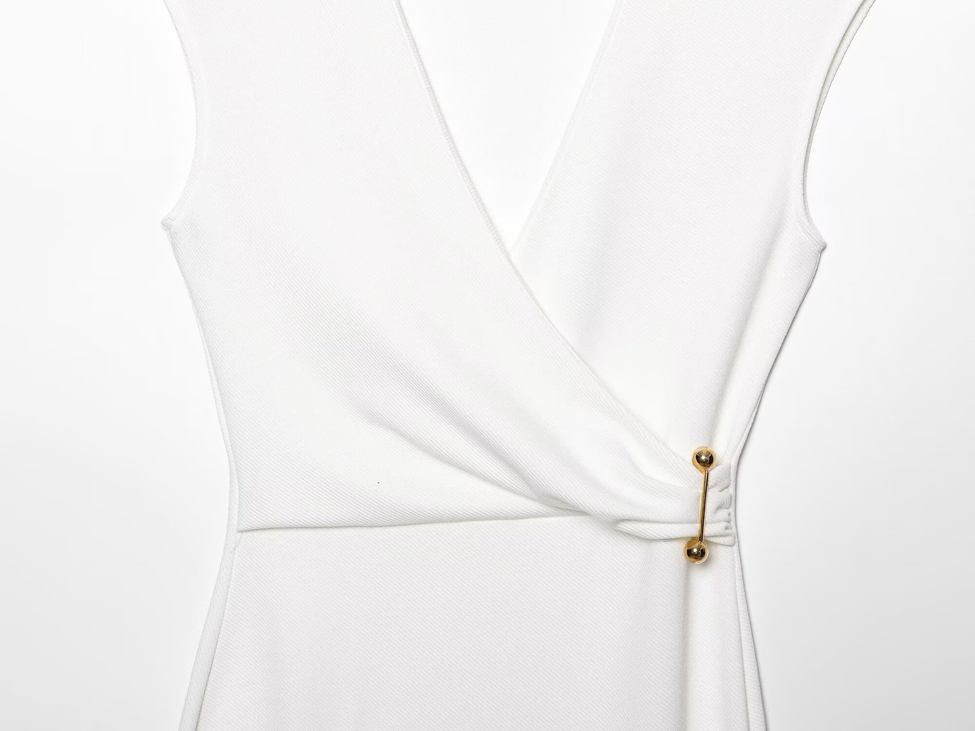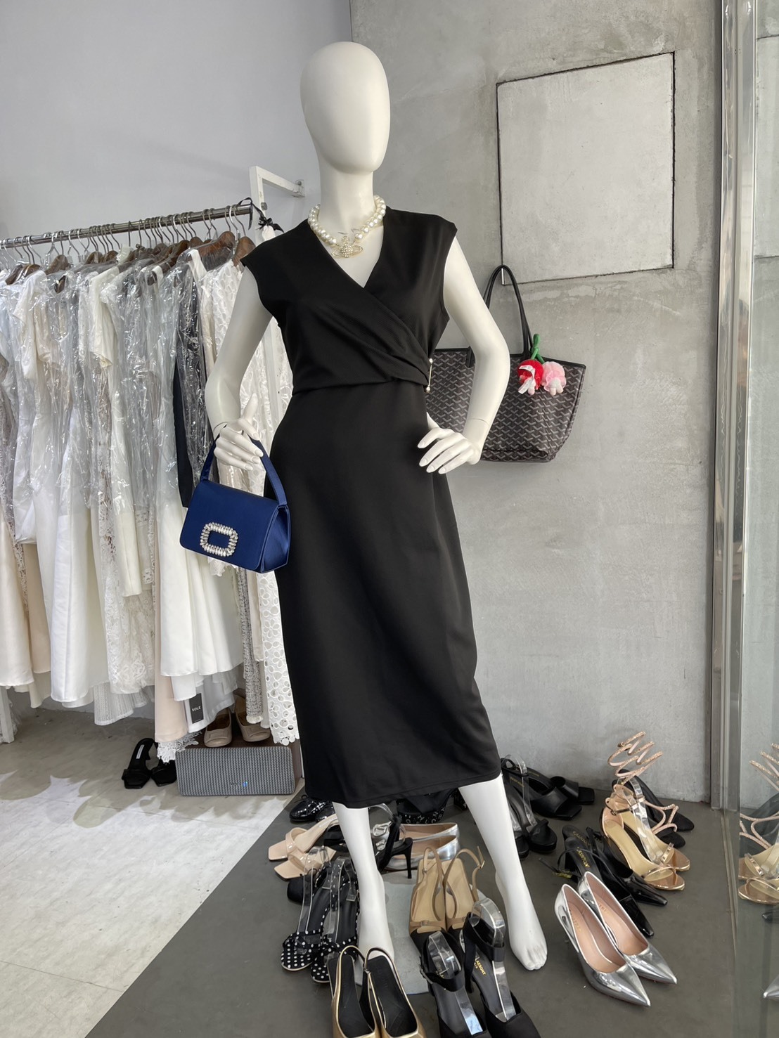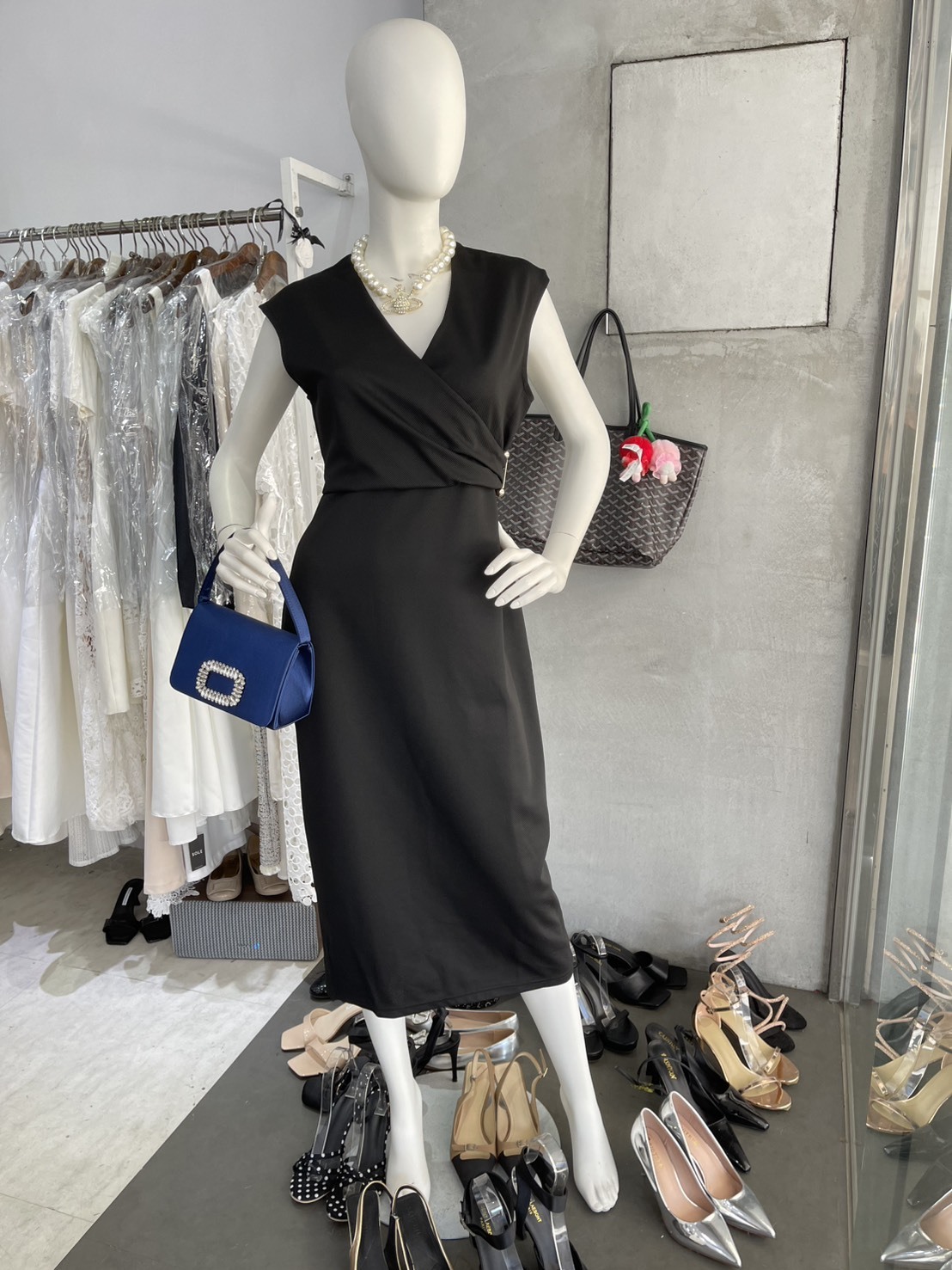 扭轉收腰 別針裝飾V領長洋裝(黑/白)