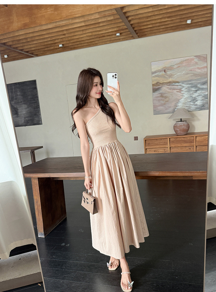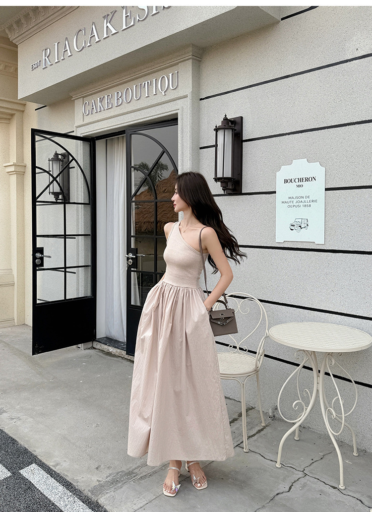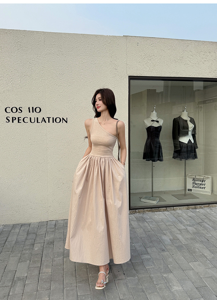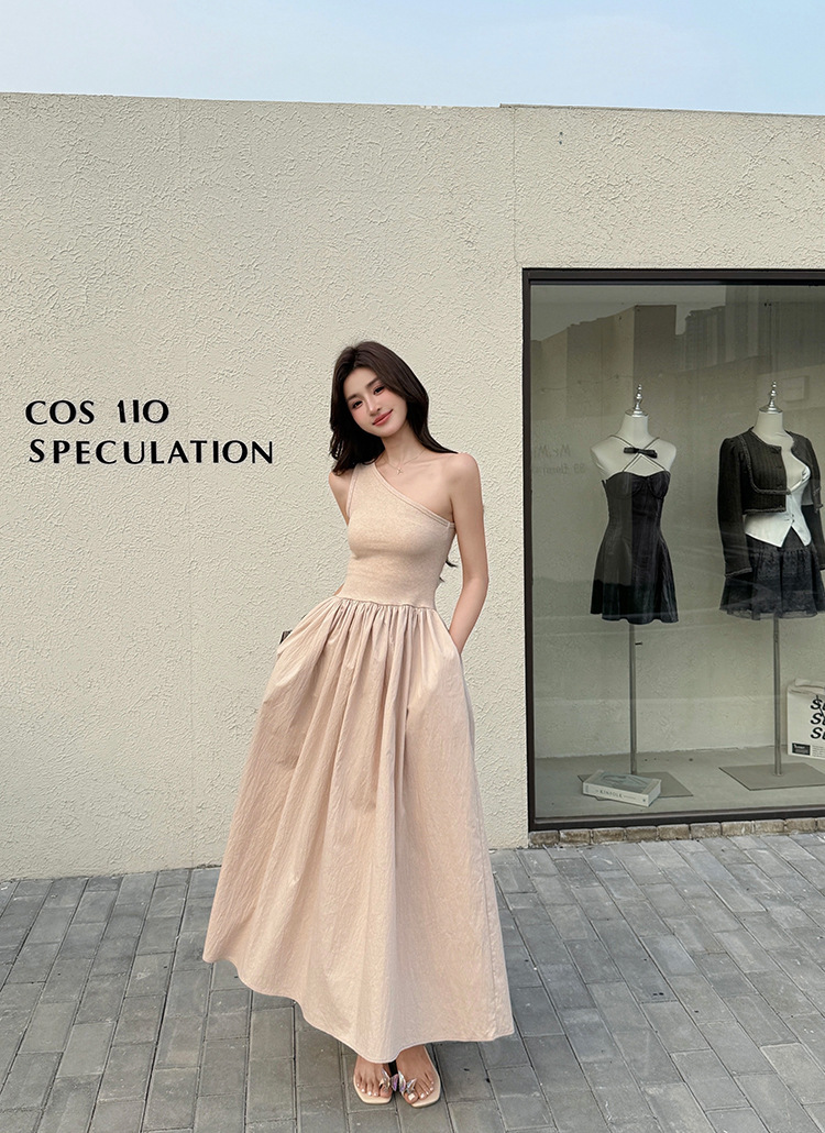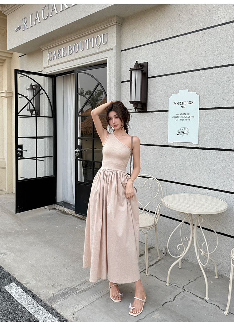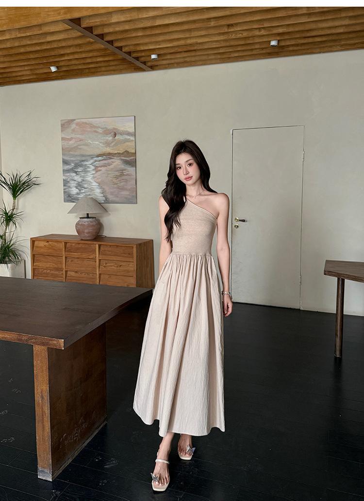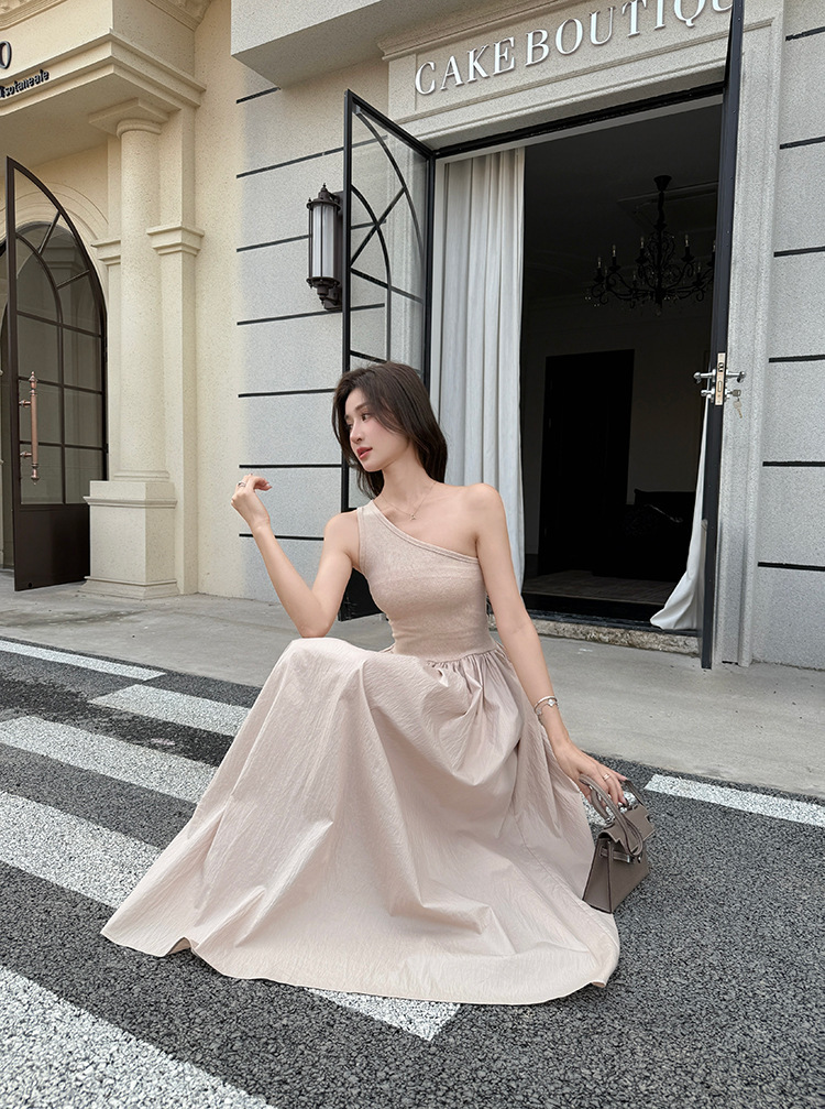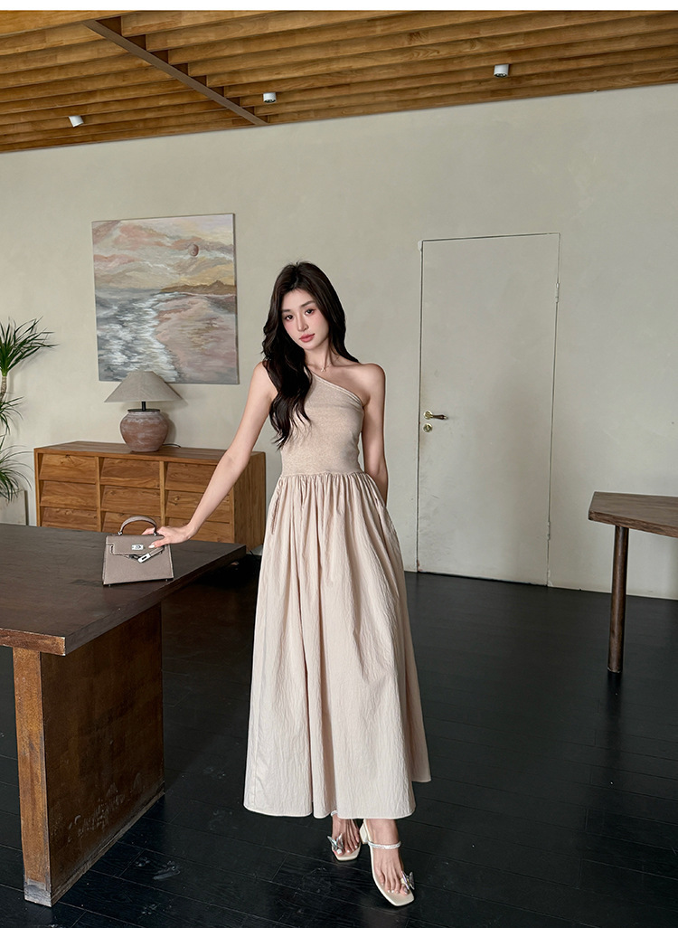 斜肩收腰 大裙襬洋裝(杏/黑)
