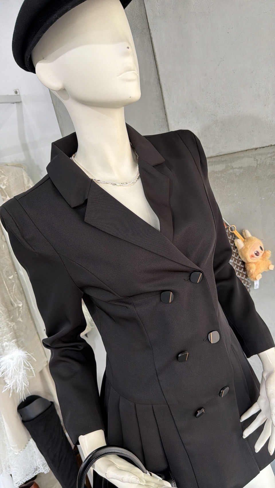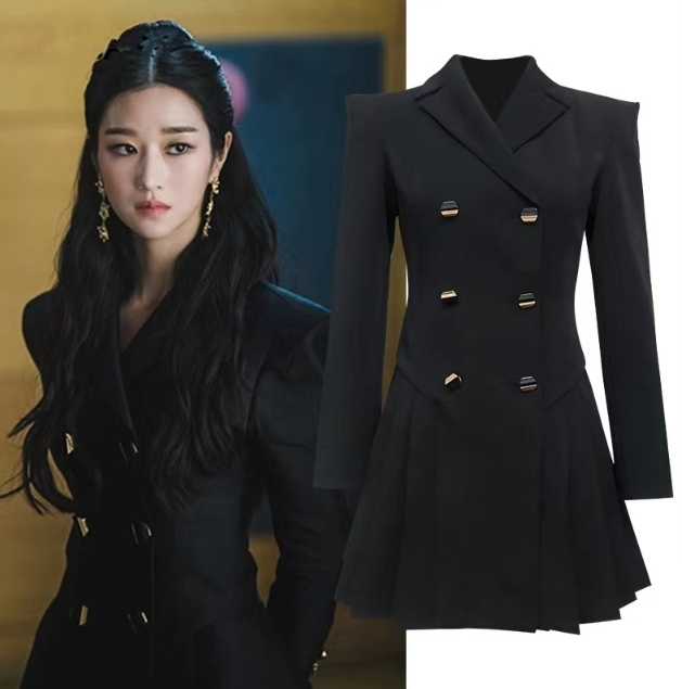 嚴肅盛典時尚搭配首選 這款徐睿知同款洋裝展現獨特復古雅致。精緻雙排扣設計,營造優雅俐落的西裝剪裁。挺括的百摺設計,營造出蓬鬆飄逸的剪裁。柔軟的面料質地,帶來舒適貼身的穿著體驗。無論是出席正式場合或是閃亮活動,這件洋裝都能成為妳的時尚焦點。
