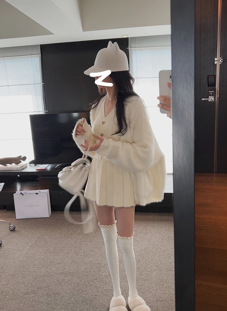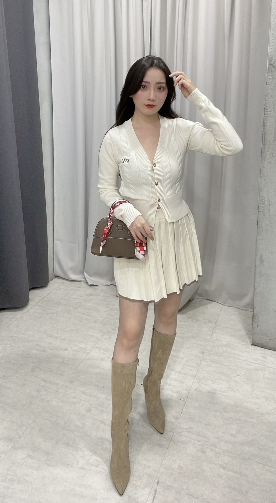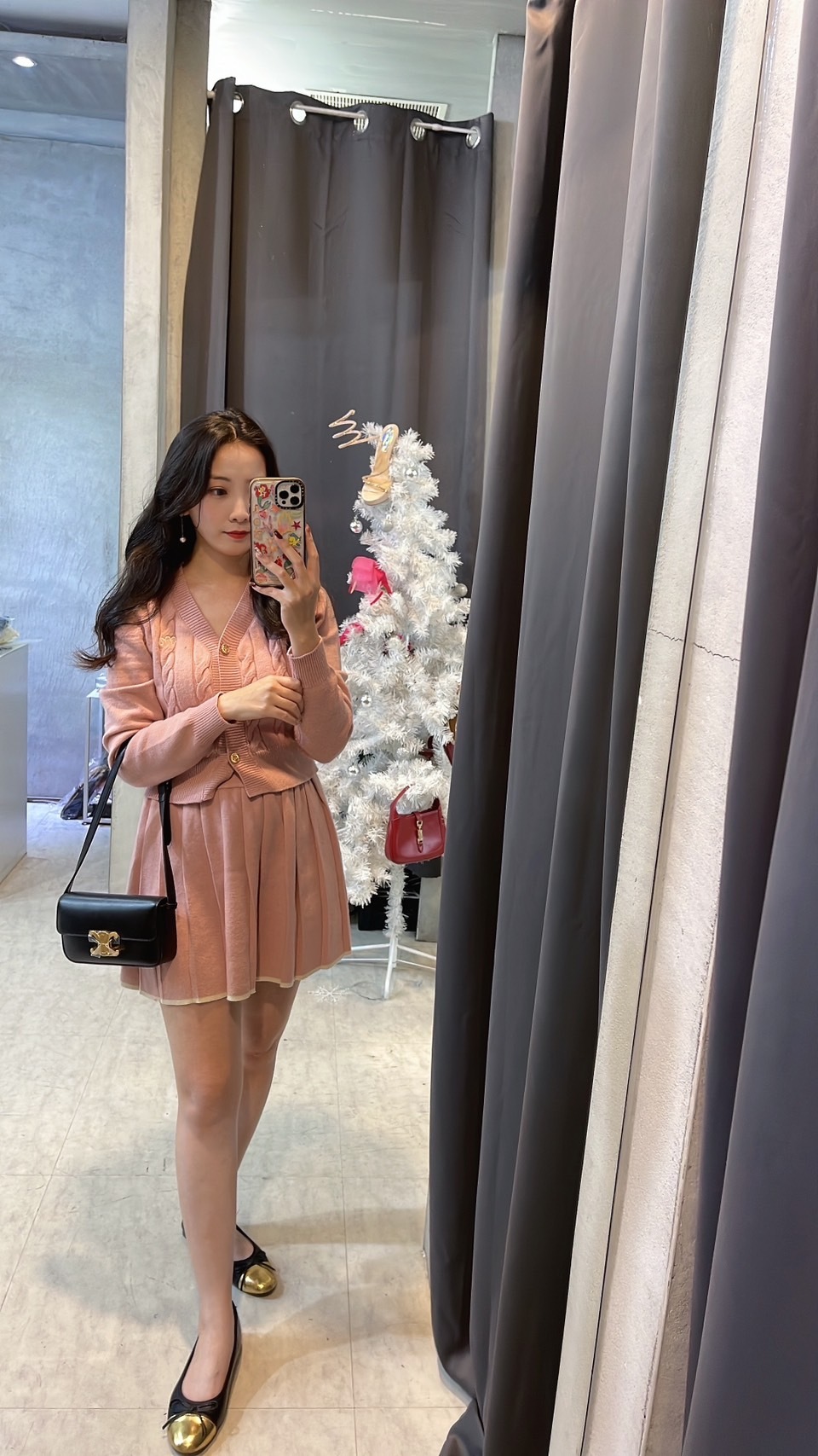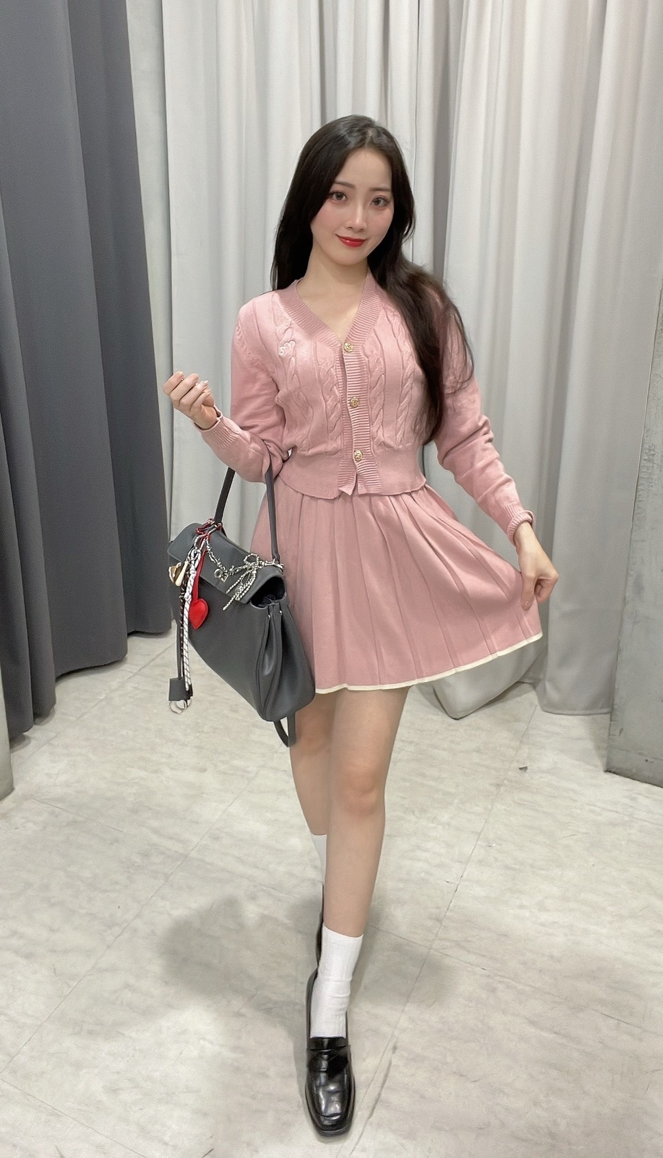 壓褶短裙+針織上衣(套裝)(灰綠/咖/米/粉)