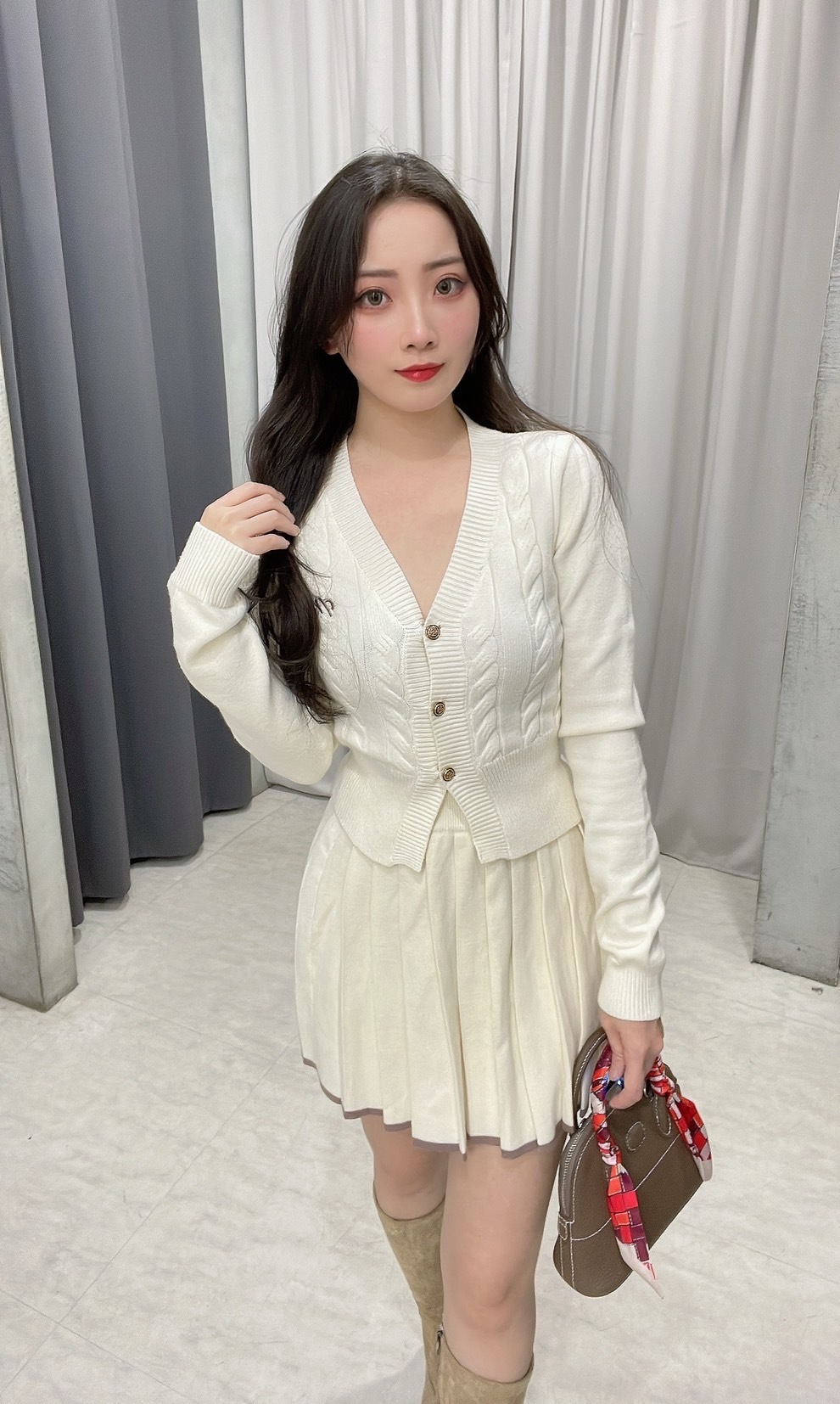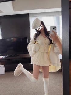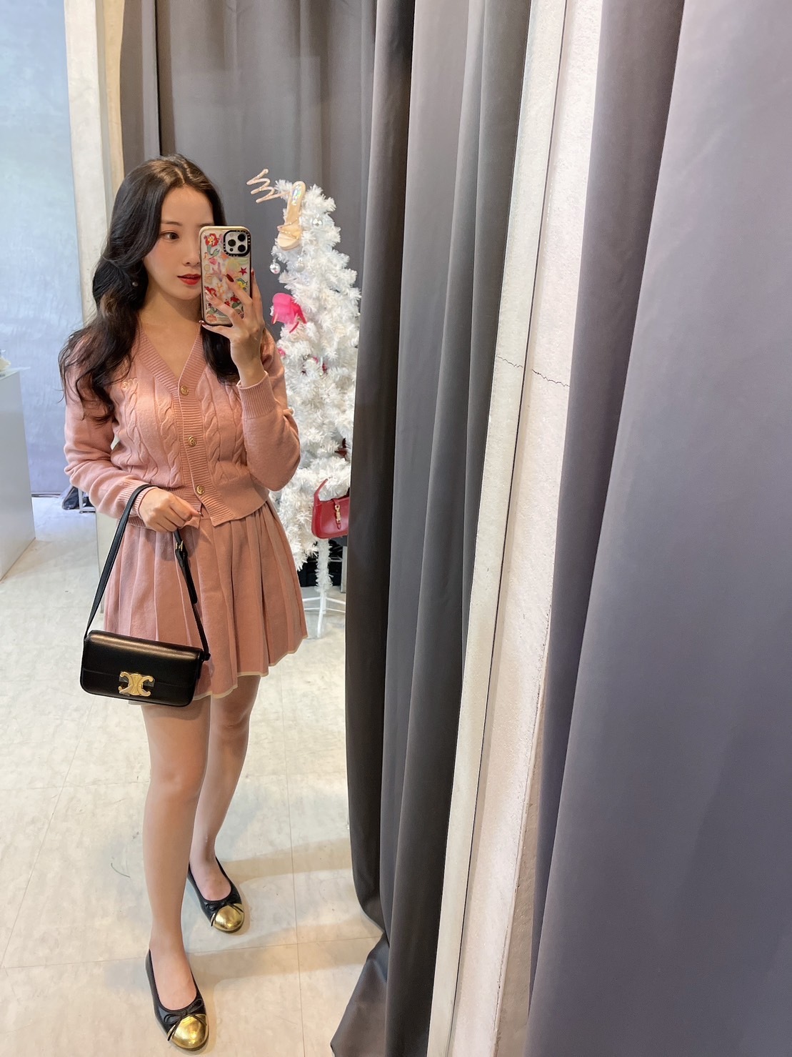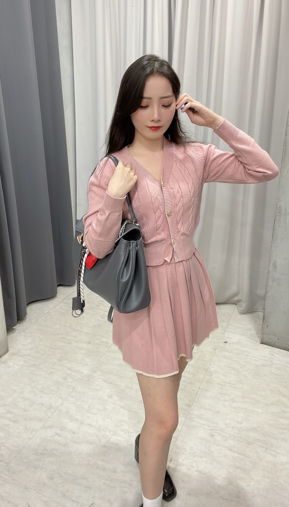 優雅氣質感 這件套裝融合了壓褶短裙和針織上衣的經典設計,營造出俐落又柔美的氣質。
