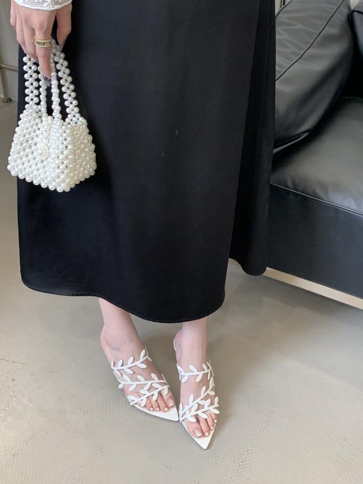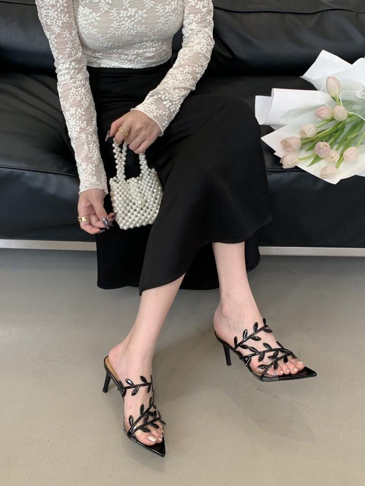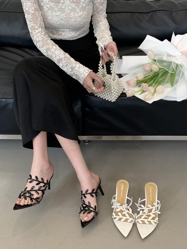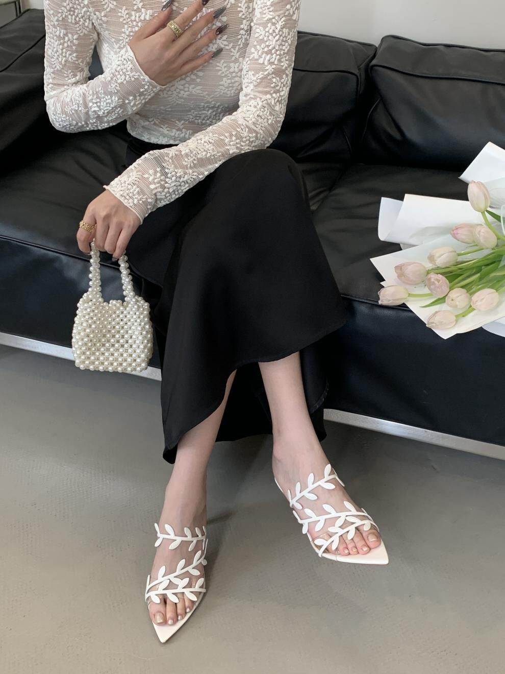 葉子藤蔓尖頭跟拖(35-40)(黑/白)
