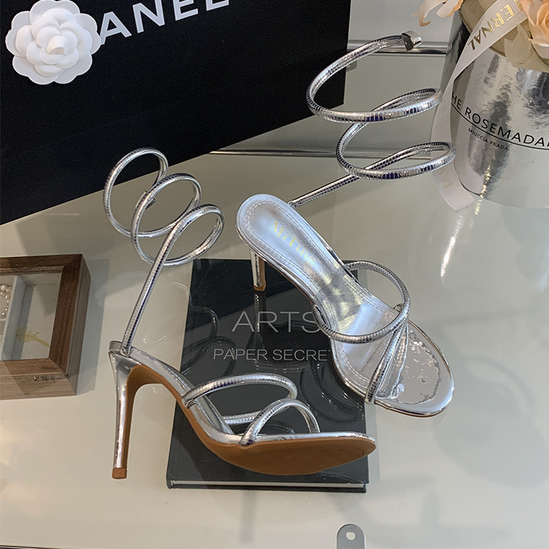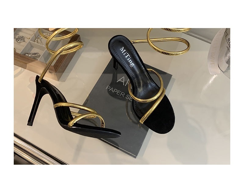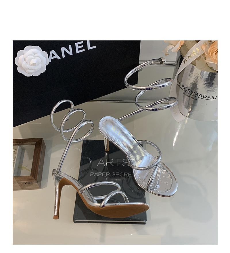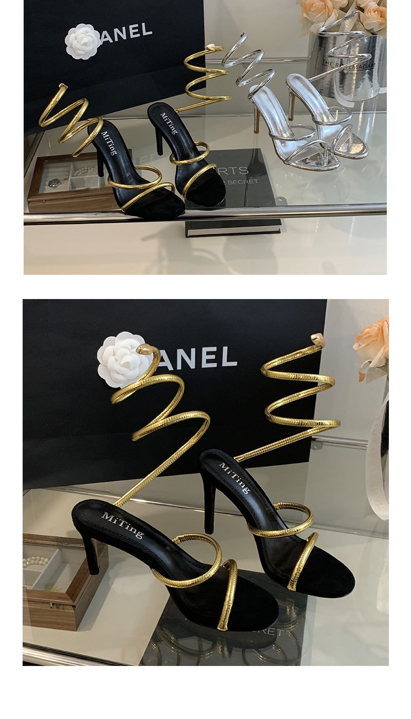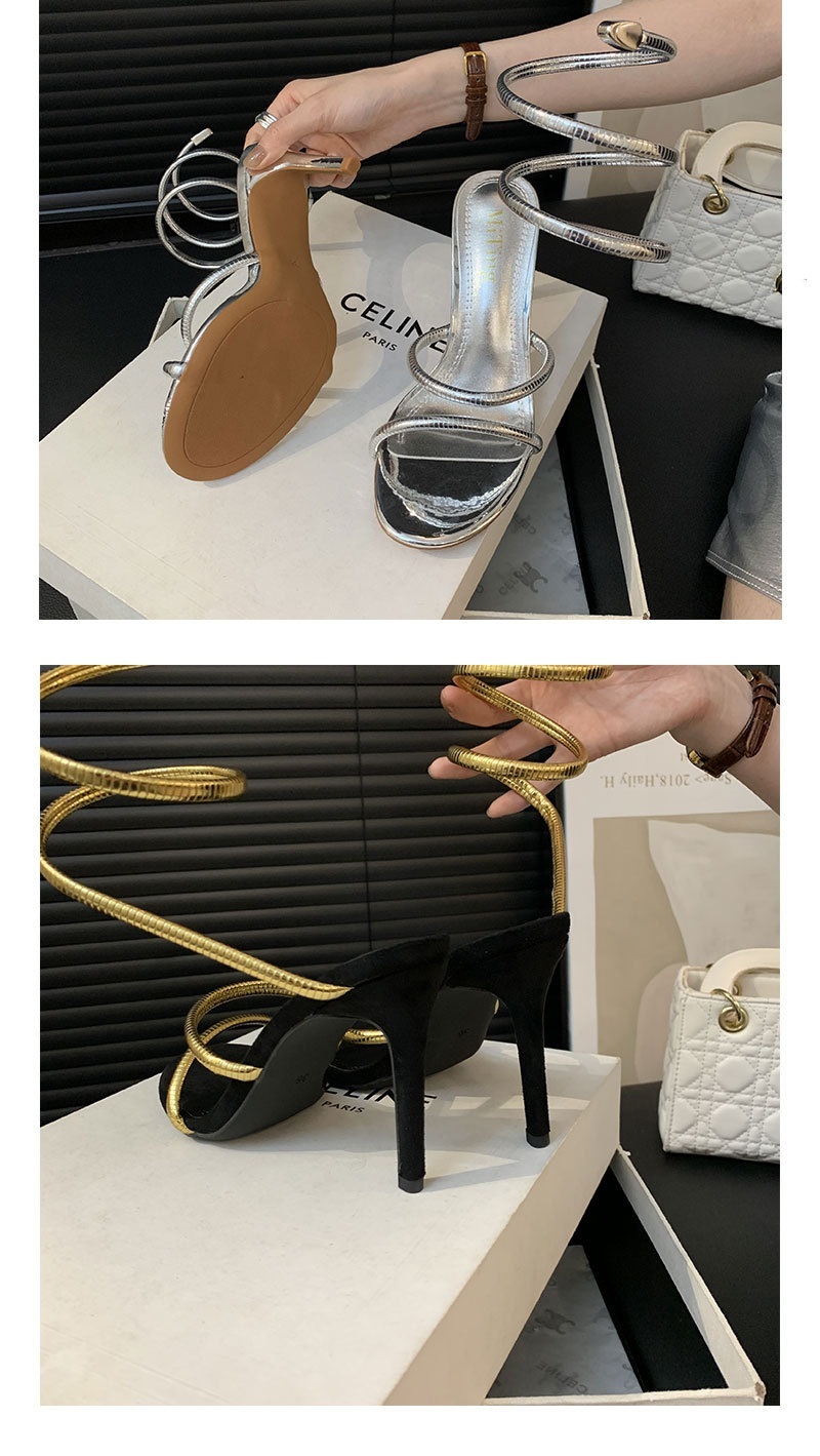 金銀色的蛇型纏繞線條設計,展現簡約優雅的高跟涼鞋風格。細膩的纏繞造型,賦予整體鞋款動感與聳動感。尖頭設計突顯女性優雅氣質,營造時尚大方的穿著感。無論是日常外出或是特殊場合,這款涼鞋都能帶來百搭出眾的造型。