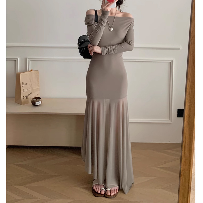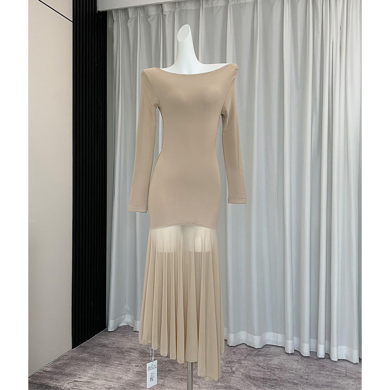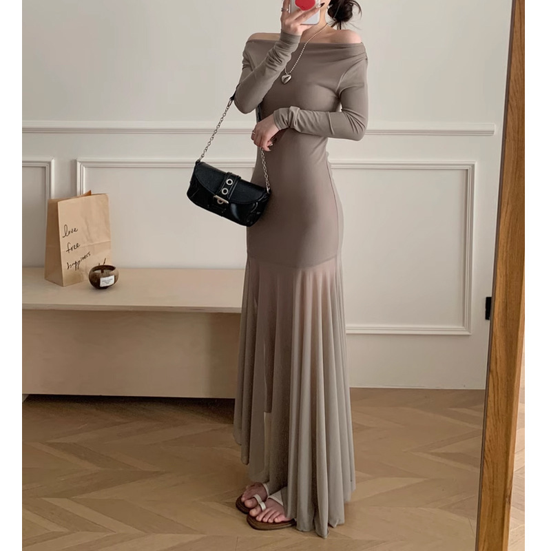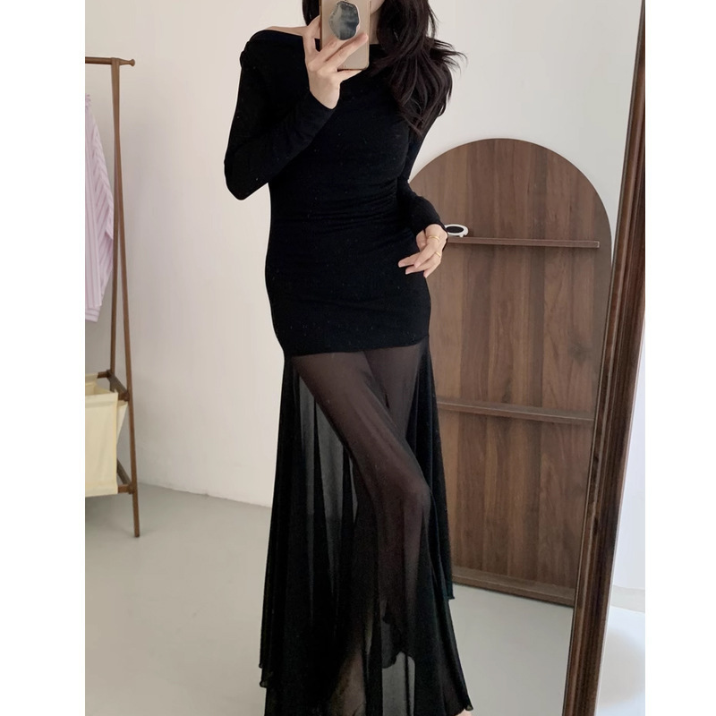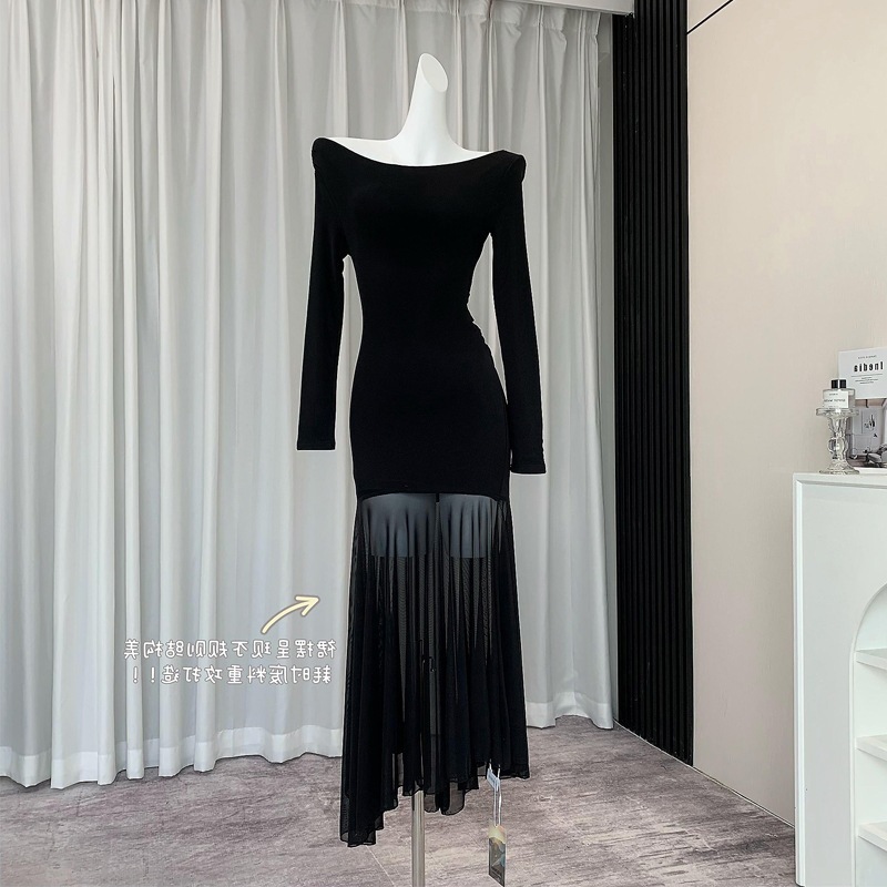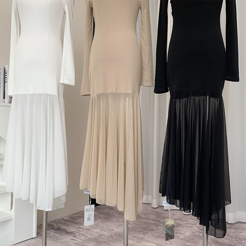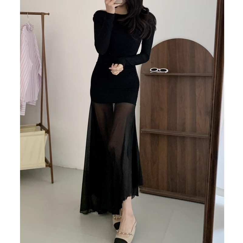 透視裙擺 棉質彈性休閒洋裝(黑/奶茶)