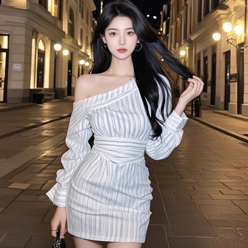 斜肩襯衫收腰洋裝