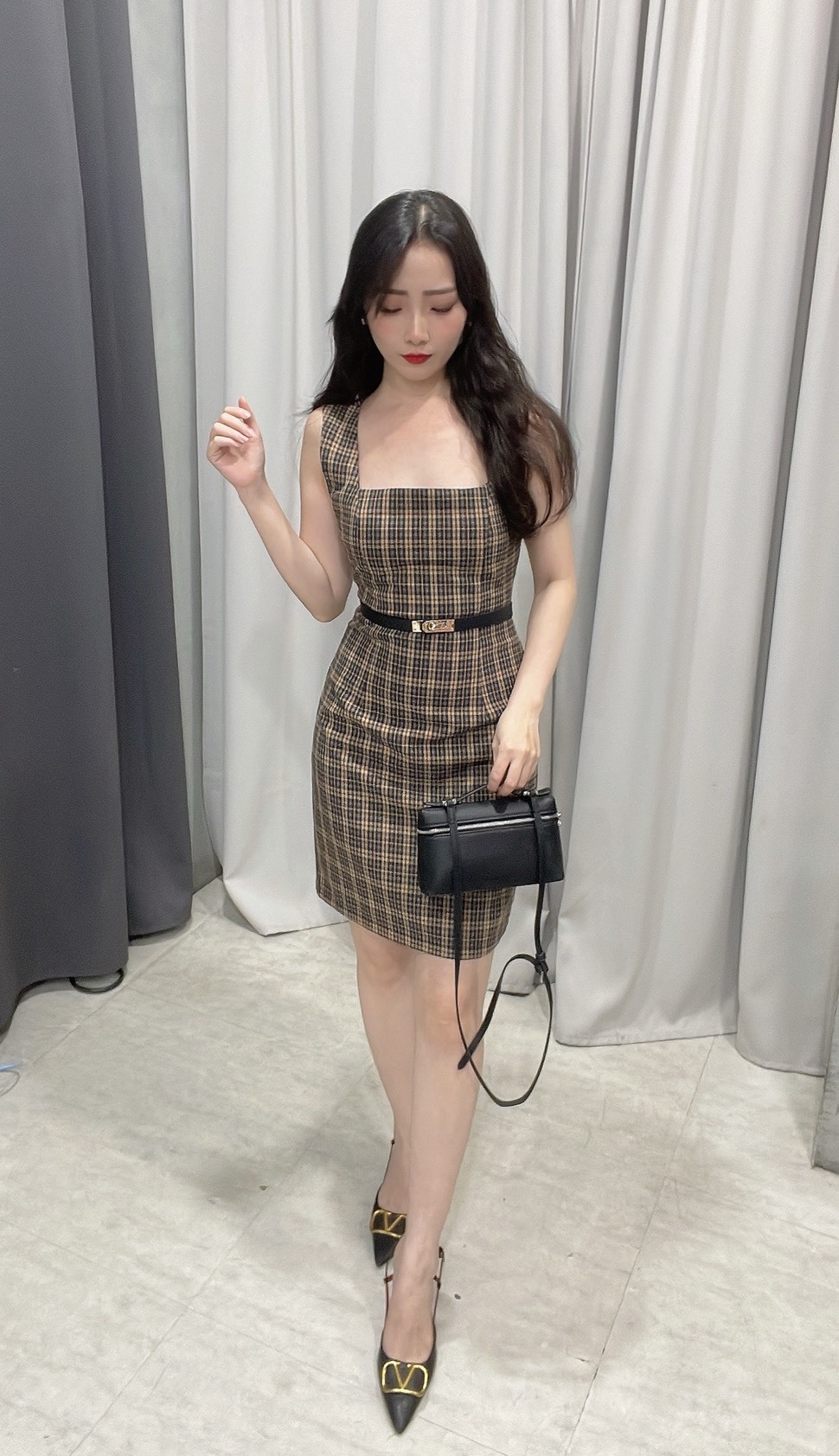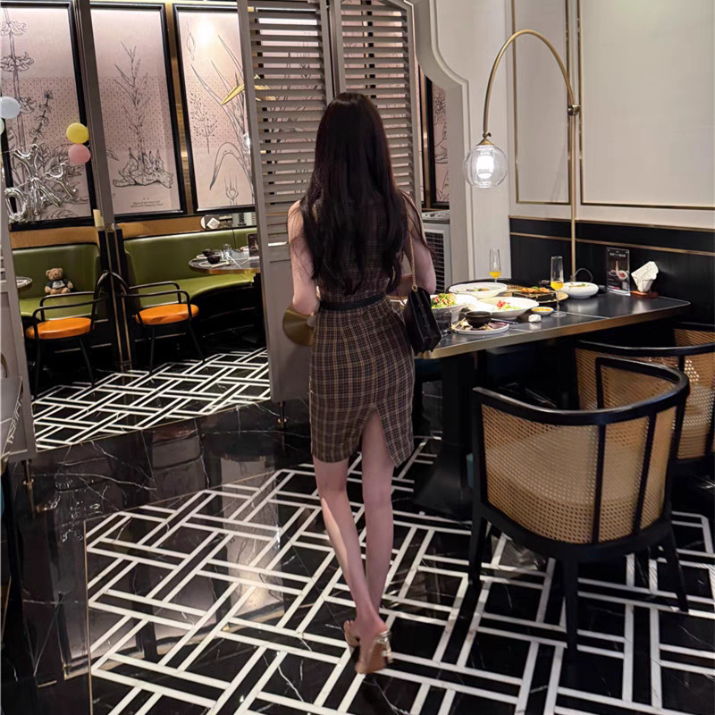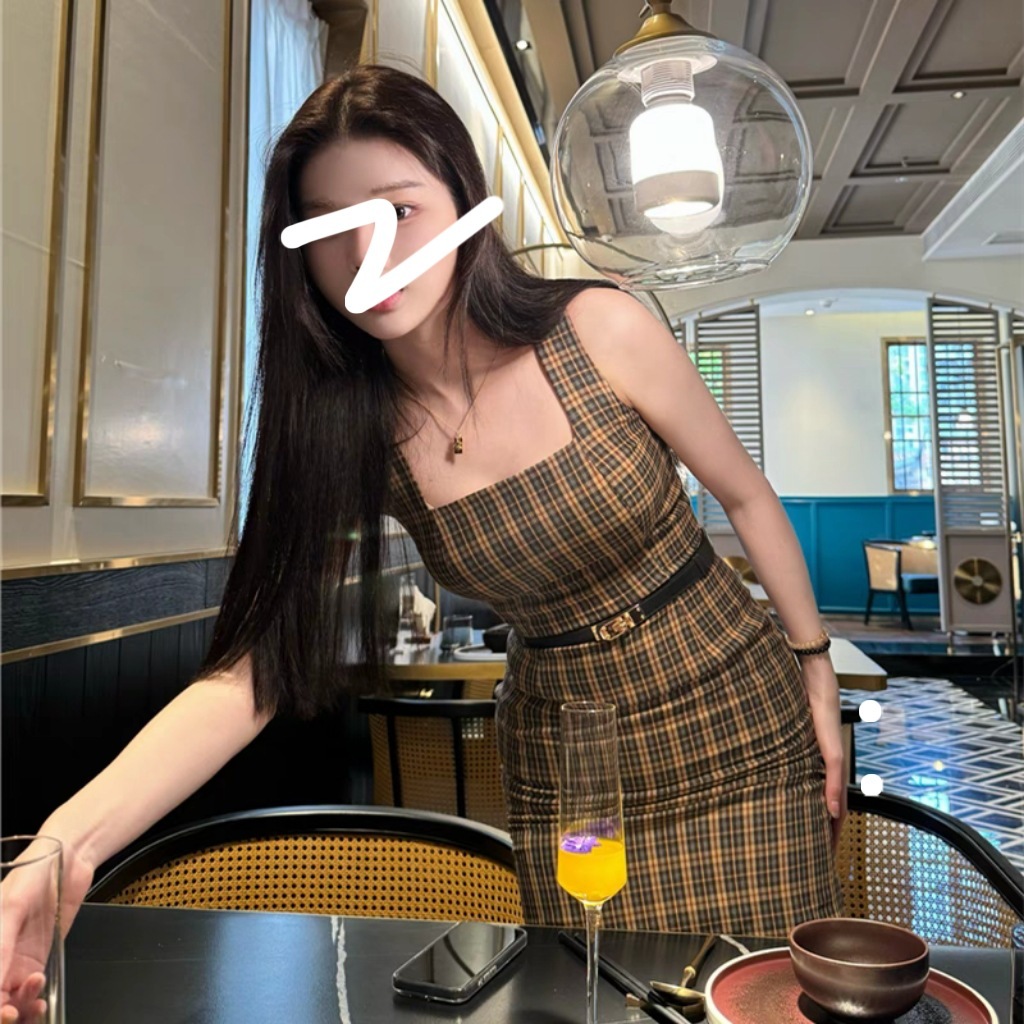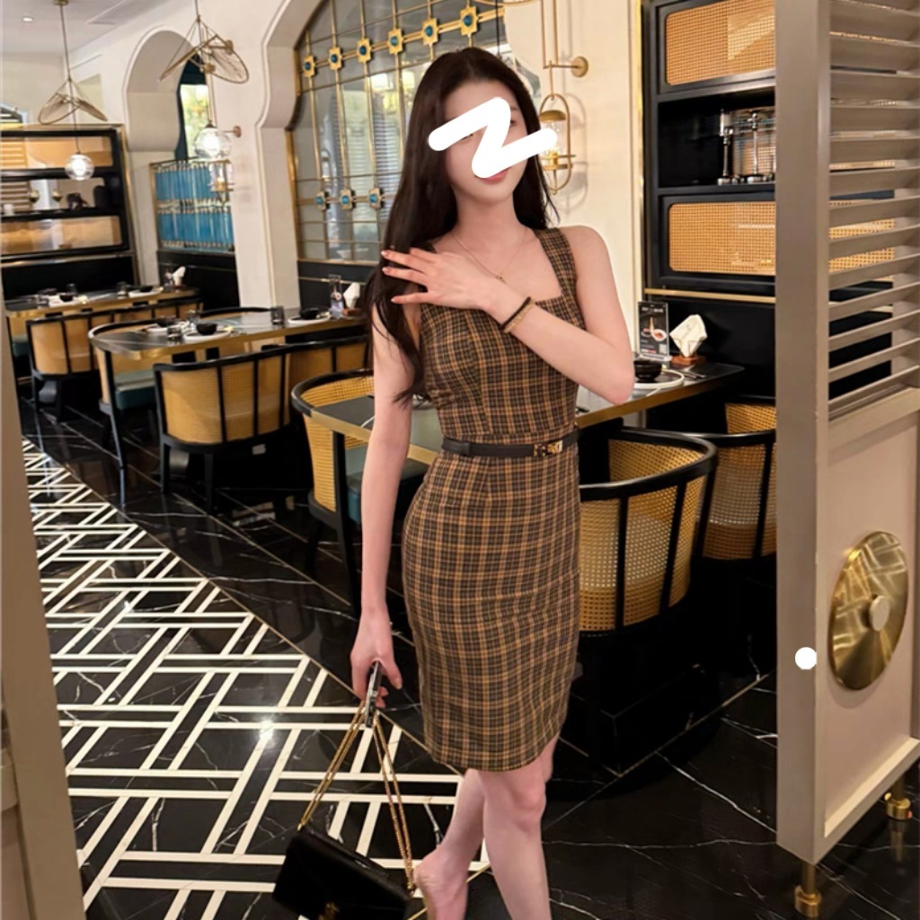 JISOO性感復古 方領貼身格紋洋裝(附腰帶)