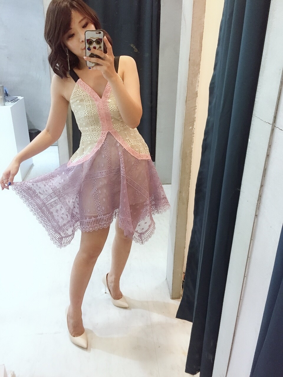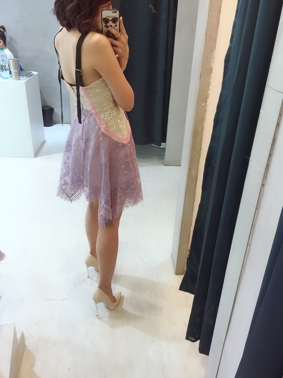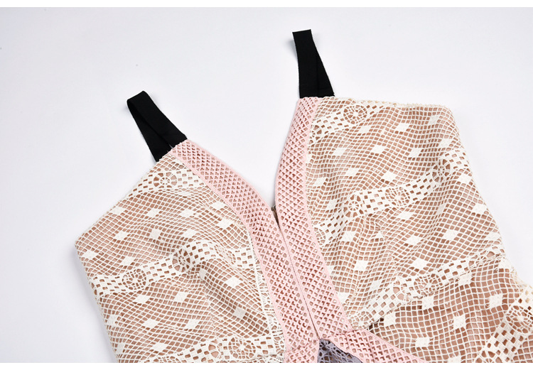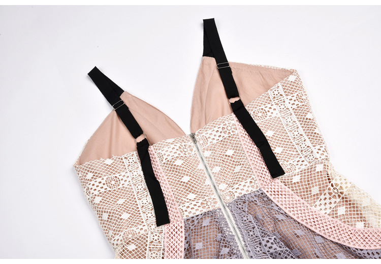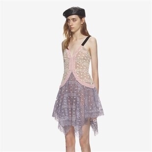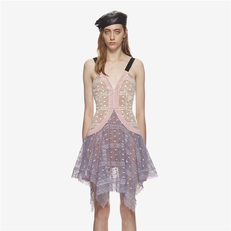 歐美款 V領蕾絲拼接縷空不規則短洋裝