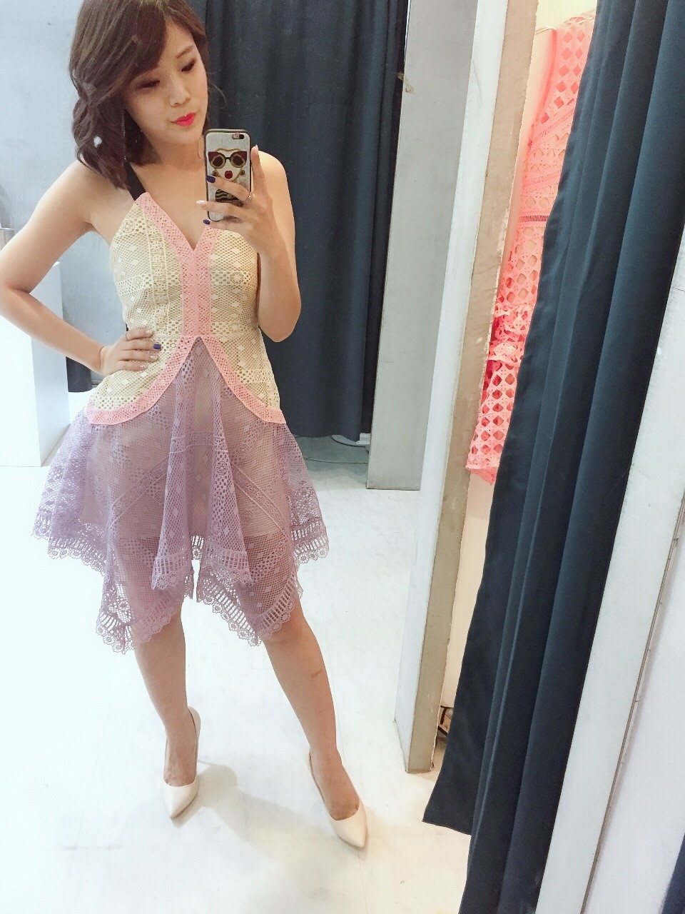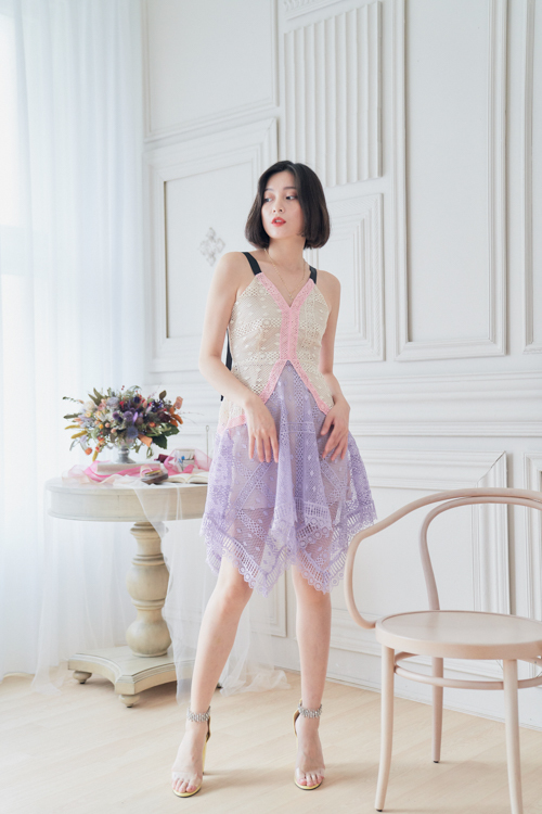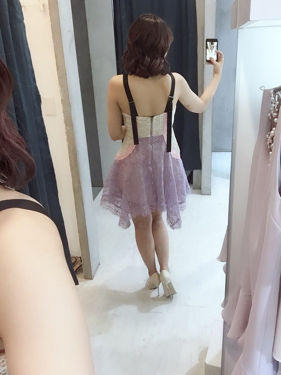 歐美款 V領蕾絲拼接縷空不規則短洋裝